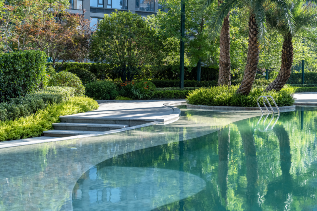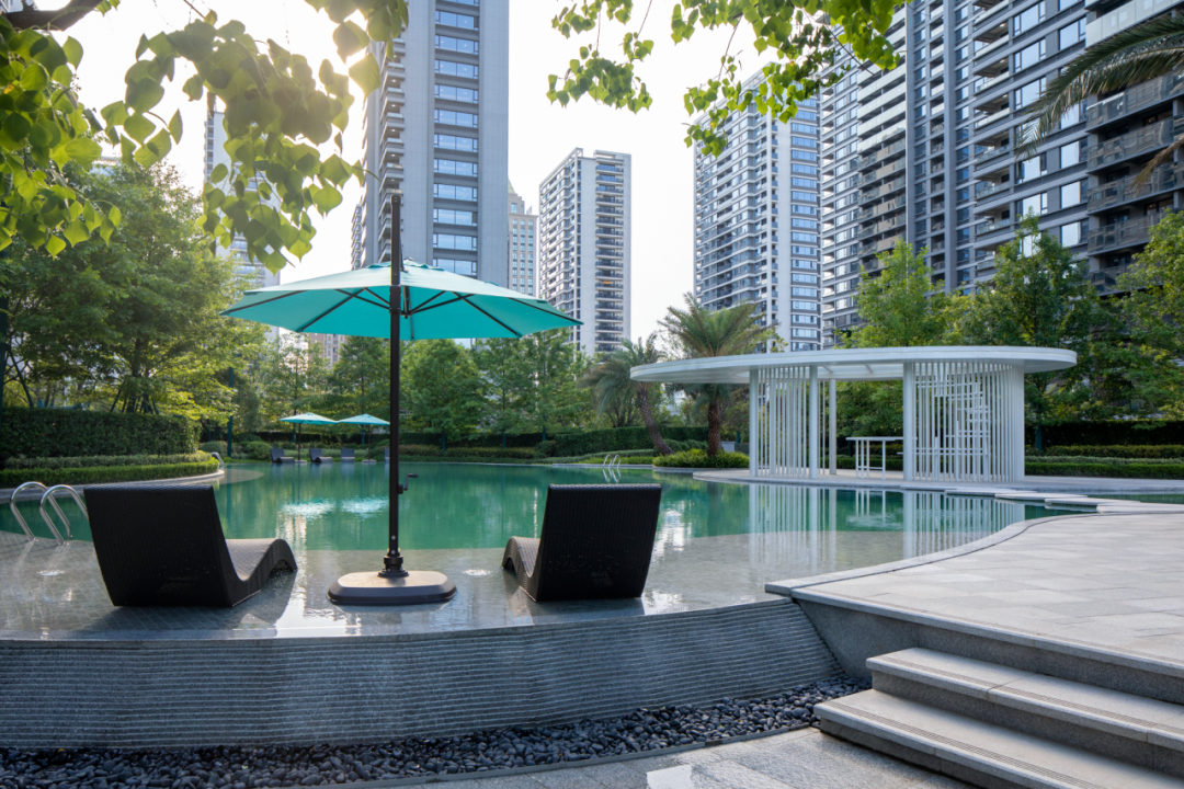无边式泳池,如同在云端般漂浮,绿荫包裹间斑驳的树影、天空、镜水对景叙事之诗。一侧云朵浮亭点缀在旁供人小憩,与参差错落的植物组团互诉衷肠,此时居住与自然的边界逐渐消隐,静谧而美好。