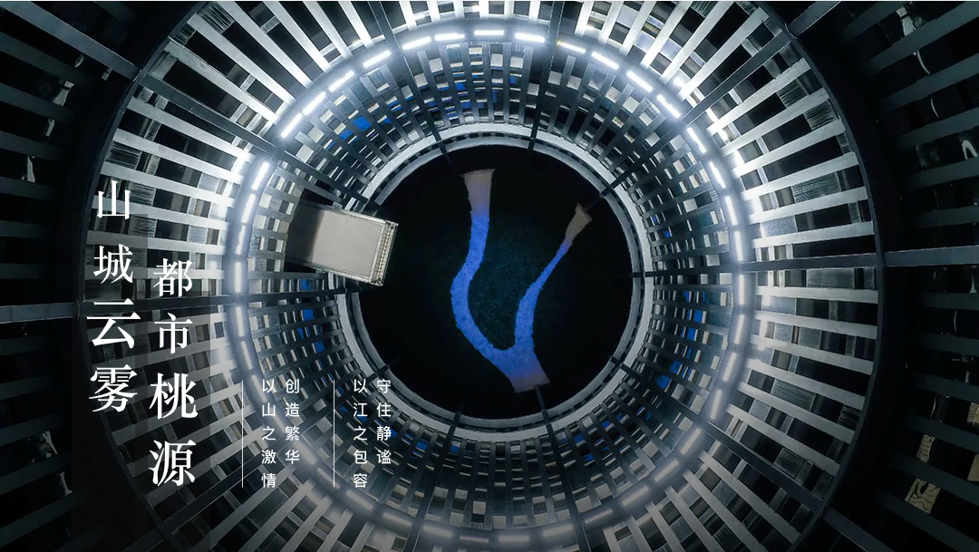 鉴于场地存在高差 设计师利用旋转车道的中空部分 为天銮量身定制高约25米的大型艺境景观雕塑 ——云雾原 它由约889块大小各异的不锈钢块状体构成 从密集到松散 就像重庆的雾一样渐渐氤氲散开 一起勾勒出天銮梦幻的人居浮岛谧境 错综复杂的多面多角度的组合 折射出闪亮的光线 盘旋而上,一副重庆的山水画卷徐徐舒展 立体的空间感在光影变幻之中交错上演 恰恰诠释了8D重庆的魔幻魅力 嘉陵江与长江交汇场景抽象化于底部 水流的方向也与两江的流向一致 云烟氤氲 一时间竟不知云雾是从上方飘散而下 还是云雾从江中腾起 云雾原上两处不同位置的观景平台 一个将人带入圆柱形空间的中间 感受这个巨型的空腔的分量感 另一个将人带入下方 可仰望整个空腔 从花园到云雾原中巨型空腔的空间转换 犹如在梦境和现实中交错 仿佛庄周梦蝶