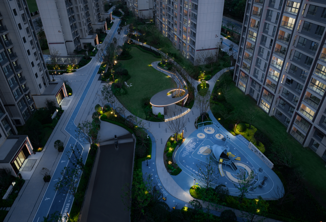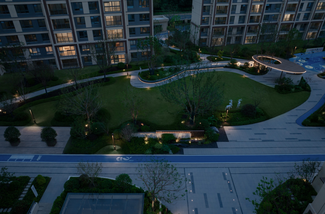 周边优越的景观资源,我们把社区设定为公园的延伸,景观设计结合区位和土地特性,实践自然随性、纯真轻松的生活美学。由五幢高层围合成的不规则形态的核心空间,我们延续公园自然流畅的运笔手法,将开放、聚集、赏玩、游乐的景观功能集约布置,余下留白空间让植物自然随性地生长,带来了更多感知自然的可能。两条曲径,分别以玉兰和紫薇为种植主题,将人们带入归家之路,流畅的曲线延伸了空间的距离,拓展了景观的体验,放慢了匆匆的脚步。