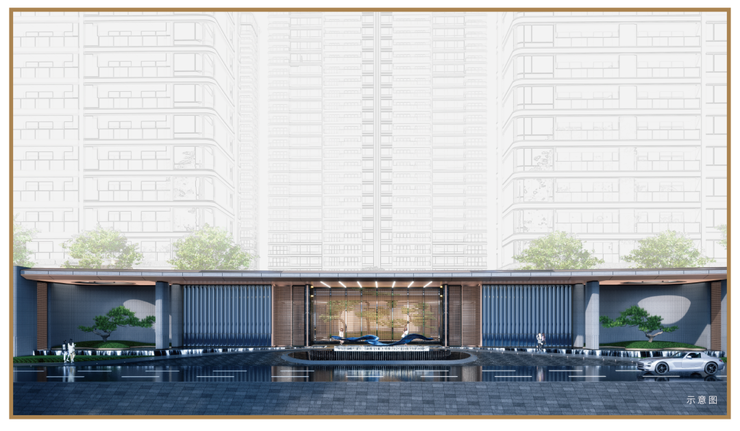 项目参考皇家宫廷轴线布局方式、沿主入口南北向轴线组织楼栋排布。高层住宅错落布置,通过建筑的围合以及景观的造景,围合出城市广场、水院、下沉花园、中央花园等多重庭院空间。