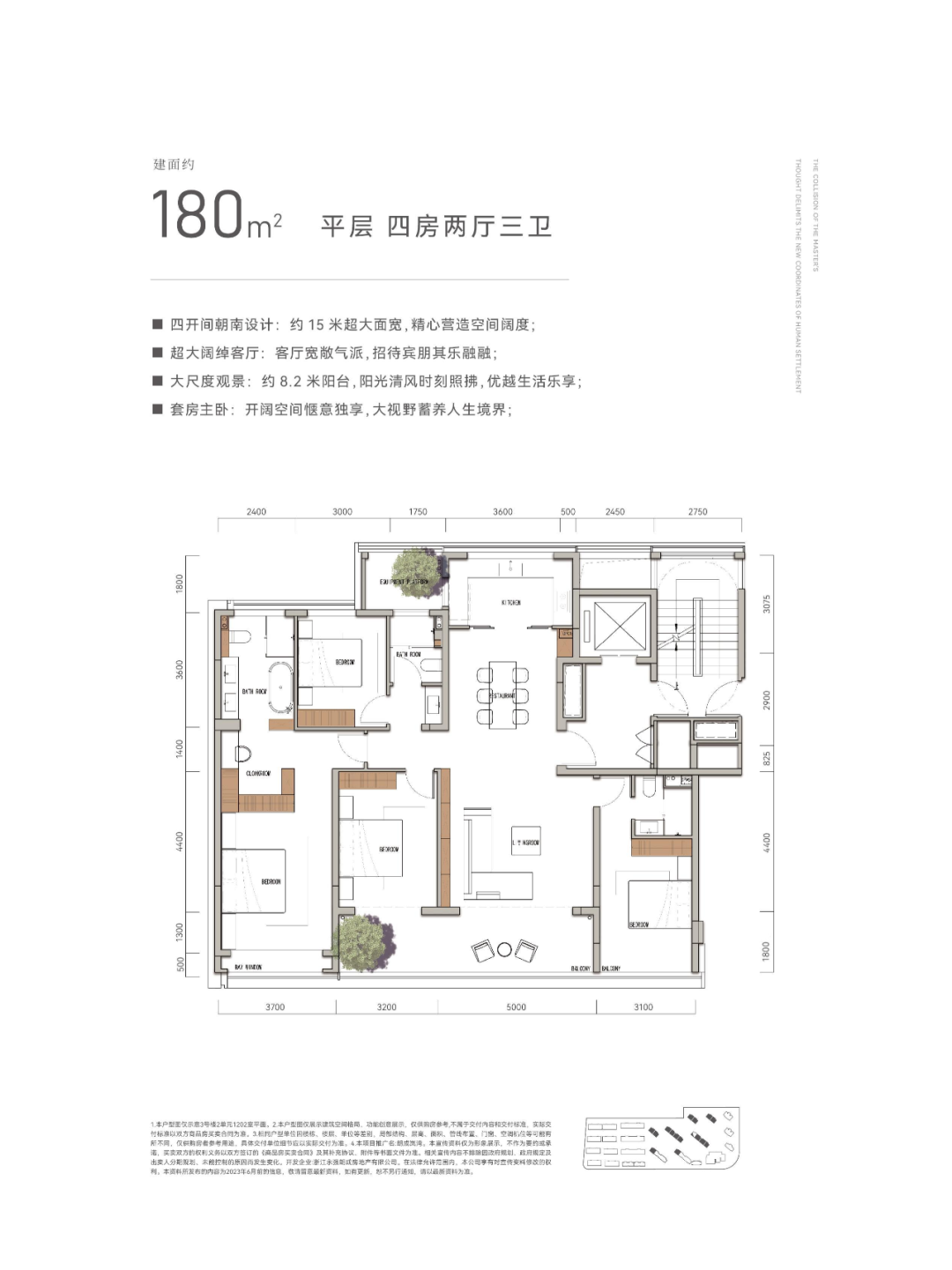 约180㎡天幕平层,将南向面宽做到约15米,其中阳台便占据了大半,达到了约8.2米,LDKG一体化大宽厅,遵循大宅的公区优先原则,结合约3.3米层高,为全家提供舒阔的生活格局。双主卧套房设计让家人同享舒适,足够大的收纳空间,能装得下一年四季的优雅。独立卫浴,将私密与尊崇重新定义。