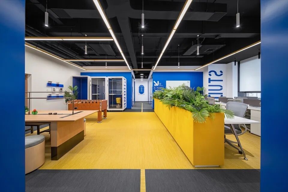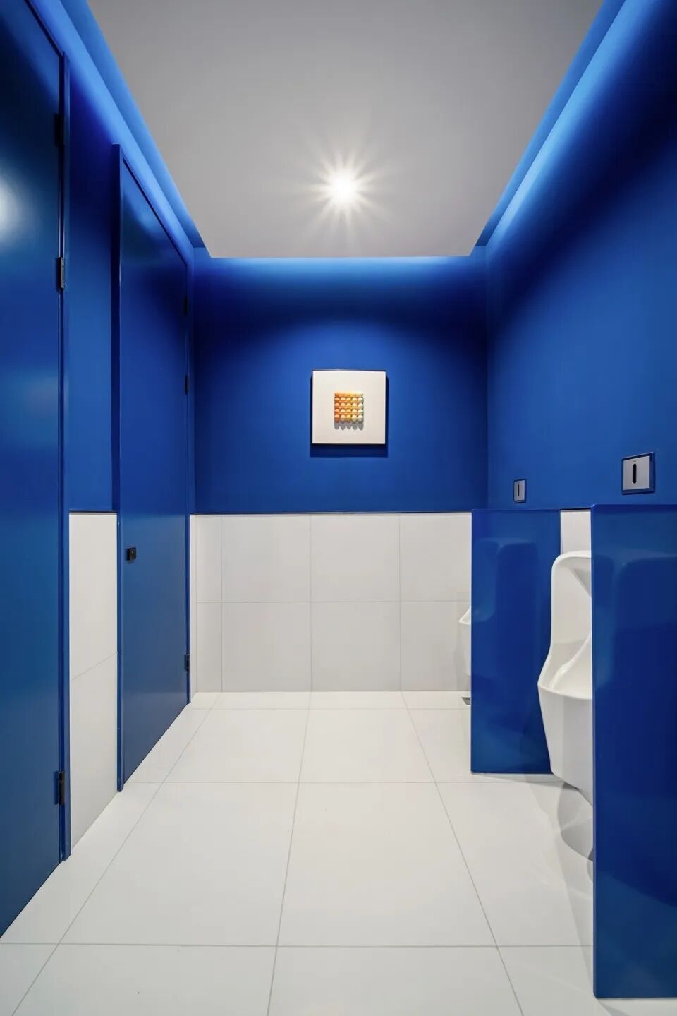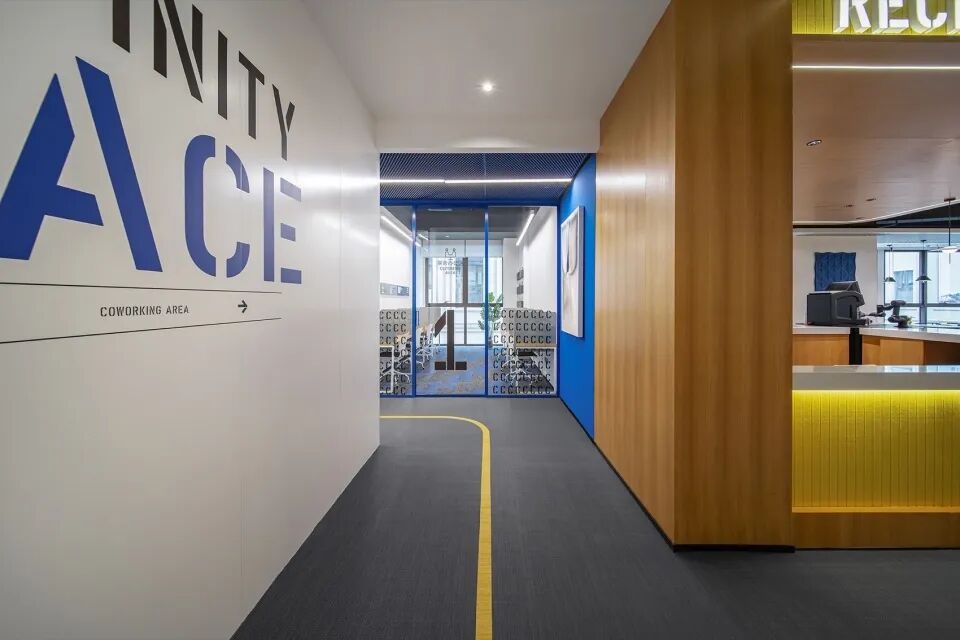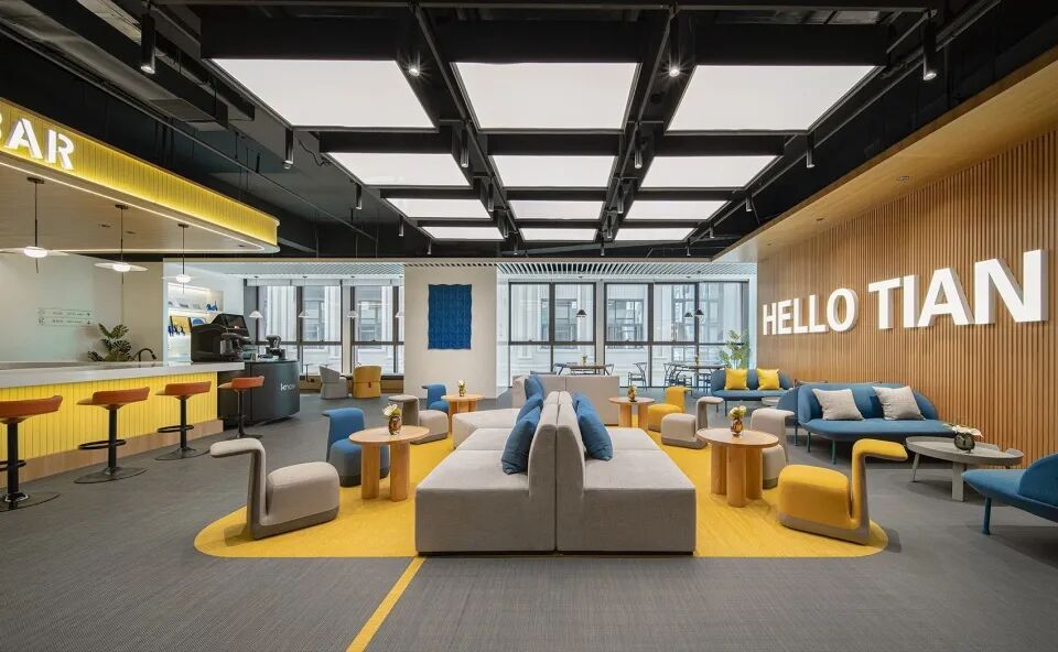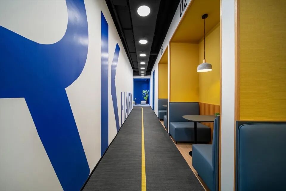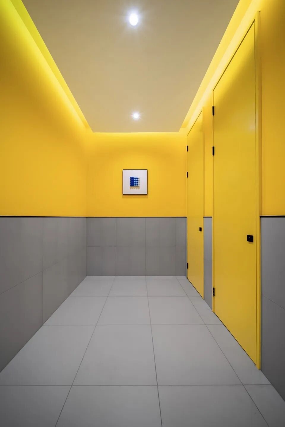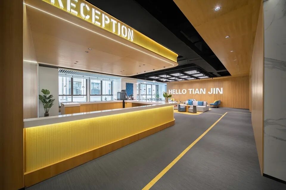作为中国最松弛的城市之一,天津以其网红早点、跳水大爷继续出圈。受中海地产委托,大观建筑为天津中海环宇中心其提供了一个松弛、友好、开放的办公共享空间设计。该项目位于天津市河东区最核心地段,吸引了众多优质客户,为此我们将三层空间整体定位为特色共享办公空间,为整楼所有入驻的客户提供服务。Tianjin takes its credit as one of the most relaxed cities in China and persists in impressing the nation with phenomenal events, which entertain people with popular breakfast and diving masters. Thus commissioned by China Overseas Land & Investment LTD., DAGA Architects tried to deliver a relaxed, vibrant, and open co-working space for our client. The Hedong district’s central location provides this project opportunities by attracting high-end customers and investors. Therefore, Daga has positioned the third floor as a characteristic shared office to provide services for all customers who have selected the building as their inspirational home base.该空间既要有一定的开放与协作的办公空间特征,又要具有咖啡厅一般的松弛氛围,从而为整栋楼的客户提供一个更具参与感的、更高效的活力办公环境。设计以明亮的色彩引领空间,运用一根连续的黄色线条将接待空间、路演空间、会议空间、办公空间、运动空间、卫生间等串联整合,模糊各区域的边界,构成富有变化的动态秩序与高效便捷共创协作的流动空间。After a deliberate analysis, Daga considered this space demands essences not only open but collaborative. We promoted a relaxed atmosphere like a Cafe, to provide a more participatory and efficient dynamic office environment for users. The design leads the space to a bright colour tone, utilizing a yellow line with continuity to connect and integrate areas including reception, roadshow, conference, office, sports, bathroom, etc. Aiming to blur the boundaries of each area, the design forged a dynamic order with changes. An efficient, convenient, and collaborative flow space is created.▼接待吧台连同水吧台一体化设计,并植入智能咖啡机器人,为整个空间提供更智能而充满趣味的服务场景,The reception is connected to the water bar, embedded with an intelligent coffee robot, providing a more technological and interesting experience ▼自由而松弛的接待与会客空间,Free and relaxed reception and visitor space ▼在地面的编织地毯中嵌入黄色的连接线串联不同功能空间,实现表示引导与视觉效果的合二为一,Embed yellow continues lines in the PVC carpet to connect different functional spaces, achieving the integration of guidance and visual effects ▼办公空间用蓝色玻璃隔断划分出封闭办公室,玻璃上的标识区分不同房间,阵列排布的字母的保护隐私的同时也保证了空间的通透性,The office space is divided into diverse enclosed offices by blue glass partitions, and the markings on the glass distinguish different rooms. The letters arranged in an array protect privacy while also ensuring the transparency of the space ▼开放办公区用黄色编织地毯限定空间边界,黄色的地面与蓝色的墙面共同营造松弛而又充满趣味的办公氛围,The open office area is bounded by yellow PVC carpets, and the yellow floor and blue walls work together to create a relaxed and fun office atmosphere ▼会议区延续松弛的氛围,不同的蓝色材质贯穿会议空间,The conference area continues a relaxed atmosphere, with different blue materials running through the conference space ▼设计充分利用走廊空间设置了开放的讨论区与卡座洽谈区,提供更多更灵活的工作场景,同时在办公区的末端设置了健身站,以满足使用者的多样性需求,The design fully utilizes the corridor space to set up open discussion areas and card seat negotiation areas, providing more flexible work scenarios. At the same time, a fitness station is set up at the end of the office area to meet the diverse needs of users ▼延续黄蓝色调的卫生间,The bathroom continues in yellow and blue tones