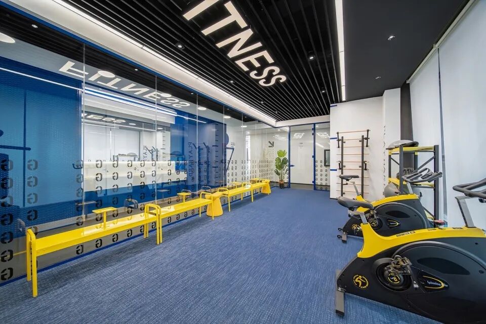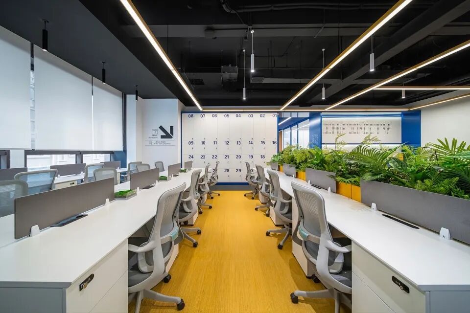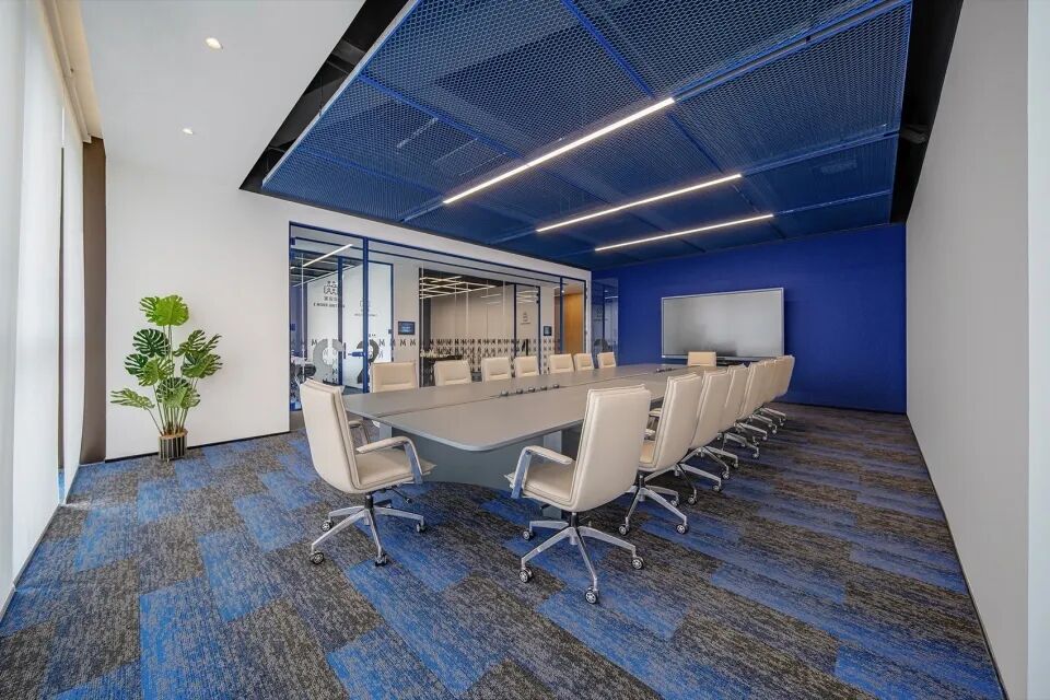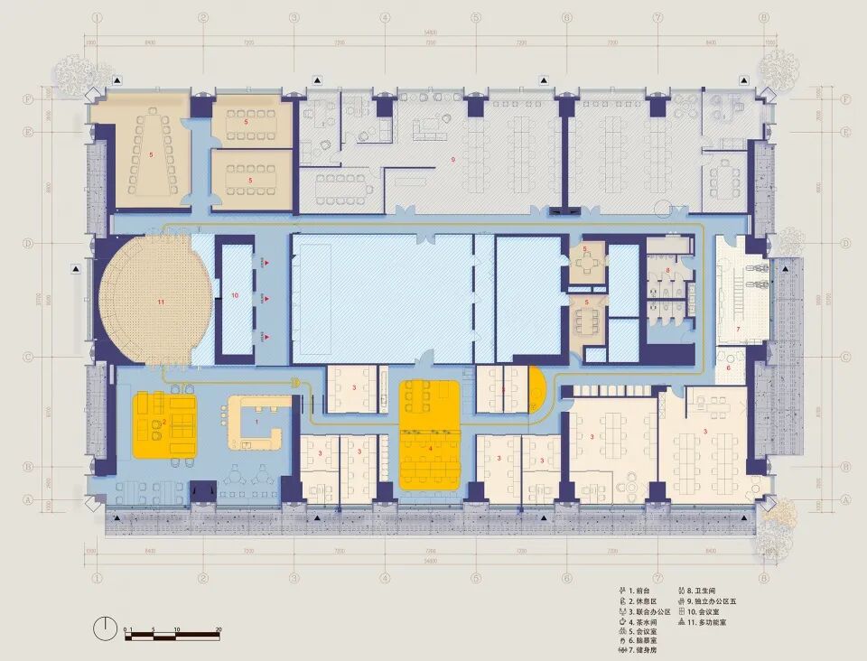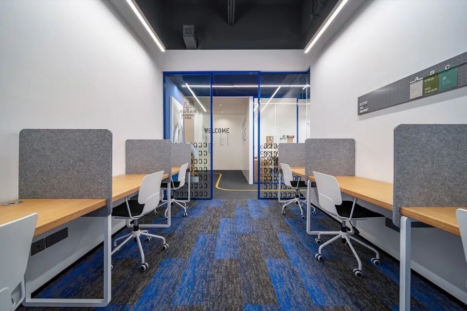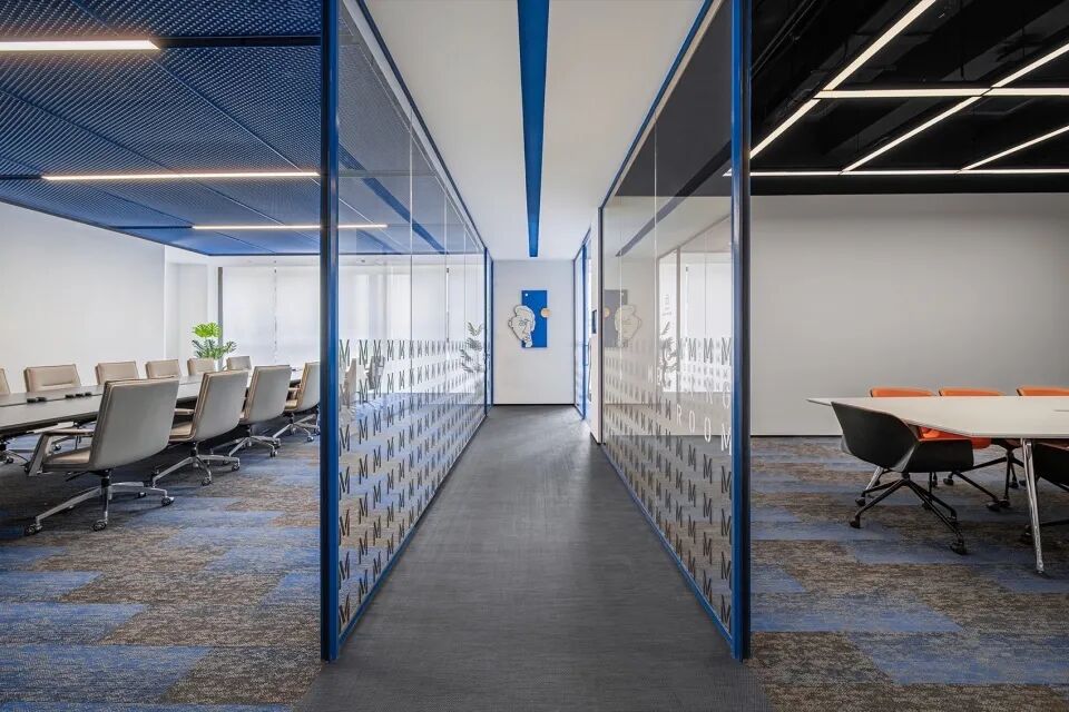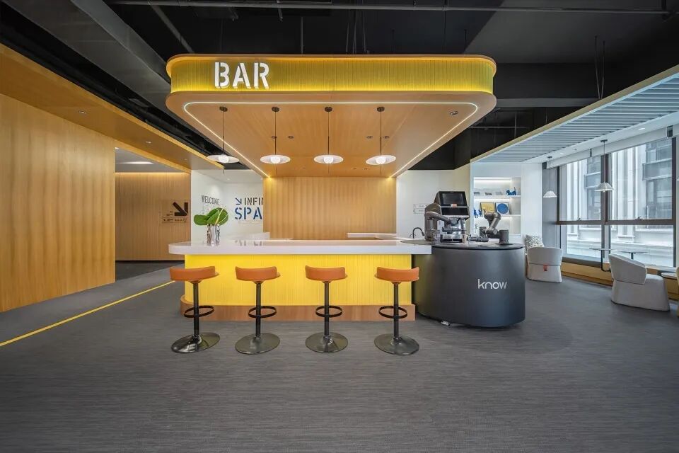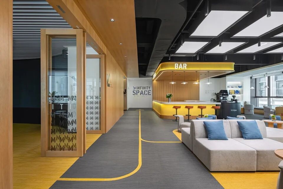 作为中国最松弛的城市之一,天津以其网红早点、跳水大爷继续出圈。受中海地产委托,大观建筑为天津中海环宇中心其提供了一个松弛、友好、开放的办公共享空间设计。该项目位于天津市河东区最核心地段,吸引了众多优质客户,为此我们将三层空间整体定位为特色共享办公空间,为整楼所有入驻的客户提供服务。Tianjin takes its credit as one of the most relaxed cities in China and persists in impressing the nation with phenomenal events, which entertain people with popular breakfast and diving masters. Thus commissioned by China Overseas Land & Investment LTD., DAGA Architects tried to deliver a relaxed, vibrant, and open co-working space for our client. The Hedong district’s central location provides this project opportunities by attracting high-end customers and investors. Therefore, Daga has positioned the third floor as a characteristic shared office to provide services for all customers who have selected the building as their inspirational home base.该空间既要有一定的开放与协作的办公空间特征,又要具有咖啡厅一般的松弛氛围,从而为整栋楼的客户提供一个更具参与感的、更高效的活力办公环境。设计以明亮的色彩引领空间,运用一根连续的黄色线条将接待空间、路演空间、会议空间、办公空间、运动空间、卫生间等串联整合,模糊各区域的边界,构成富有变化的动态秩序与高效便捷共创协作的流动空间。After a deliberate analysis, Daga considered this space demands essences not only open but collaborative. We promoted a relaxed atmosphere like a Cafe, to provide a more participatory and efficient dynamic office environment for users. The design leads the space to a bright colour tone, utilizing a yellow line with continuity to connect and integrate areas including reception, roadshow, conference, office, sports, bathroom, etc. Aiming to blur the boundaries of each area, the design forged a dynamic order with changes. An efficient, convenient, and collaborative flow space is created.▼接待吧台连同水吧台一体化设计,并植入智能咖啡机器人,为整个空间提供更智能而充满趣味的服务场景,The reception is connected to the water bar, embedded with an intelligent coffee robot, providing a more technological and interesting experience ▼自由而松弛的接待与会客空间,Free and relaxed reception and visitor space ▼在地面的编织地毯中嵌入黄色的连接线串联不同功能空间,实现表示引导与视觉效果的合二为一,Embed yellow continues lines in the PVC carpet to connect different functional spaces, achieving the integration of guidance and visual effects ▼办公空间用蓝色玻璃隔断划分出封闭办公室,玻璃上的标识区分不同房间,阵列排布的字母的保护隐私的同时也保证了空间的通透性,The office space is divided into diverse enclosed offices by blue glass partitions, and the markings on the glass distinguish different rooms. The letters arranged in an array protect privacy while also ensuring the transparency of the space ▼开放办公区用黄色编织地毯限定空间边界,黄色的地面与蓝色的墙面共同营造松弛而又充满趣味的办公氛围,The open office area is bounded by yellow PVC carpets, and the yellow floor and blue walls work together to create a relaxed and fun office atmosphere ▼会议区延续松弛的氛围,不同的蓝色材质贯穿会议空间,The conference area continues a relaxed atmosphere, with different blue materials running through the conference space ▼设计充分利用走廊空间设置了开放的讨论区与卡座洽谈区,提供更多更灵活的工作场景,同时在办公区的末端设置了健身站,以满足使用者的多样性需求,The design fully utilizes the corridor space to set up open discussion areas and card seat negotiation areas, providing more flexible work scenarios. At the same time, a fitness station is set up at the end of the office area to meet the diverse needs of users ▼延续黄蓝色调的卫生间,The bathroom continues in yellow and blue tones