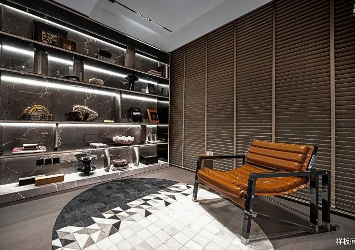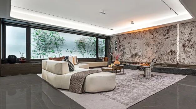 玄关设计兼顾功能与展示,皮革包覆的柜体与艺术对景形成对话,于方寸间奠定空间的精致基调。步入客厅,横向延展的尺度消弭空间边界,落地窗将四时景致纳入框景,天花反弧造型以流线语言呼应宋代建筑“檐角反翘”的轻盈感。居中而立岩板材质背景墙成为视觉锚点,石材纹路晕染出“远山如黛”的朦胧意境,下方壁炉镶嵌蓝翡翠石材,其层叠晕染的黛蓝色彩,将《千里江山图》的墨韵凝练为立体画卷,客厅整体设计通过材质叙事延续文化基因。