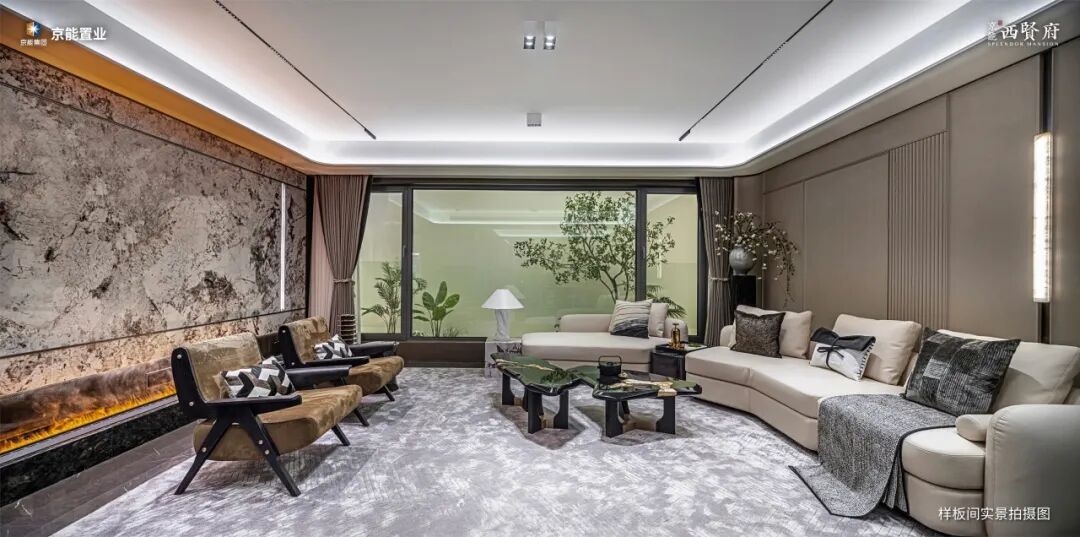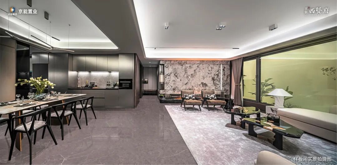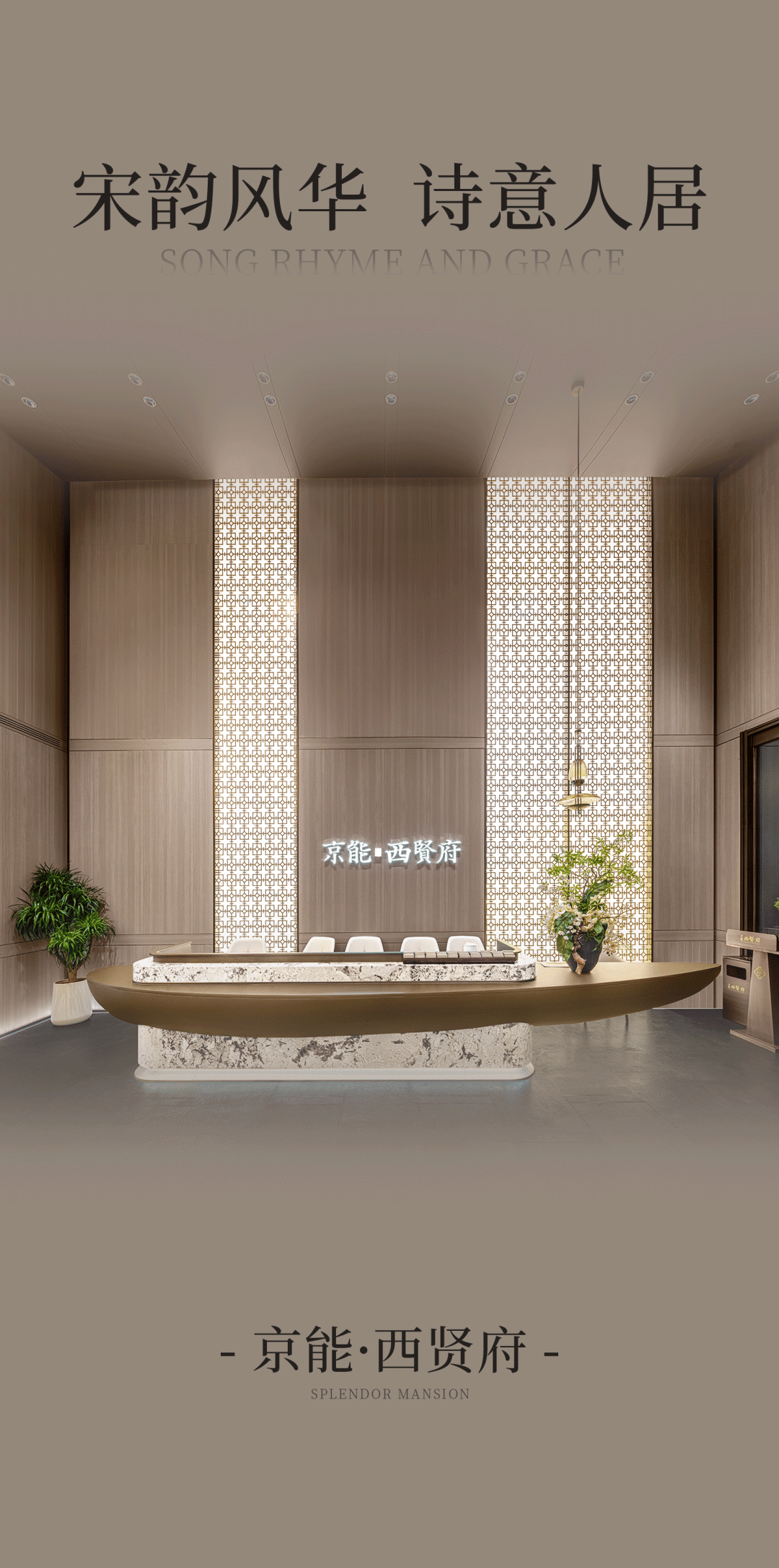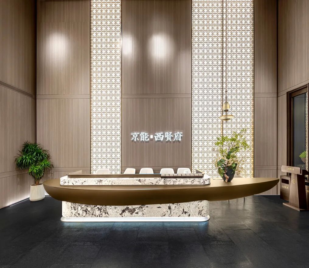 京能·西贤府售楼处空间设计上沿用宋代“格物”精神,考量家具设计的极简与功能性统一,注重自然元素的理性提炼与意境营造,空间布局的系统性思维,材质与光影的运用,色彩体系的克制与雅致。以现代设计手法解构传统元素,再以现代语言重组文化符号,彰显中华美学“简、朴、淡、雅”的持久生命力。
