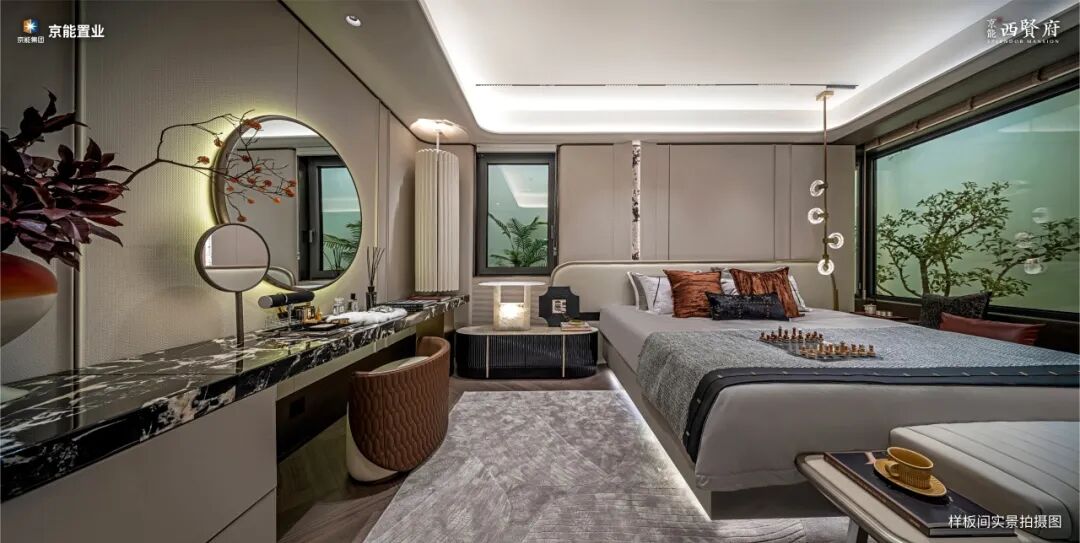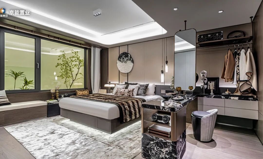 次卧设计采用金属与皮革结合,展现生活品质。整体运用暖调色彩,营造温馨宁静的氛围。主卧宽敞的空间布局让每个角落都得到充分利用,窗台为多功能休闲场所,在这里可以阅读、品酒,享受多样化的生活方式。化妆台与衣柜一体化设计,金属与宝格丽黑石材搭配,展现臻致生活的优雅与格调,为居住者提供一个宁静且充满品质感的休息空间。