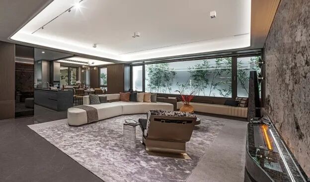 客厅注重大视野与通透感的呈现,同时散发典雅大方的气质。沙发区靠窗,成为理想的阅读与下午茶空间。整体材质以木饰面为主,带来温润自然的触感,金属与石材的点缀则彰显低调奢华与品位。