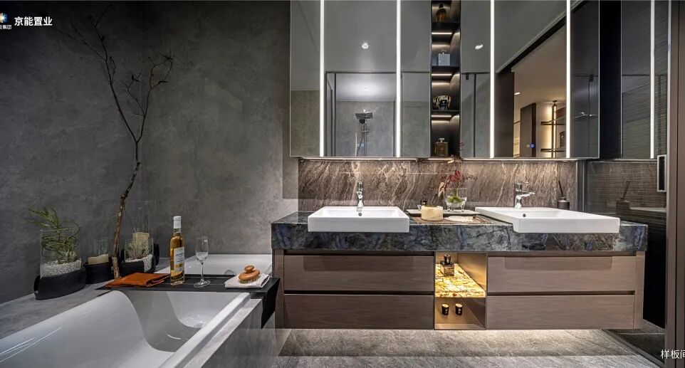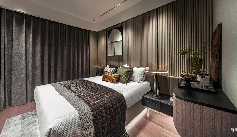 主卧双面景观窗引入自然光景,整面皮革背景墙构筑低调奢华的视觉焦点。水吧梳妆台将日常起居转化为优雅仪式。主卧设置独立卫浴延续空间私密性:双台盆与独立浴缸兼顾实用与仪式感,潘多拉奢石台面与灯光交织,营造酒店式轻奢氛围。柜体系统融合艺术感与模块收纳,在深色木纹与石材的碰撞中,完成现代舒适与东方雅韵的沉浸式放松体验。