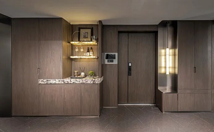 173㎡的边户空间设计融合典雅与贵气,同时注重合理的空间布局,将睡眠区置于南向,保证享受阳光普照,提升舒适感。空间整体材质采用木饰面、皮革,同时点缀金属与奢石,营造出一个舒适而奢华的生活环境。玄关墙体与家政柜一体化设计,巧妙融入智能极控岛,提升入口的现代感与功能性。潘多拉石材与艺术装饰的搭配,营造出如酒店般的奢华居住品质。