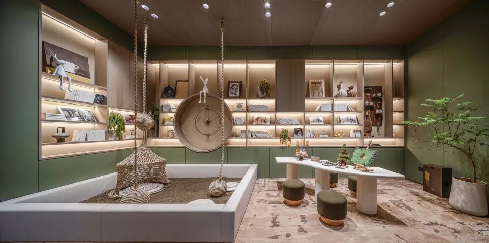 空间划分为浅洽区与深洽区,满足不同需求。浅洽区采用轻盈设计,搭配莫兰迪色系座椅,营造轻松氛围;深洽区选用皮质沙发与格栅,确保私密性。顶部天花的藻井设计融入宋代建筑特点,以简洁线条与对称布局,还原宋代美学。木质结构与柔和灯光交织,营造温暖而富有层次感的氛围,融合传统与现代。VIP室以艺术与私密为核心,打造尊贵雅致的专属空间。屏风结合传统元素与现代设计,保留古典韵味,增添现代艺术感。儿童区设有玩沙区和手作区,以浅绿色为基调,营造自然舒适的成长环境。玩沙区采用环保细沙,激发孩子想象力;手作区配备儿童操作台和绘画材料,打造富有教育意义的互动空间。