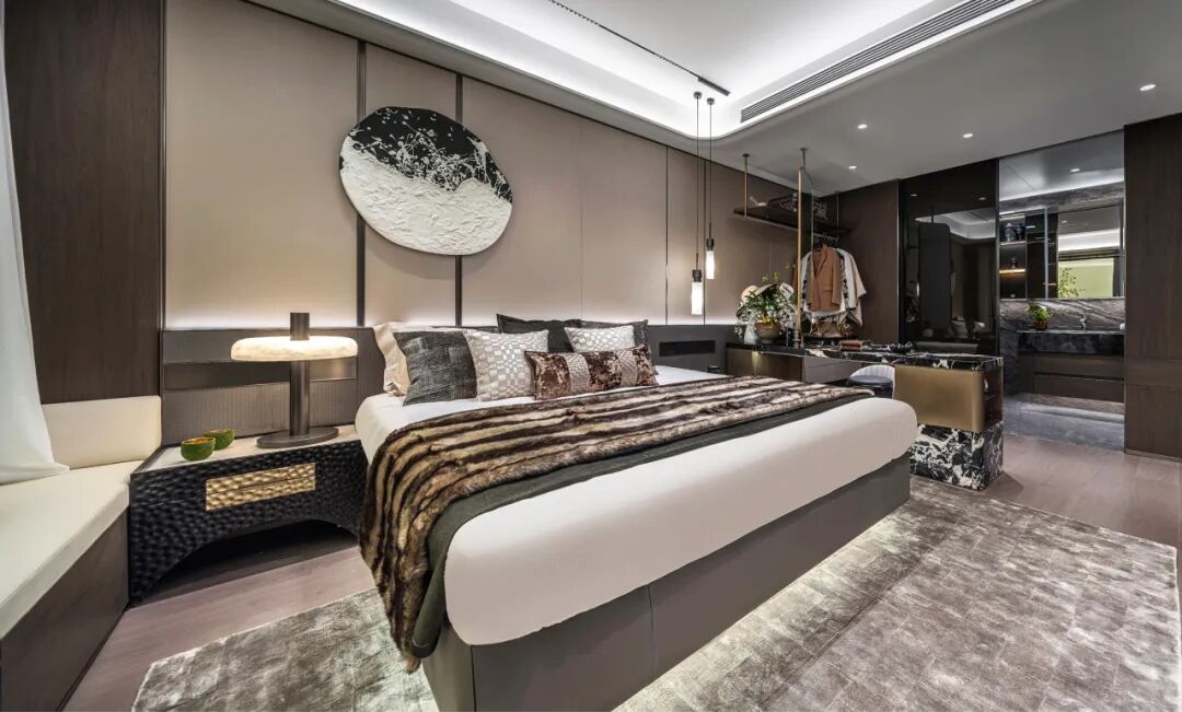 次卧配备定制衣柜和艺术吊灯,功能配置完善。空间材质整体材质为皮革,同时点缀潘多拉石材,增强品质感,床头设置艺术画装饰,打造格调居住空间。沉稳的色彩和柔和的灯光共同营造宁静舒适的休息环境,提供一个放松、安静的私人空间。