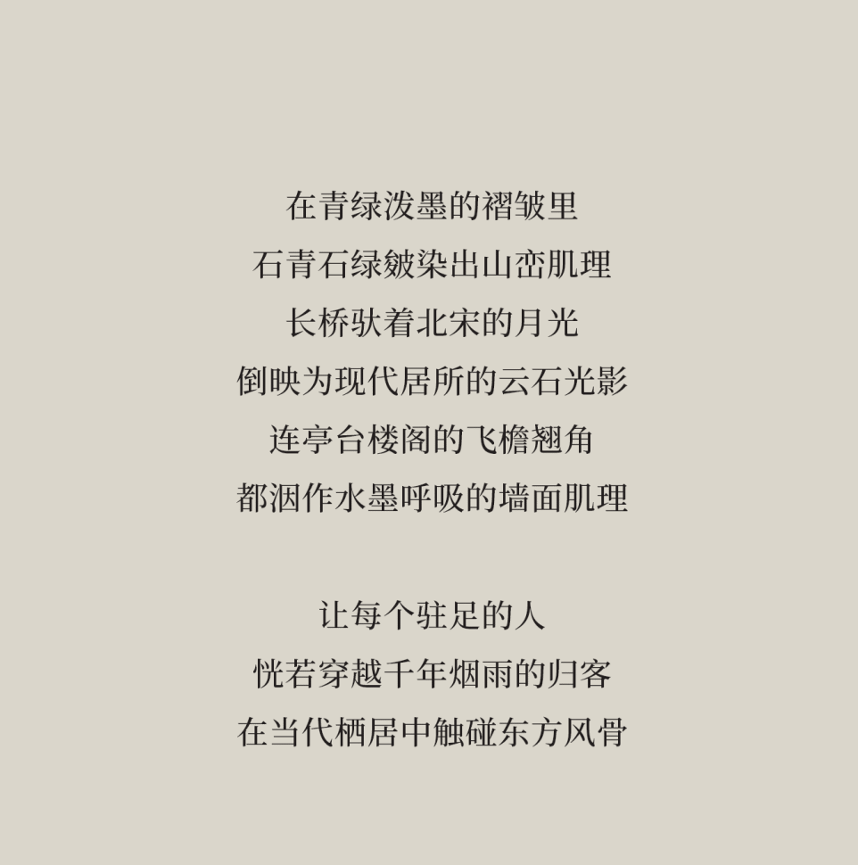 宋代艺术堪称中华文明史上的一颗璀璨明珠,其以"洗尽铅华、骨法洞达"的审美境界,通过水墨丹青的简逸笔触和器物线条的凝练韵律,开创了影响深远的宋式美学范式。京能·西贤府以《千里江山图》的青绿山水为空间底色,撷取宋式园林"借景纳境"的营造智慧,在空间立面的线条中勾勒出移步换景的空间层次,更将宋式色谱融入景观肌理——月白照壁、天青叠石,于虚实掩映间构筑起"不下堂筵,坐穷泉壑"的东方意境。