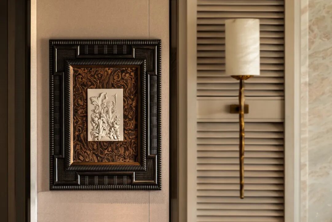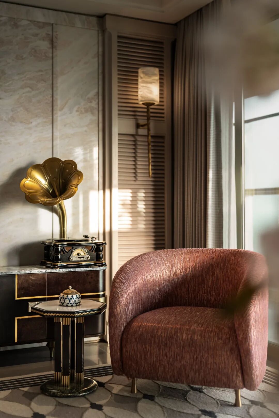 进入休憩场域,海派、矜贵、优雅是设计落笔的关键词。背景墙的设计别具匠心,起伏有序的线条如同大提琴的琴弦,奏响G弦上的咏叹调,给人以触觉上的温暖联想。