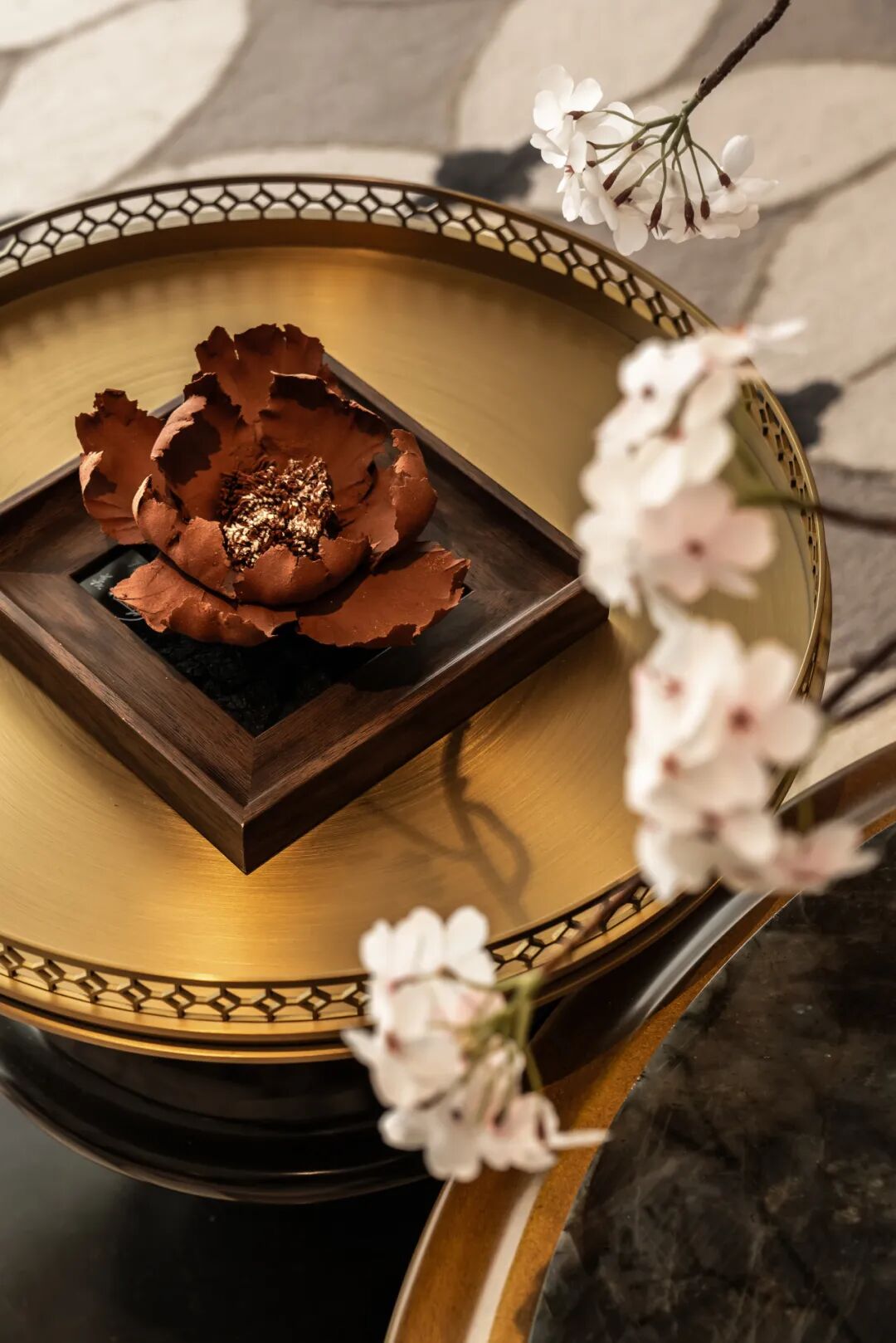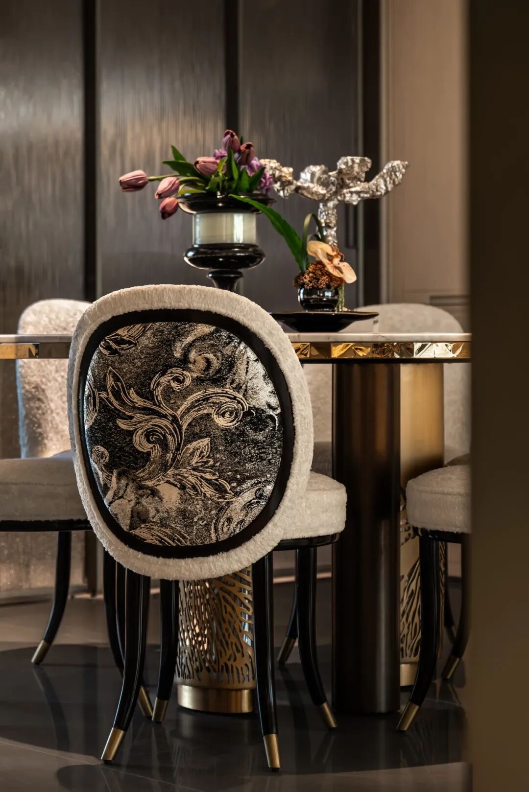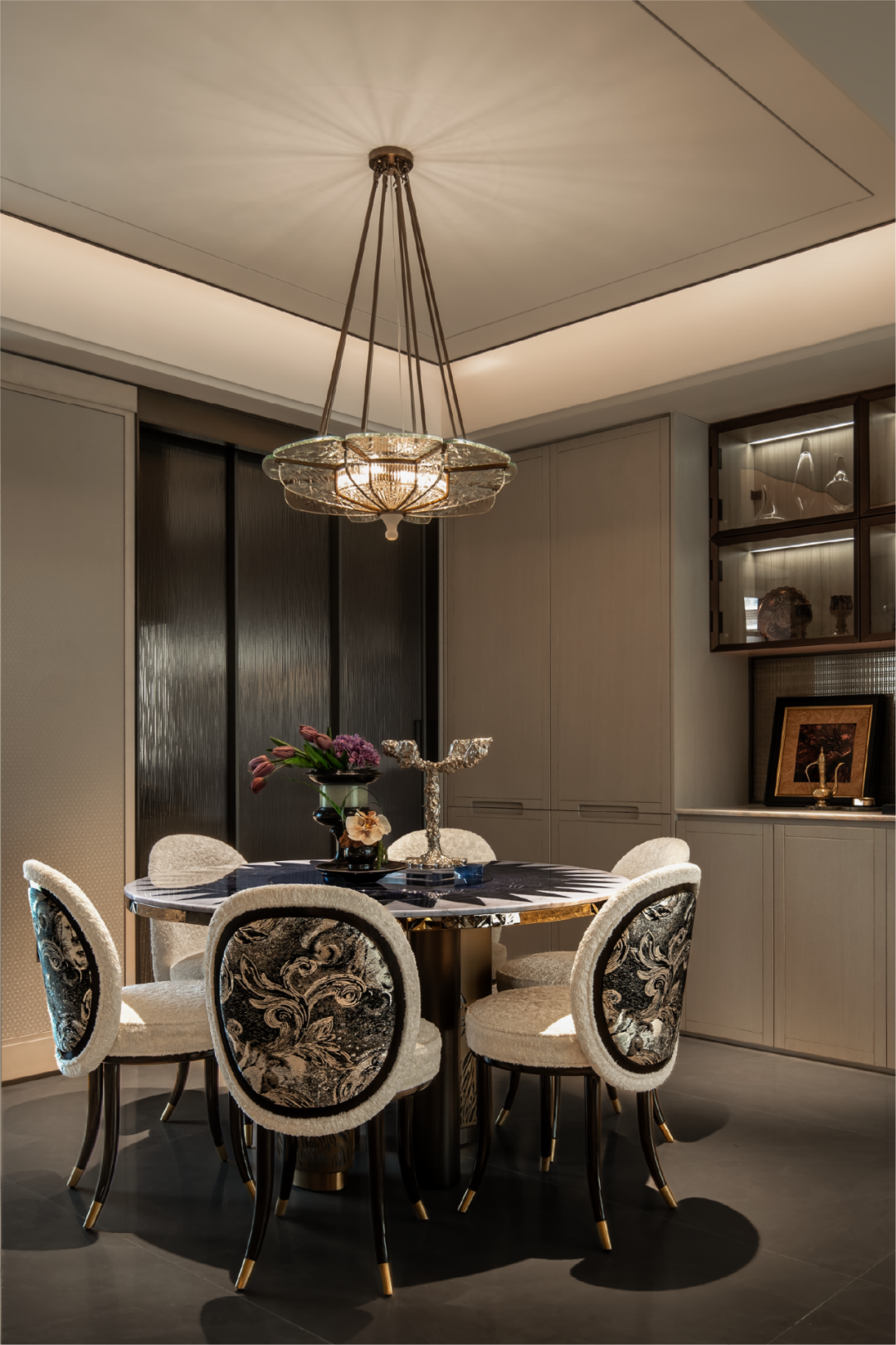 深入空间,餐厅延伸对在地文化的多元解构,凤凰花花瓣穿插制成的艺术雕花玻璃成为空间的视角焦点,刺绣饰面的椅背点缀细节,旨在将仪式感、优雅感和尊崇感融入空间。