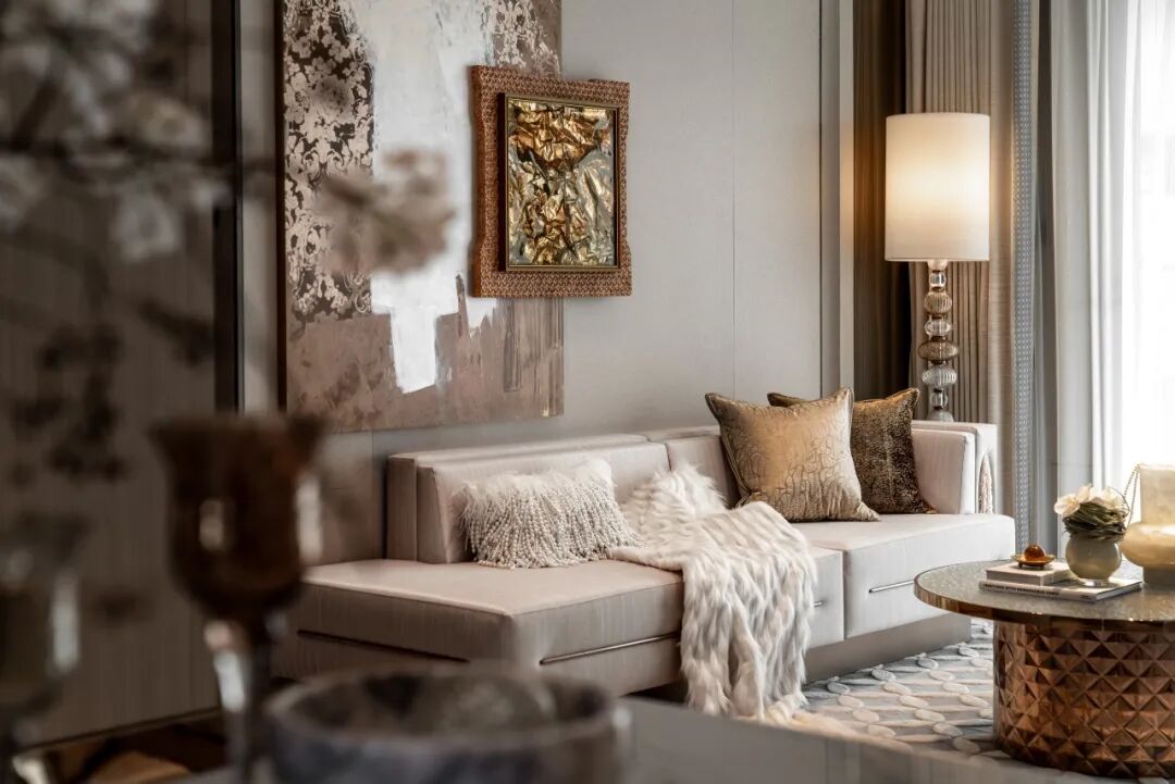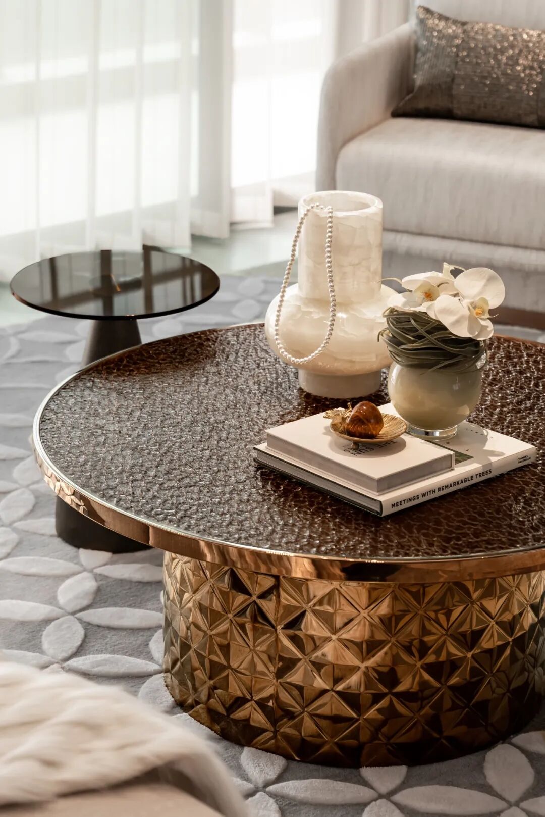 珠光缎面沙发以其内敛而又精致的工艺,细腻地展现出简奢平衡的艺术美学,糅合高级珠宝设计元素与高剪低圈工艺的地毯,承载宜居空间的美学与功能性需求。