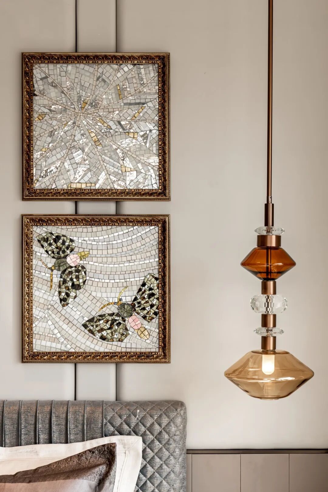 主卧串联开放式衣帽间、精致迷你bar以及主卫,在保留空间独立性的同时,将居者的私人频道调频至松弛的生活模式,沉稳静谧的床品主色调,让居者的身心享受对于安眠空间的本能感知,承载艺术灵感的床头蝴蝶挂画泛出贝母的温润光泽,在晨起暮憩间,体会生活的悠然。