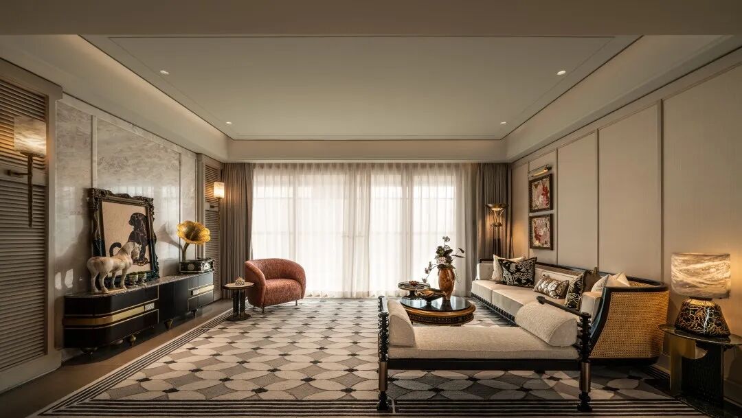复古臻雅的客厅中,空间的陈设布局被精心推敲,海派绒绣质感的单人沙发拓宽对传统经典与当代摩登之间的深入思考,注入广州地域文化元素,探索空间的情绪与舒适的平衡。
