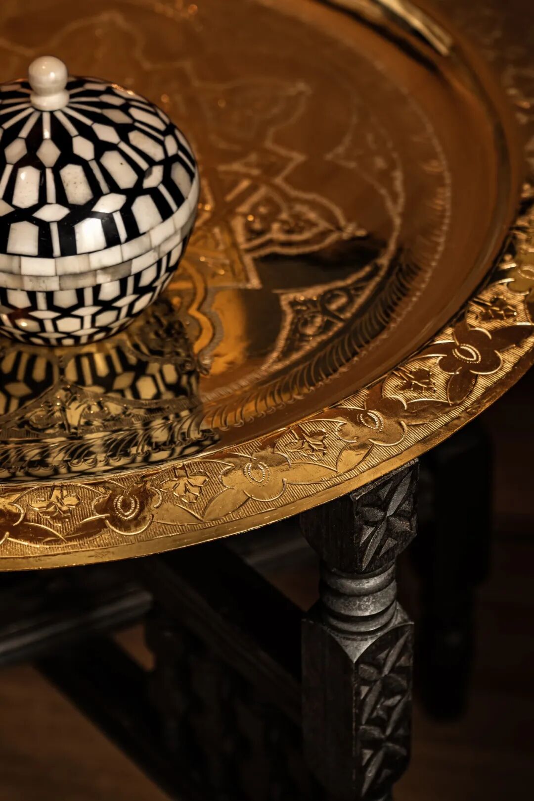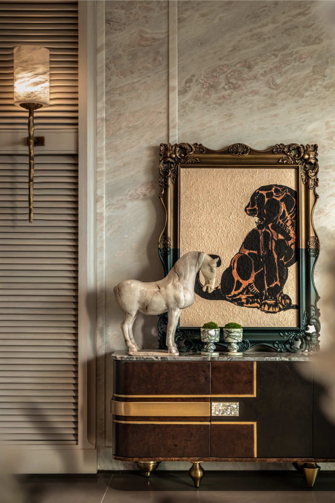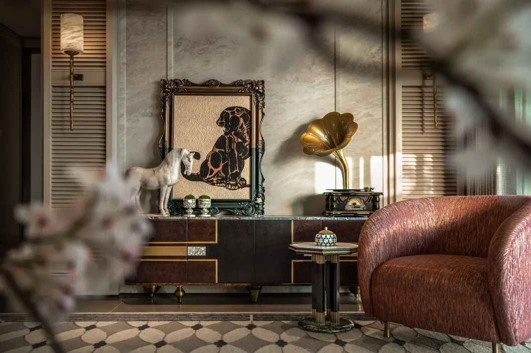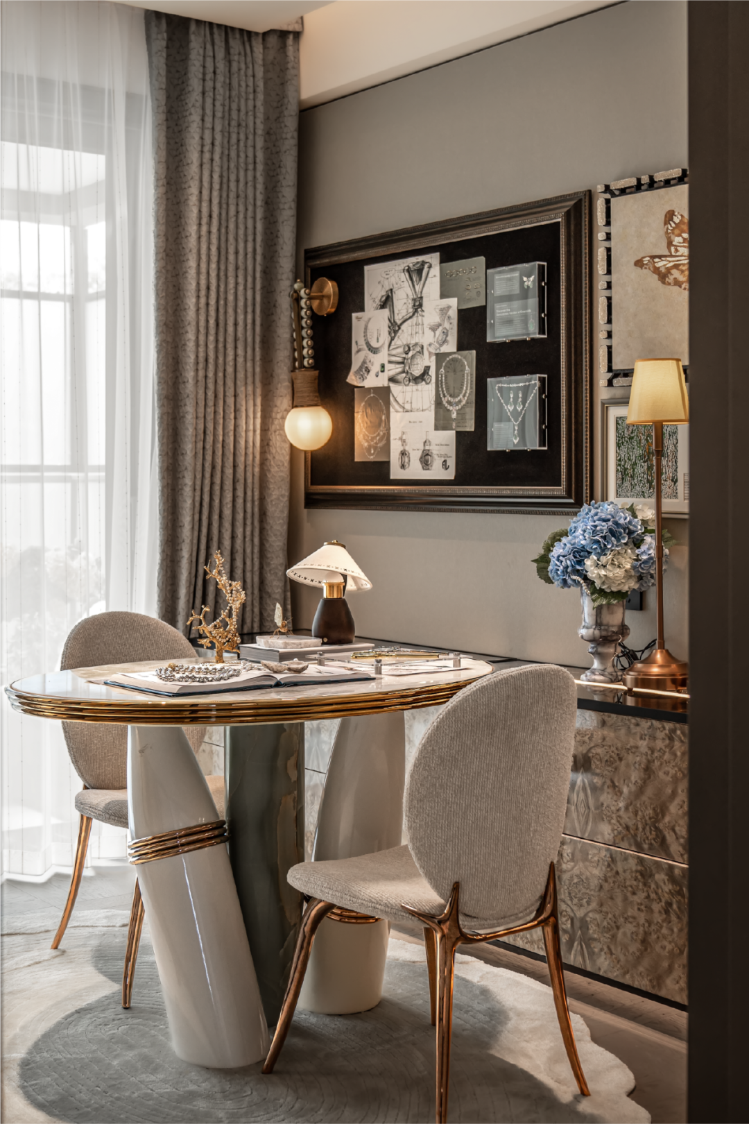 提炼岭南凤凰花图案的台灯和茶几映衬螺钿壁画上那一抹富有生命力的色彩,将色彩之气韵融汇于现代的海派美学,充满美学共性。