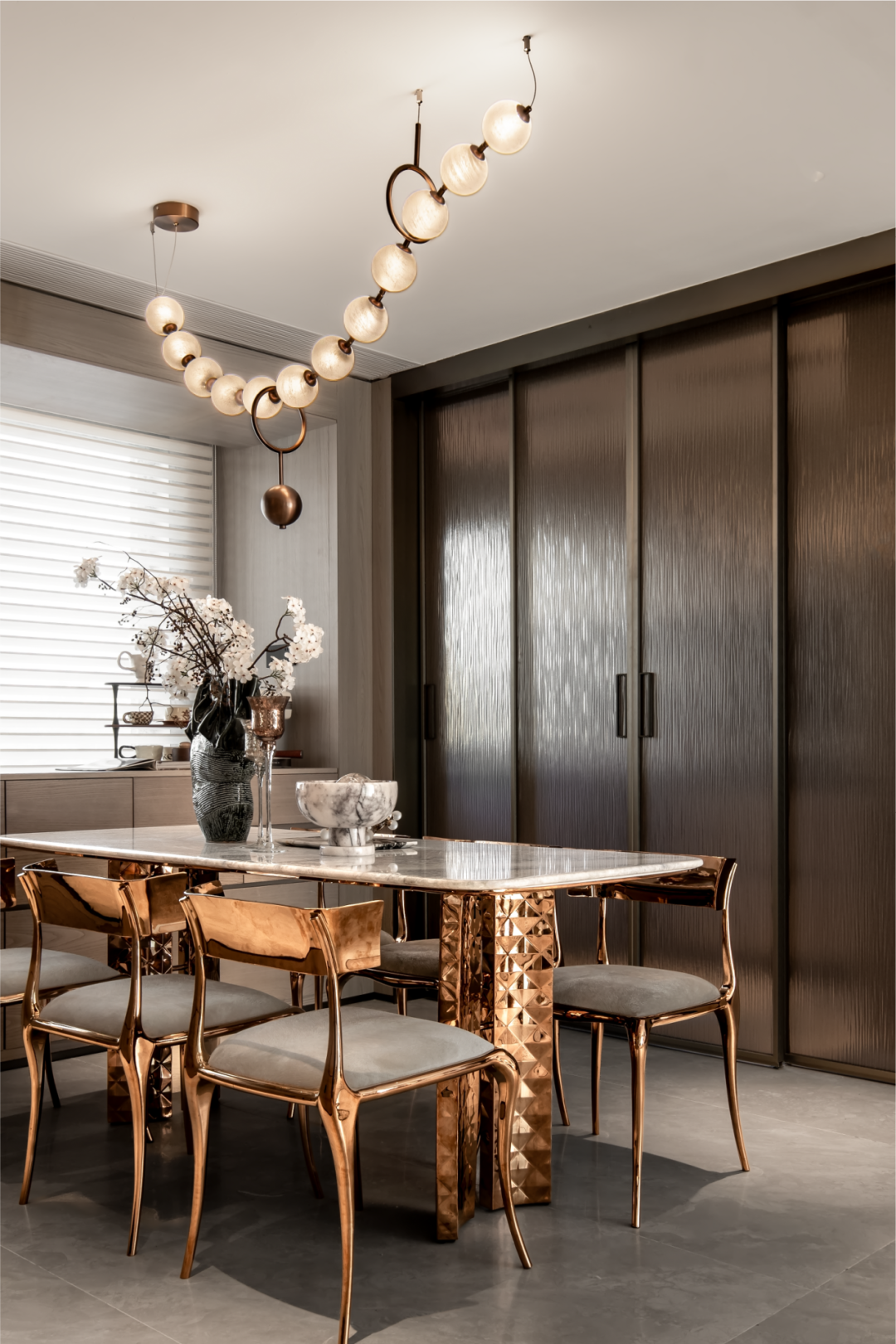 餐厅延续自然的原色,开放式的布局设计使其与客厅构成统一协调的场域,让餐饮时刻都增添几抹生活的温情。跳脱的连环吊灯是充满乐趣的小巧思,四季三餐,在家人的陪伴下,家的意义得到了最完美的诠释。