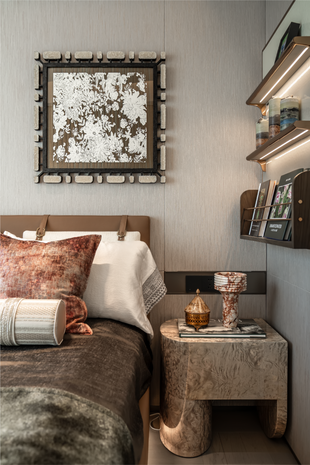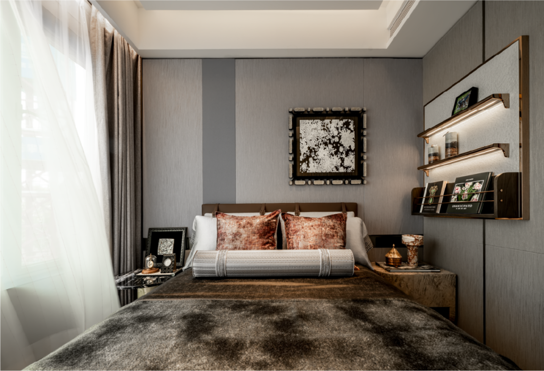 次卧空间的每一处细节皆彰显雅奢生活的精致与从容,从精选的室内装饰到细腻的寝具面料,无不体现出对生活品质的极致追求。