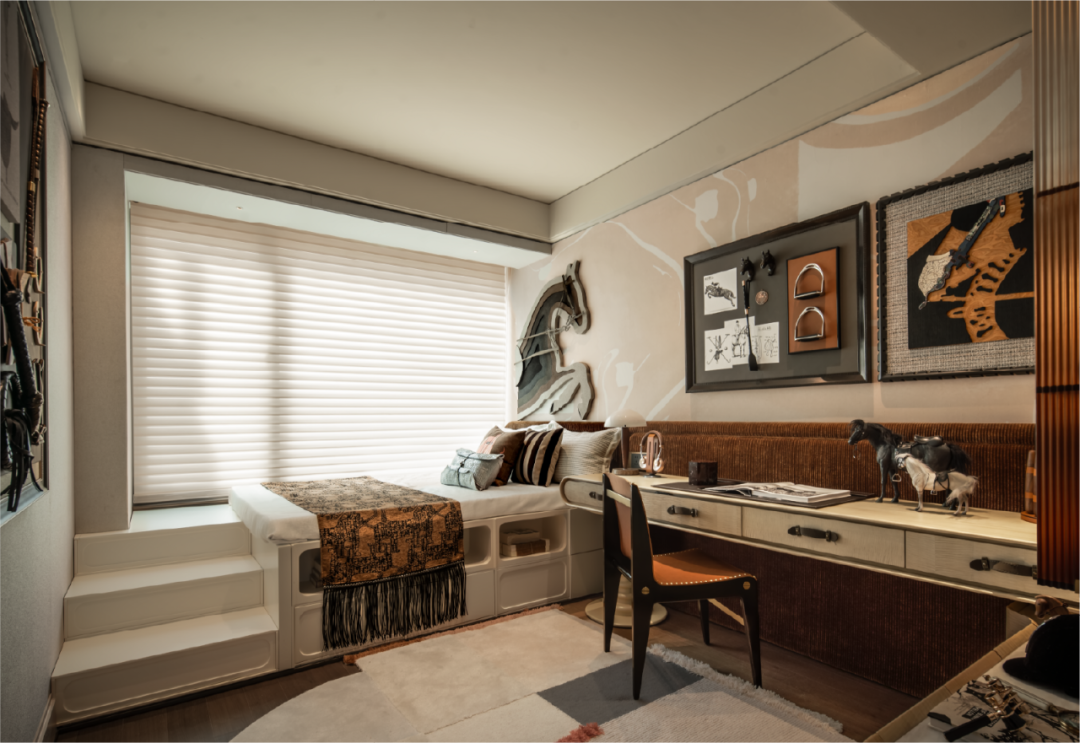 起坐、慢步、快步、送缰,男孩房以“马术”为设计锚点,每一处细节都散发出对自由驰骋的无尽向往,构筑一方热烈的逐梦之地。