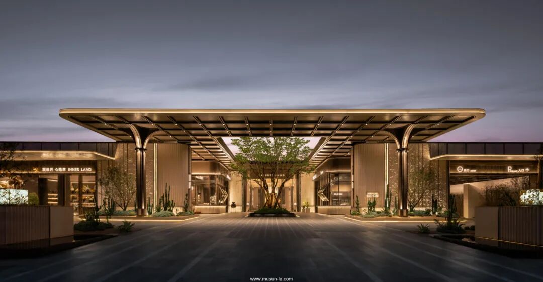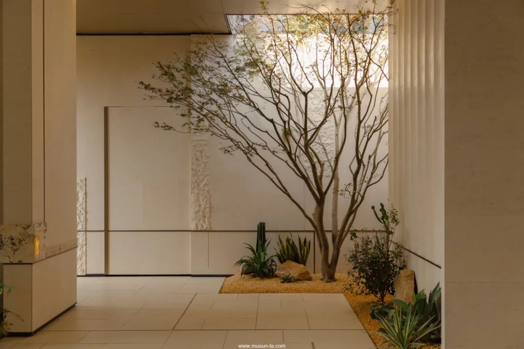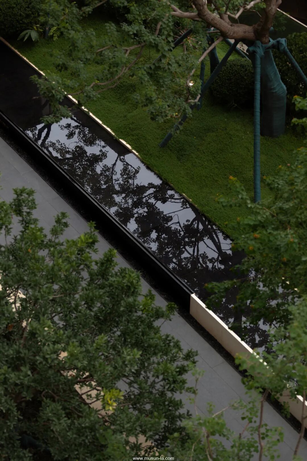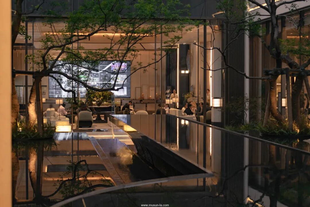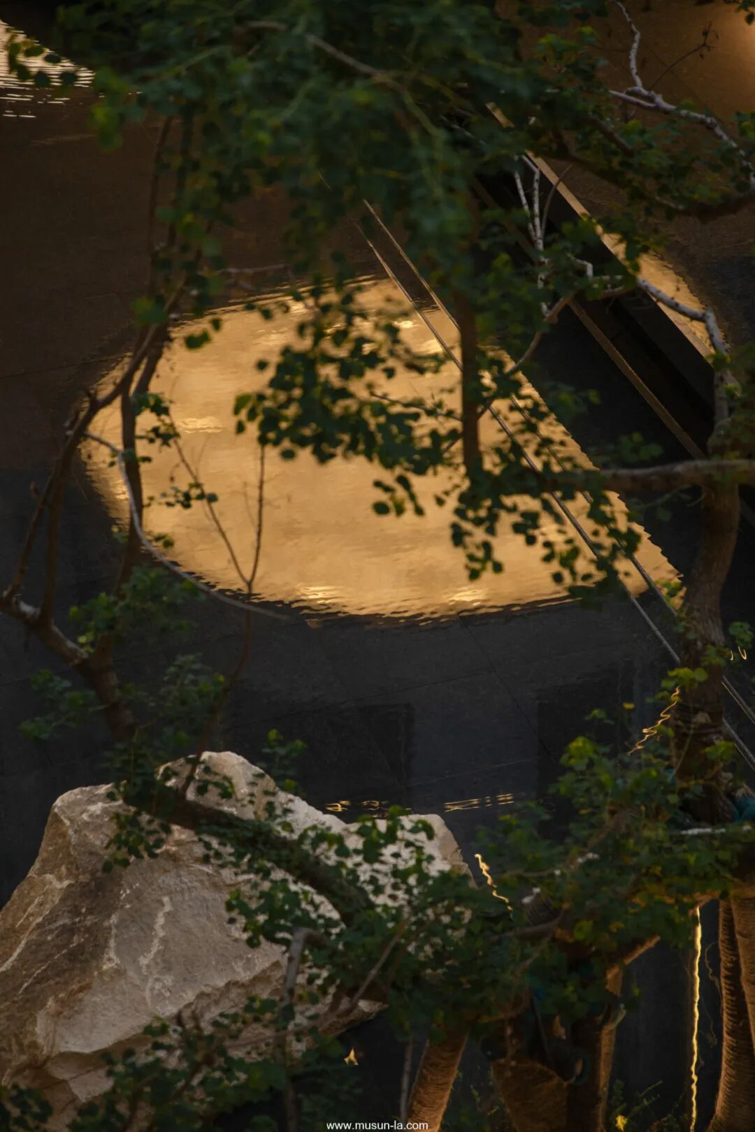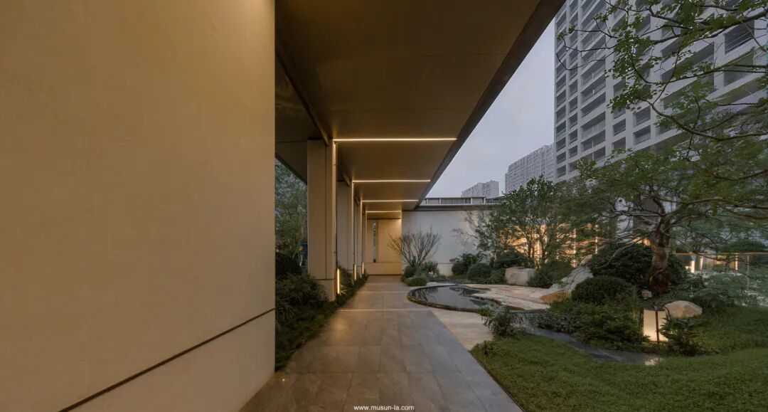 / 让建筑生长于自然 让生活回归于诗意 示范区主入口以69米超尺度城市界面展开,融合7米高柱式挑檐,复刻奢华酒店落客环岛设计,营造极具仪式感的归家序章。 特选10米高丛生铁冬青“树王”作为迎归象征,结合三重奢石景墙与静谧镜面水景,构筑出充满领域感的城市界面。 神树与水景相互映衬,天光与倒影交织成震撼视觉,在神性与光影的渗透中,形成引人入胜的精神场域,强化了归途中的仪式感与体验深度。 光与自然交织出神性艺术空间。长达20米的超长悬挑叠水与13米高的光影悬亭,共同致敬经典美学,赋予空间强烈的仪式感,呈现极萃艺术之美。 光成为空间的语言,细腻地提升着场景变化的层次,进一步烘托出神性空间独有的美学氛围。 22米进深的下沉水庭,延续了对路易斯·康、安藤忠雄等建筑大师光影哲思的致敬。整个场域通过“视线穿透、三重爆点”的布局手法,最终构筑出一处充满神性的艺术体验空间。 20米悬挑叠水、13米光影悬亭,以及悬浮的兰花雕塑,在光线的渲染下共同塑造空间情绪。 庭院向下生长,生活向上延伸。宴会厅、棋牌室、台球室、健身房,每一扇窗都成为流动的画框,使建筑功能与自然意趣深度交融,达成无界的共鸣。 窗内是生活主场 窗外是自然画卷 / 空间下沉,意境无界 森栖之境以《林泉高致》为灵感,将古典造园手法与现代艺术相融合,构建出一个集会客、休息与观赏于一体的慢生活空间,演绎与自然共生共话的生活场景。 以日式枯山水为蓝本,融合红枫、碎拼铺装与苔藓地衣,构筑一方禅意疗愈庭院 巧妙借景足立美术馆,以框景手法分层引入绿意,形成近观鸡爪槭、中赏孤植红枫、远借林冠线的立体生态长卷。 「后记」 / 光不只是照明,而是空间的情绪; 林不只是绿化,而是生活的背景。 / 光影氛围 / 空间营造 / 植物意境 / ———项目信息——— 项目名称:龙湖·观萃 业主单位:龙湖集团 甲方管理团队:王聪 李星池 刘航铭 朱雯瑜 完成时间:2025.09 占地面积:10696.34㎡ 项目地点:长沙 景观设计:MUSUN木杉景观 方案团队:邹余浩 黎红 葛涛 陈滢颖 吴彦融 张润 刘钦 赵佳乐 施工图团队:周云 孙柳柳 廖涛涛 陈浩楠 植物设计:吴林 水电设计:张婷 结构设计:周文强 摄影:陈晓婷 严静 黄闰 摄像:黄闰 后期:严静 撰文:陈晓婷