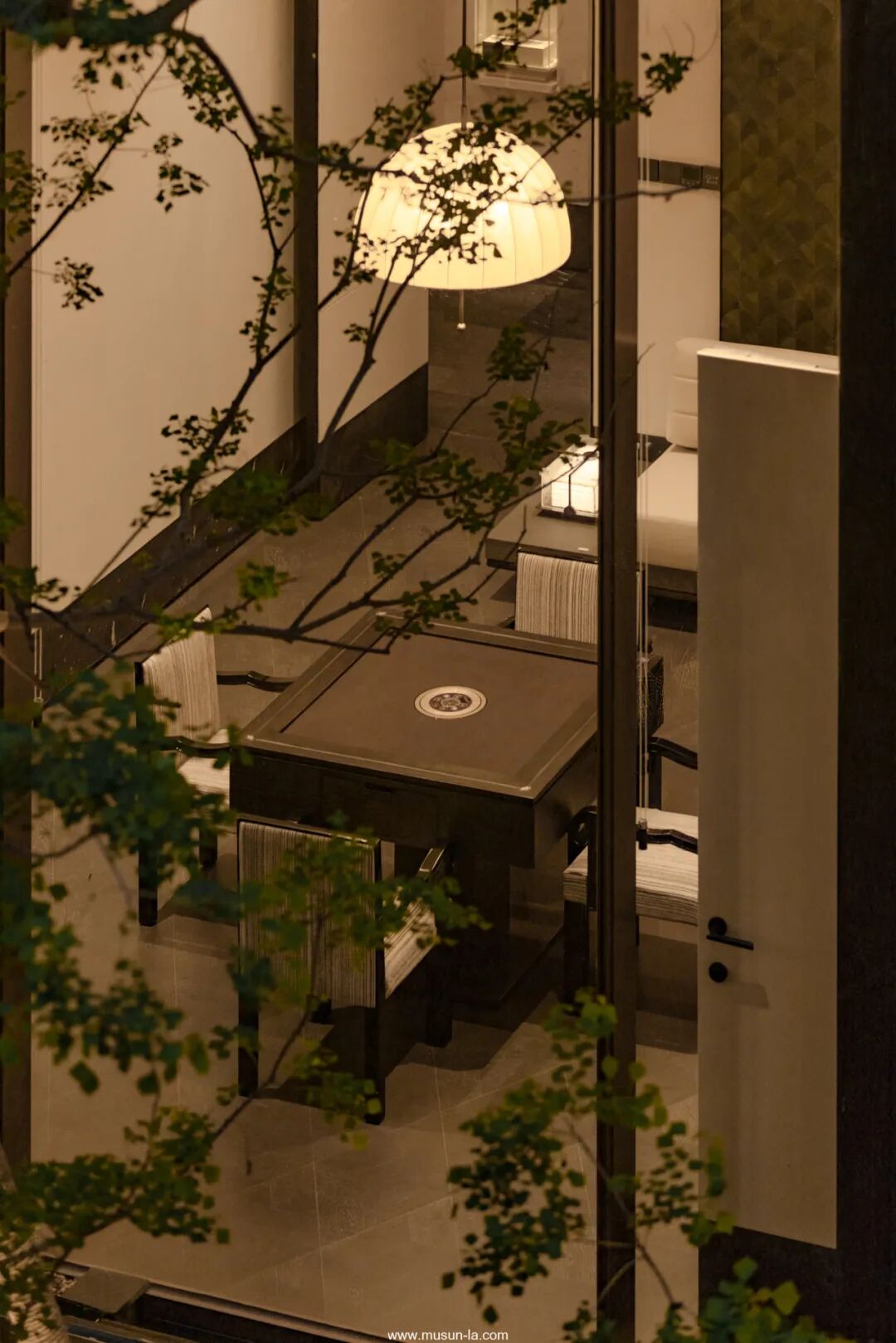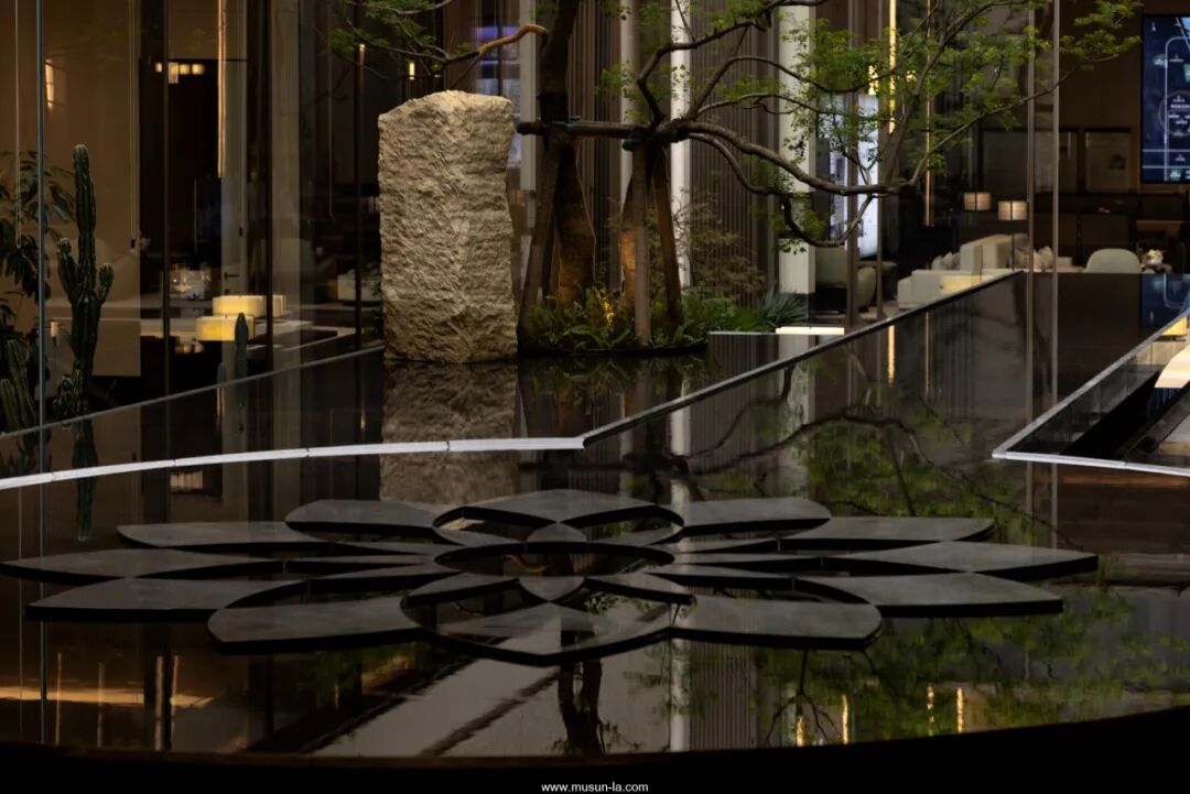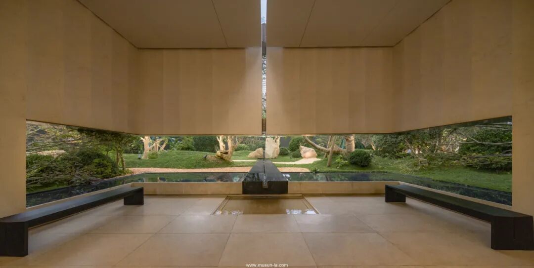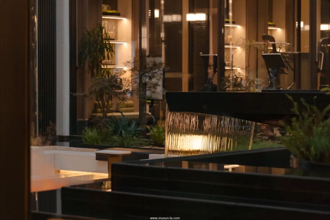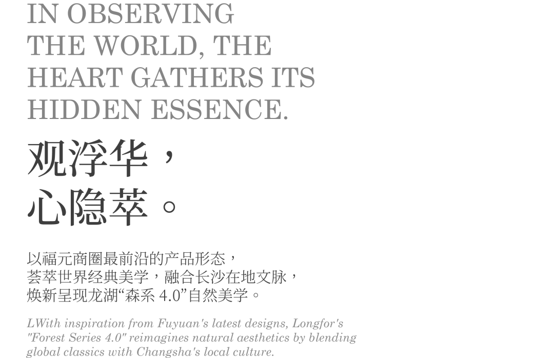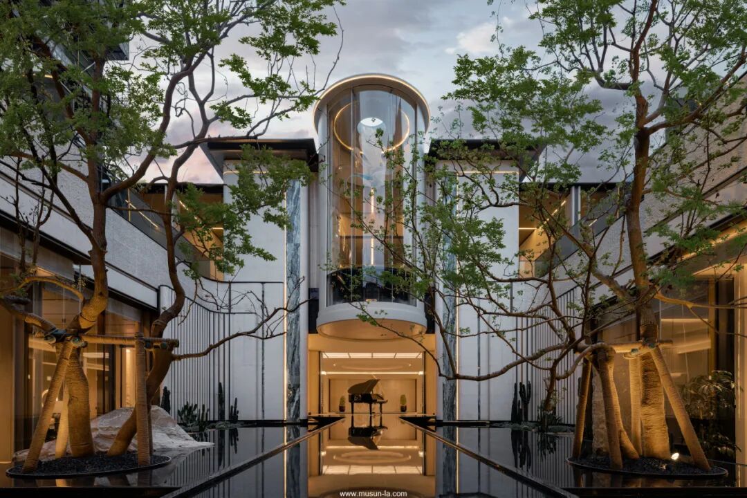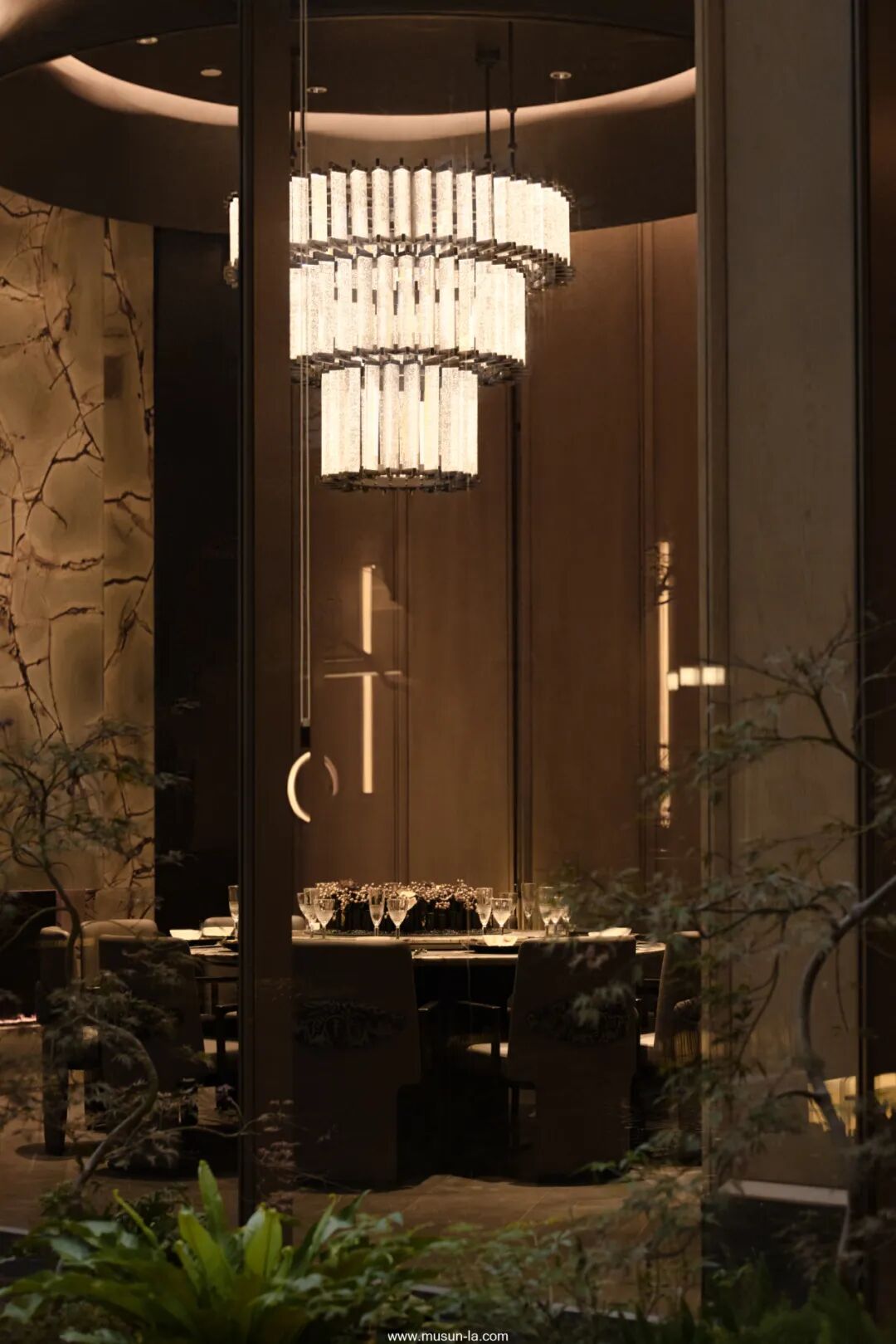 / 让建筑生长于自然 让生活回归于诗意 示范区主入口以69米超尺度城市界面展开,融合7米高柱式挑檐,复刻奢华酒店落客环岛设计,营造极具仪式感的归家序章。 特选10米高丛生铁冬青“树王”作为迎归象征,结合三重奢石景墙与静谧镜面水景,构筑出充满领域感的城市界面。 神树与水景相互映衬,天光与倒影交织成震撼视觉,在神性与光影的渗透中,形成引人入胜的精神场域,强化了归途中的仪式感与体验深度。 光与自然交织出神性艺术空间。长达20米的超长悬挑叠水与13米高的光影悬亭,共同致敬经典美学,赋予空间强烈的仪式感,呈现极萃艺术之美。 光成为空间的语言,细腻地提升着场景变化的层次,进一步烘托出神性空间独有的美学氛围。 22米进深的下沉水庭,延续了对路易斯·康、安藤忠雄等建筑大师光影哲思的致敬。整个场域通过“视线穿透、三重爆点”的布局手法,最终构筑出一处充满神性的艺术体验空间。 20米悬挑叠水、13米光影悬亭,以及悬浮的兰花雕塑,在光线的渲染下共同塑造空间情绪。 庭院向下生长,生活向上延伸。宴会厅、棋牌室、台球室、健身房,每一扇窗都成为流动的画框,使建筑功能与自然意趣深度交融,达成无界的共鸣。 窗内是生活主场 窗外是自然画卷 / 空间下沉,意境无界 森栖之境以《林泉高致》为灵感,将古典造园手法与现代艺术相融合,构建出一个集会客、休息与观赏于一体的慢生活空间,演绎与自然共生共话的生活场景。 以日式枯山水为蓝本,融合红枫、碎拼铺装与苔藓地衣,构筑一方禅意疗愈庭院 巧妙借景足立美术馆,以框景手法分层引入绿意,形成近观鸡爪槭、中赏孤植红枫、远借林冠线的立体生态长卷。 「后记」 / 光不只是照明,而是空间的情绪; 林不只是绿化,而是生活的背景。 / 光影氛围 / 空间营造 / 植物意境 / ———项目信息——— 项目名称:龙湖·观萃 业主单位:龙湖集团 甲方管理团队:王聪 李星池 刘航铭 朱雯瑜 完成时间:2025.09 占地面积:10696.34㎡ 项目地点:长沙 景观设计:MUSUN木杉景观 方案团队:邹余浩 黎红 葛涛 陈滢颖 吴彦融 张润 刘钦 赵佳乐 施工图团队:周云 孙柳柳 廖涛涛 陈浩楠 植物设计:吴林 水电设计:张婷 结构设计:周文强 摄影:陈晓婷 严静 黄闰 摄像:黄闰 后期:严静 撰文:陈晓婷
