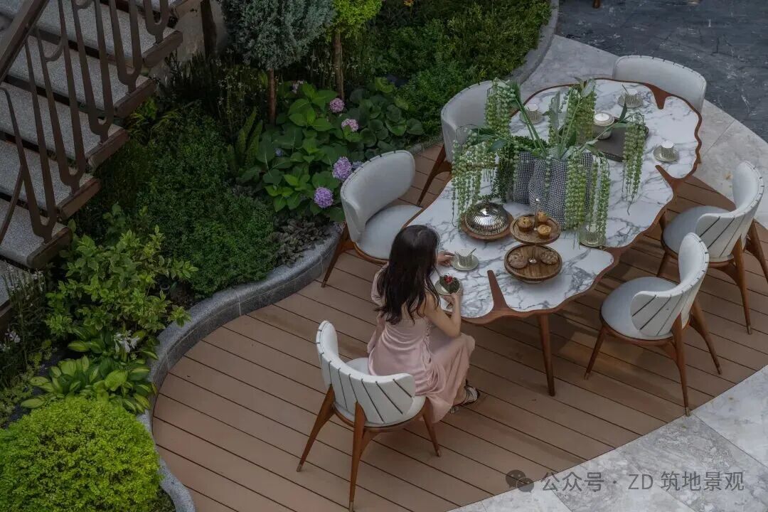 就餐区被精致花境温柔簇拥,餐桌如自然舞台,承载生活烟火,与花园氛围相融,让用餐成与自然对话的仪式。