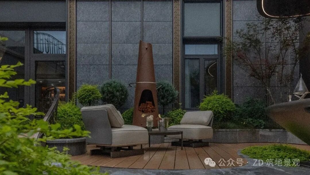 The bar fireplace space combines natural wildness with exquisite soft furnishings. The metal fireplace is modern and simple, while enhancing the quality of the garden. The orange red flames jump, creating a warm atmosphere in the courtyard.