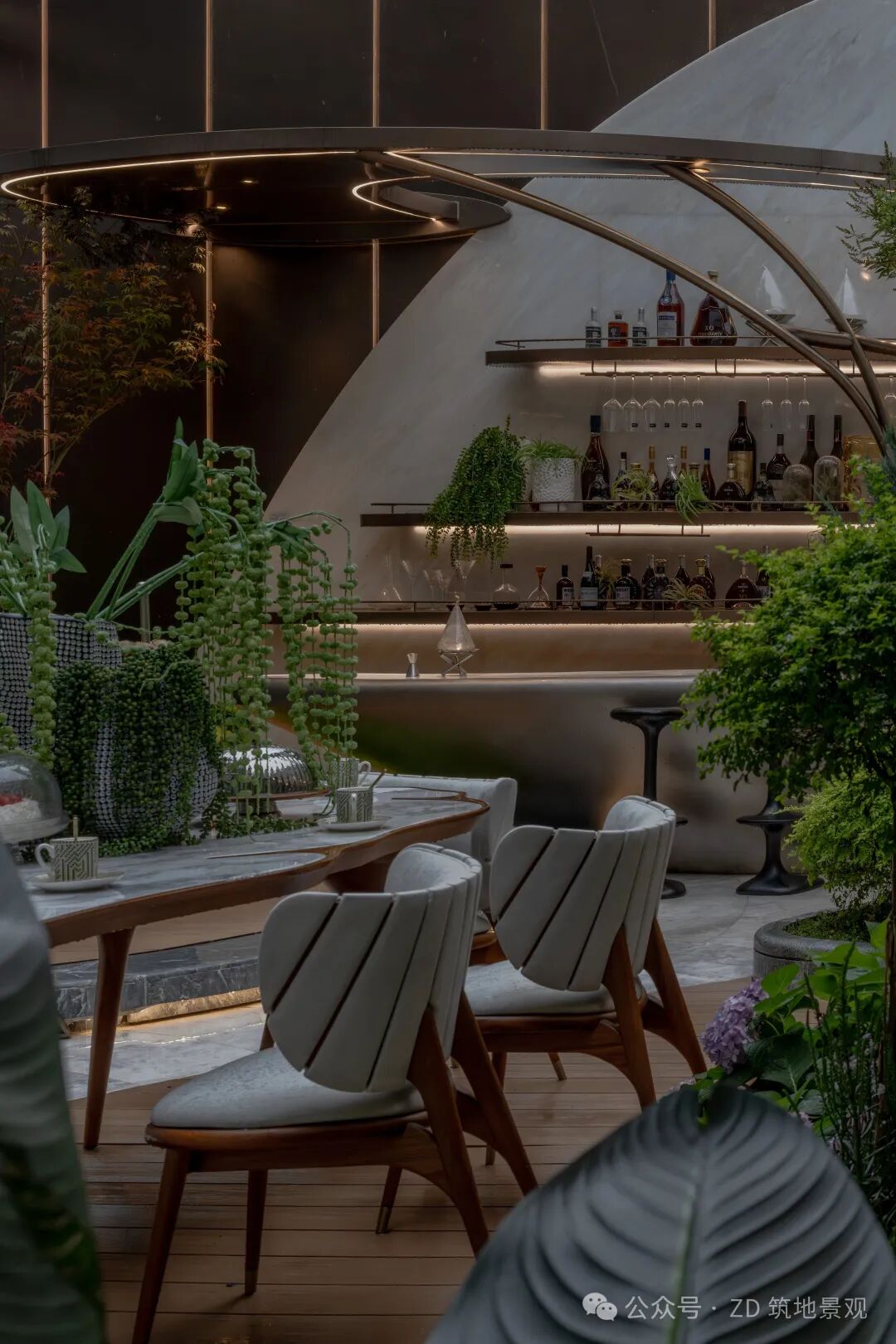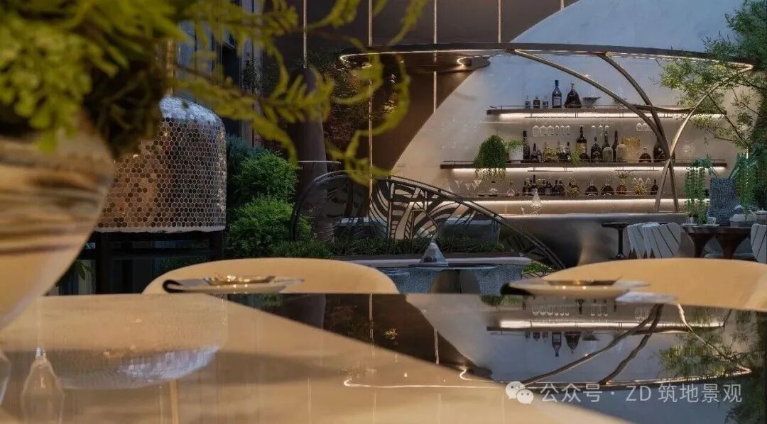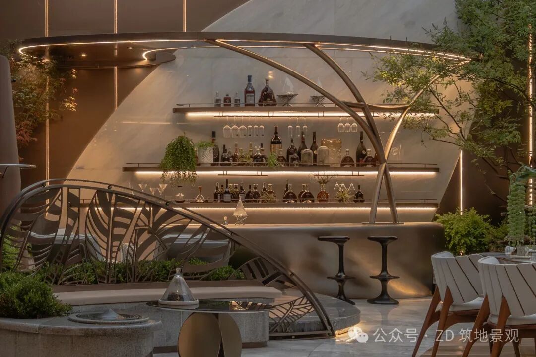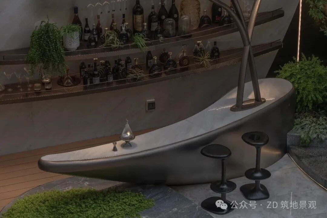 The streamlined bar counter is crafted with imitation copper hammer metal craftsmanship, and the counter surface and background wall are made of oversized royal white marble, showcasing a luxurious sense of space. Green plants quietly infiltrate from all around, bringing vitality to the garden and creating a futuristic living scene. The space combines social warmth and artistic style, and every detail tells the poetic interweaving of nature and culture.