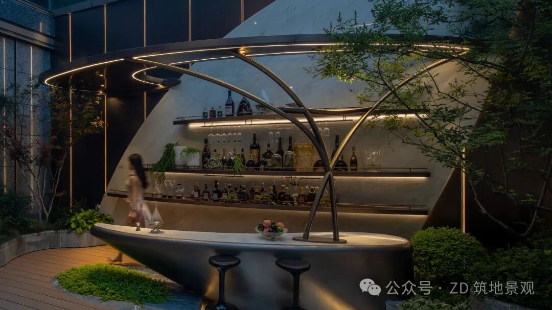 吧台空间是艺术与生活共融的精致容器。弧形金属构架如灵动的艺术线条,勾勒出优雅轮廓,营造出流动的艺术感。