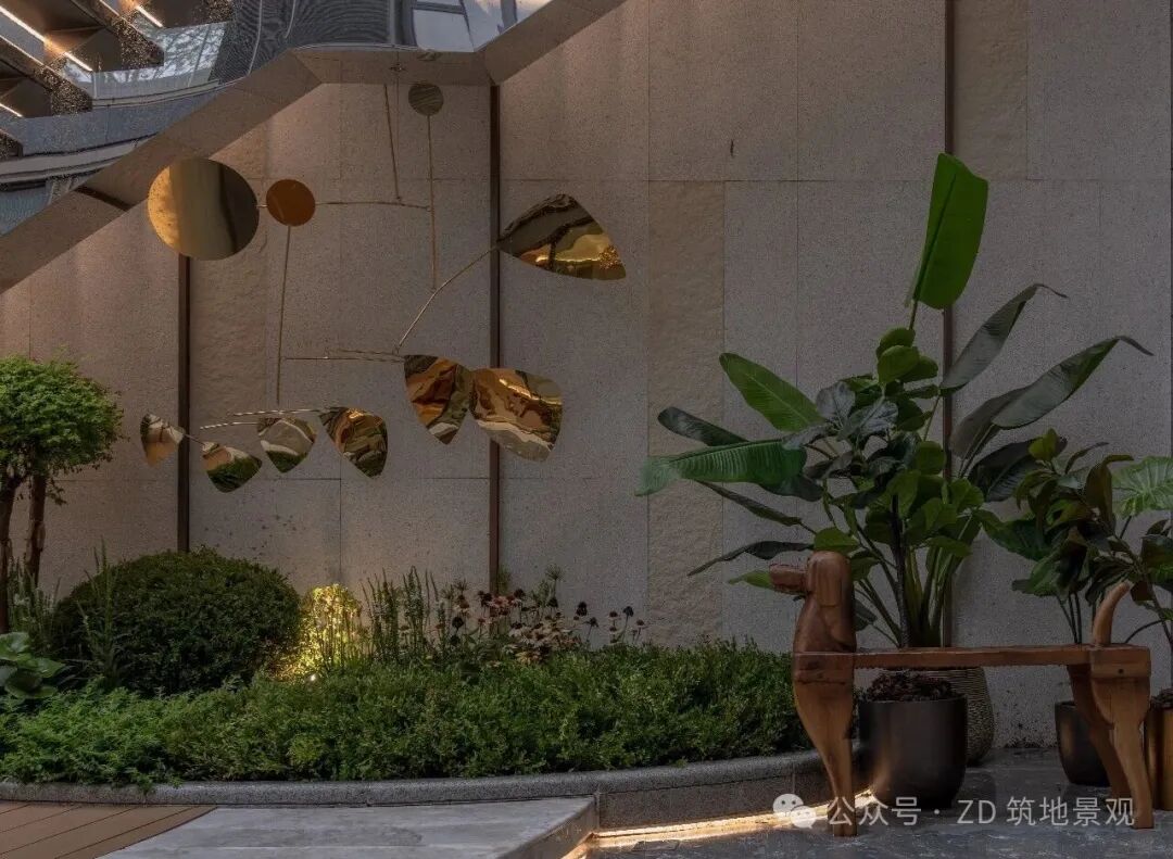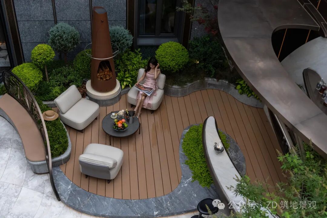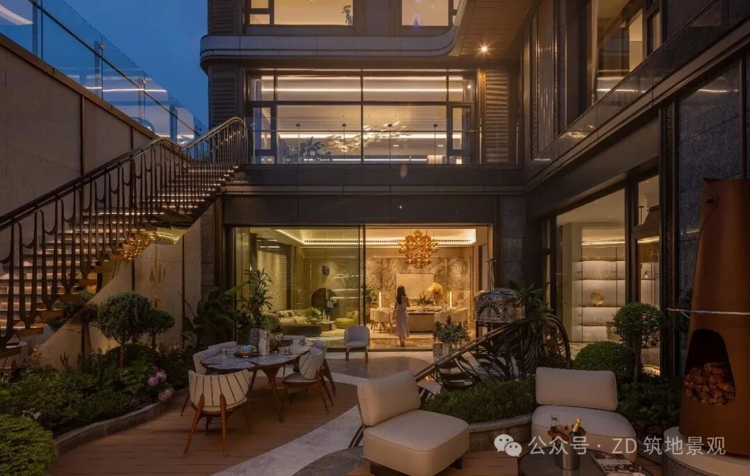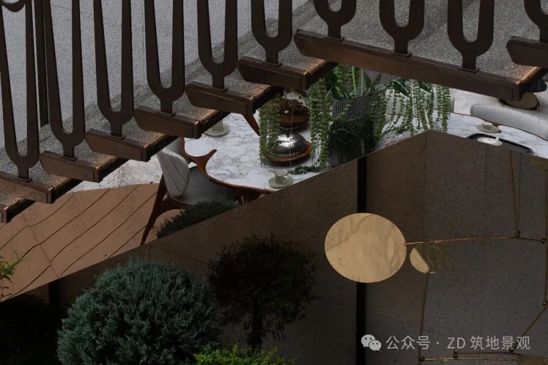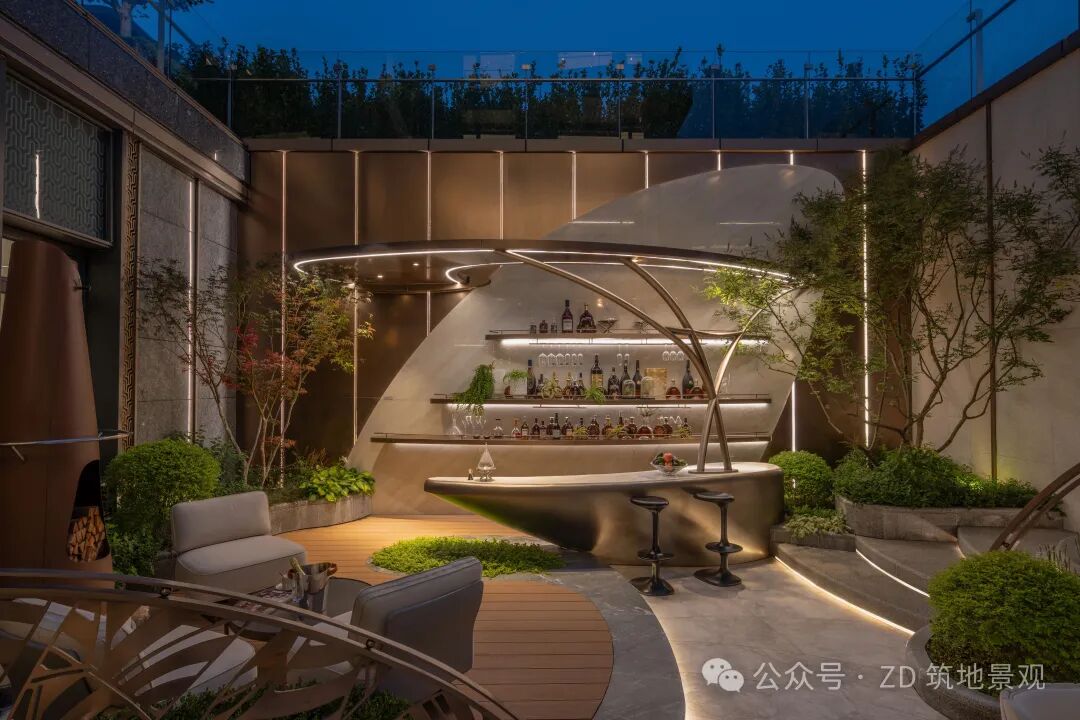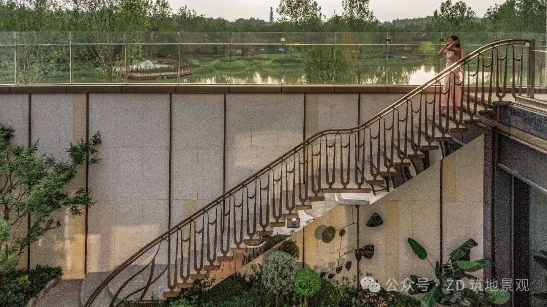 在精致的下沉庭院里,生活与艺术悄然交融。流畅线条勾勒出流动的景观空间,弧形结构似艺术笔触,打破生活的边界。艺术楼梯以独特造型延伸向上,将建筑艺术与自然景观精妙融合,仿铜色金属极具现代质感,又串联起空间层次,如立体的艺术装置。