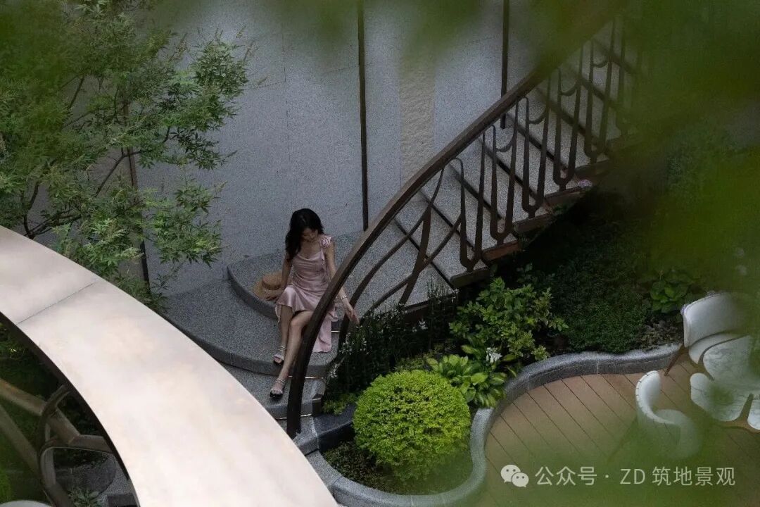 In this garden space, various elements interweave to create a unique aesthetic. The metal staircase extends upwards in a dynamic arc, resembling an artistic ribbon weaving through, connecting spatial layers and endowing the space with a vertical flow rhythm, integrating art and practicality.