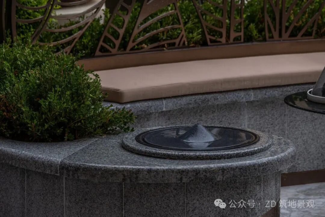 卡座区是花园里兼具舒适与艺术感的休憩角落。造型别致的金属构架,如艺术藤蔓环绕,勾勒出半围合空间,既保留开放感又具专属氛围。浅灰色沙发柔软包容,搭配精致小桌,一旁喷泉流水潺潺,绿植花卉点缀,让人在此放松身心,将花园的自然与艺术,融入日常休憩时光 。