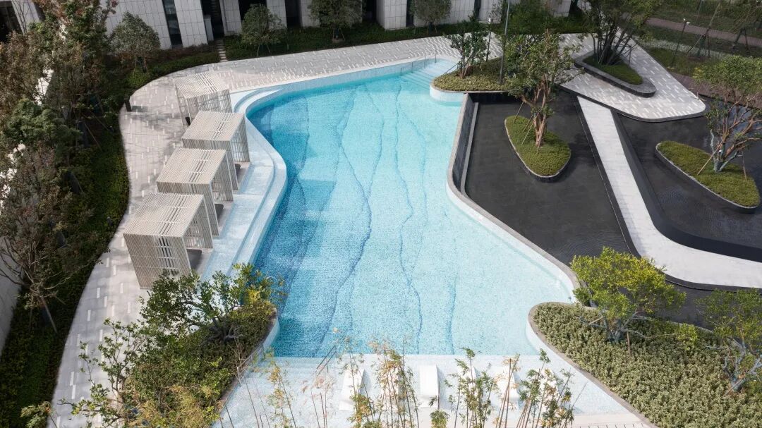 泳池作为豪宅标配,施工图在保证符合国家标准规范的前提下让方案最大化落地。泳池中涉及的元素较多,池底深水区,浅水区,阶梯,水中休闲台,池面树池,溢水口,休闲亭,无边际跌水,以及与水苑静水面的交接都是施工图处理要点。