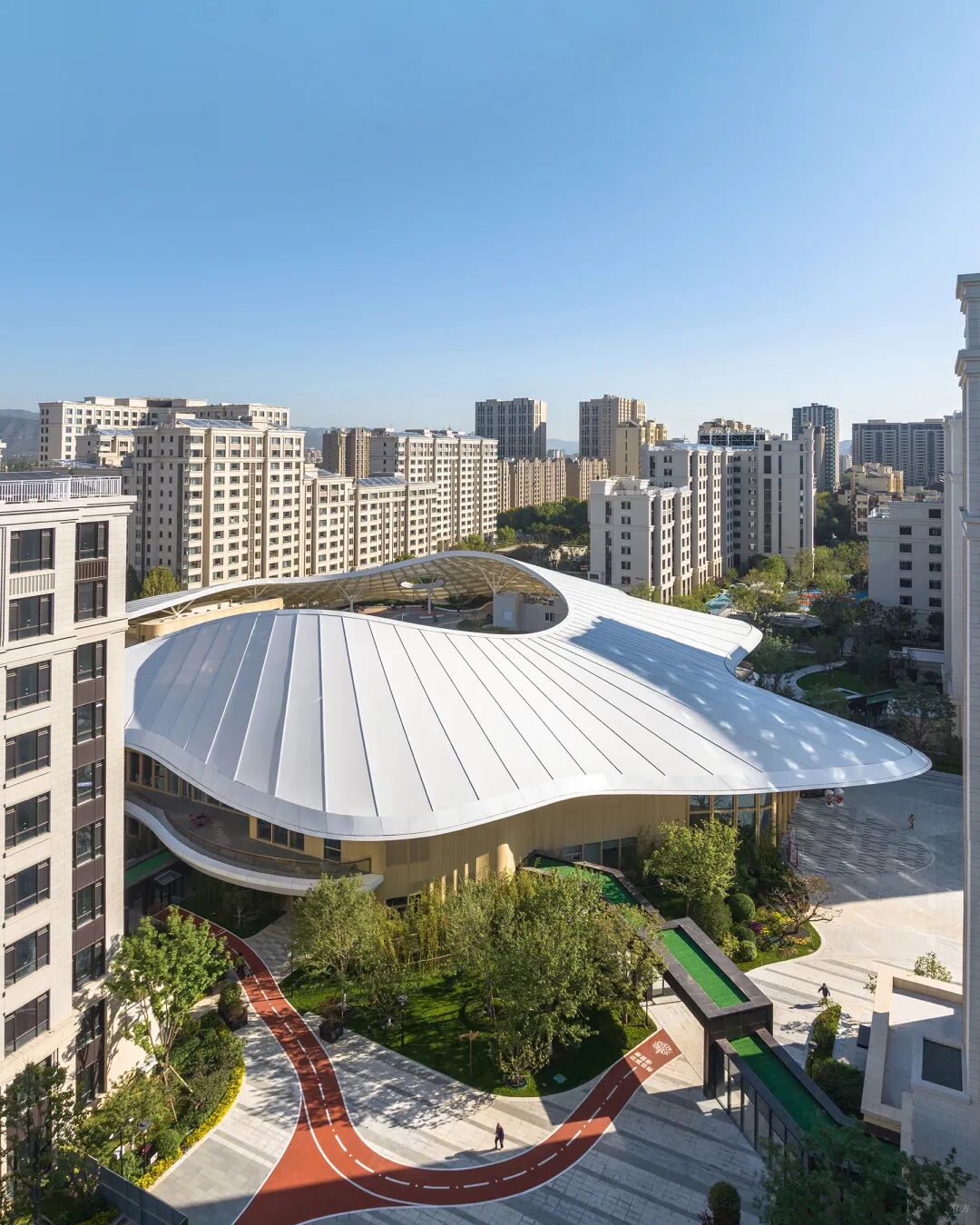 相对于四周规则的建筑形态,活力中心呈现更加自由和充满活力的有机形态。如一颗水珠滴落,在场地中激起涟漪,自中心散开、升腾,形成一片白色、柔软的云朵,最终转化为自由的大屋顶。
