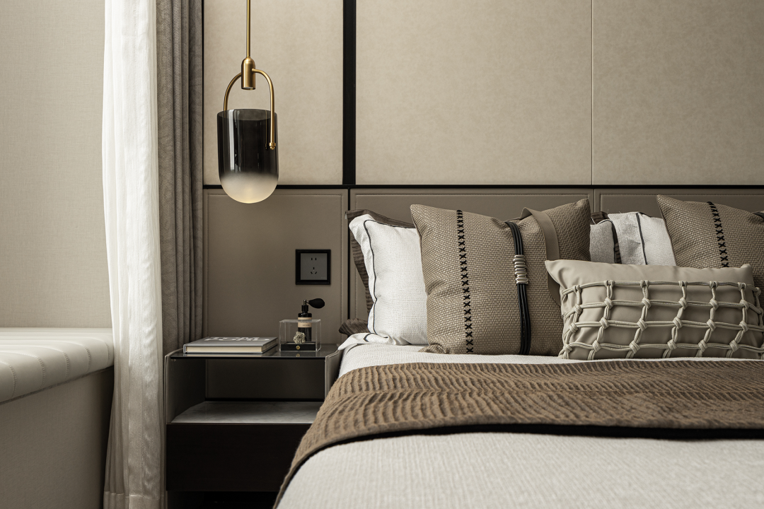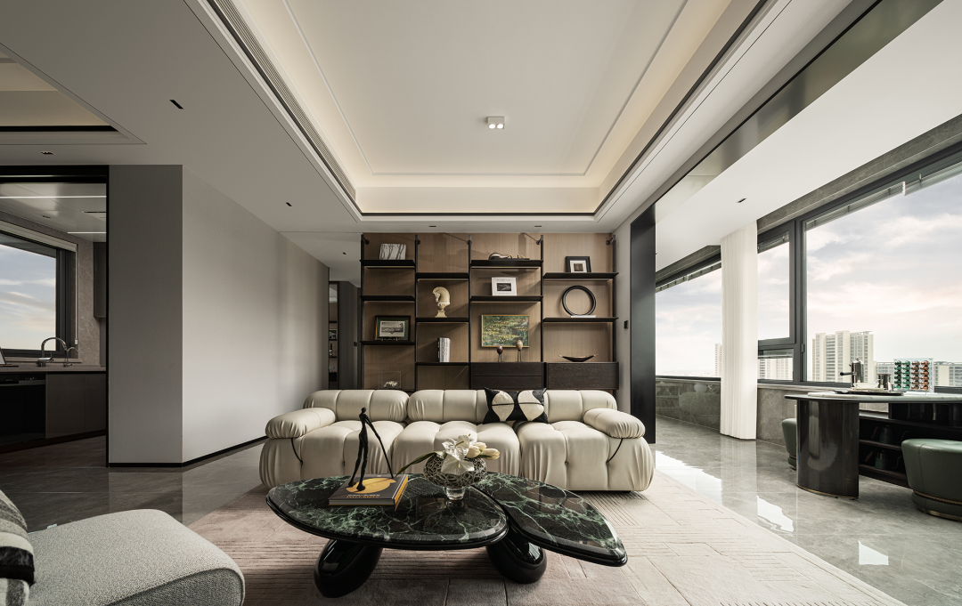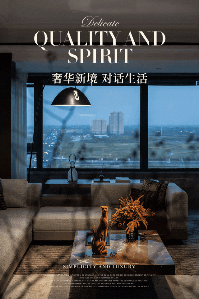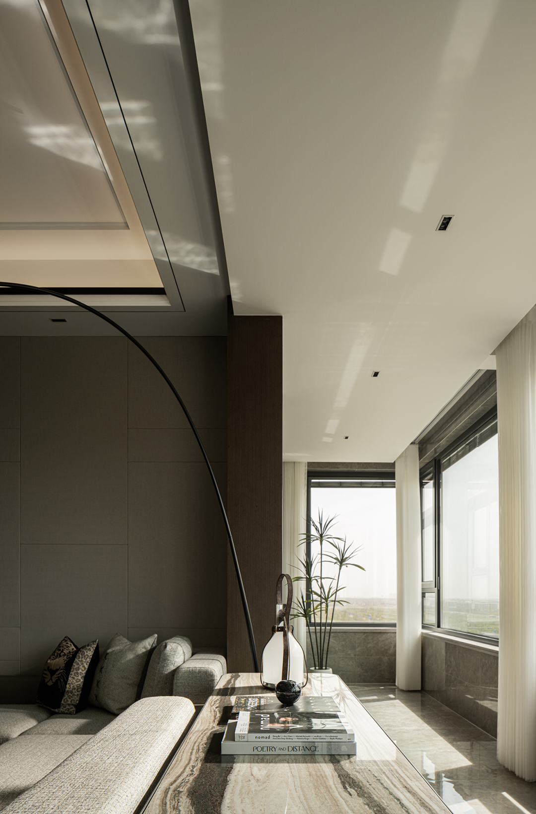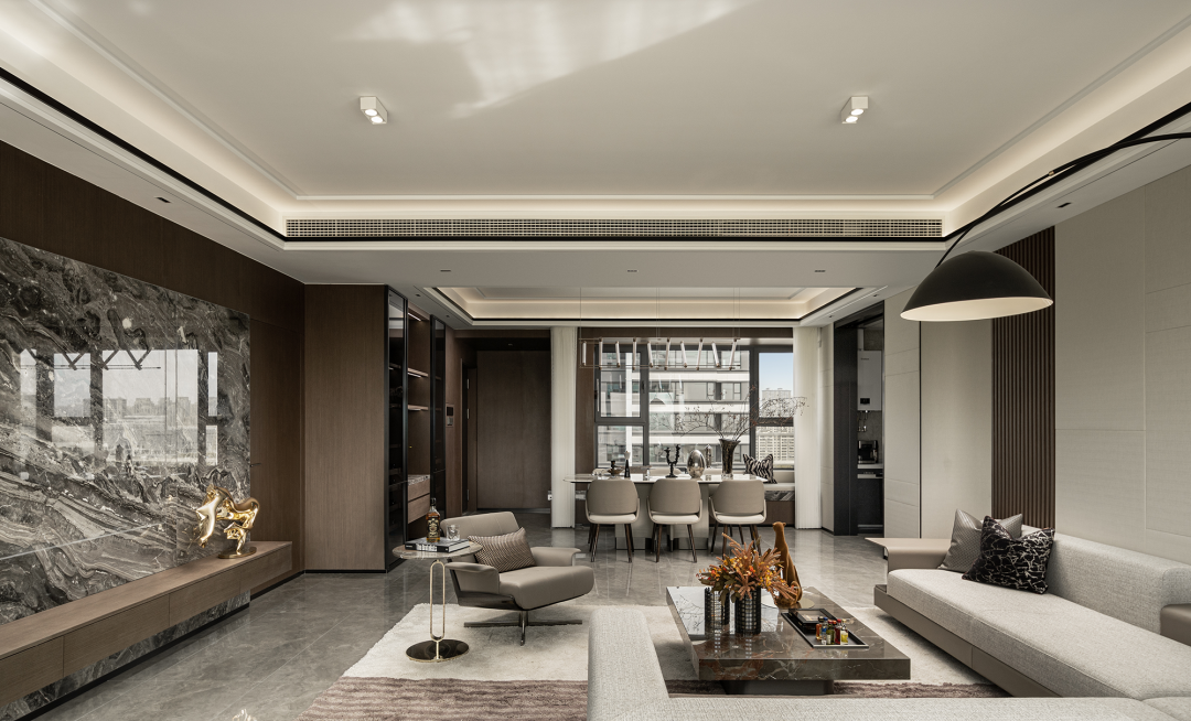 客厅以简洁示人,简洁直挺而富有生命悦动的迷人线条,舒适而奢华的面料,咖色柔和魅力,灵动简约,优雅内敛,以人性化考量和细节营造。