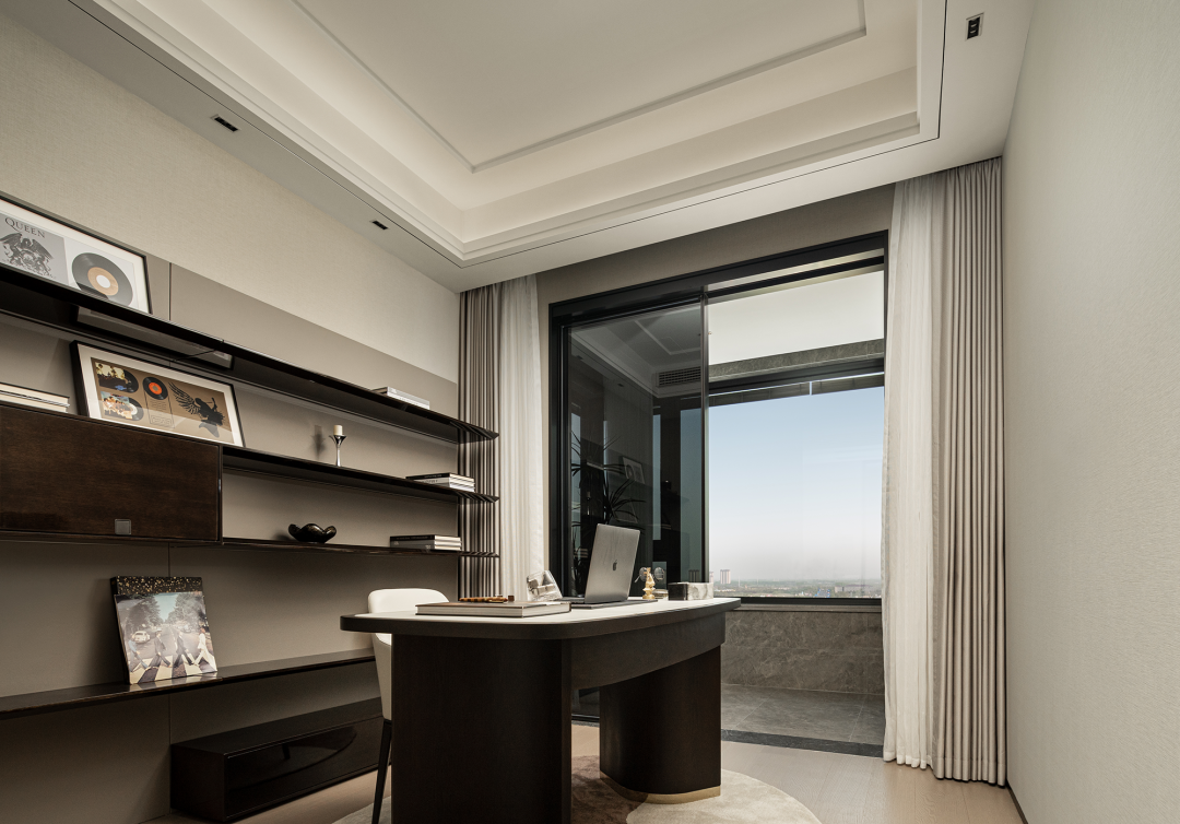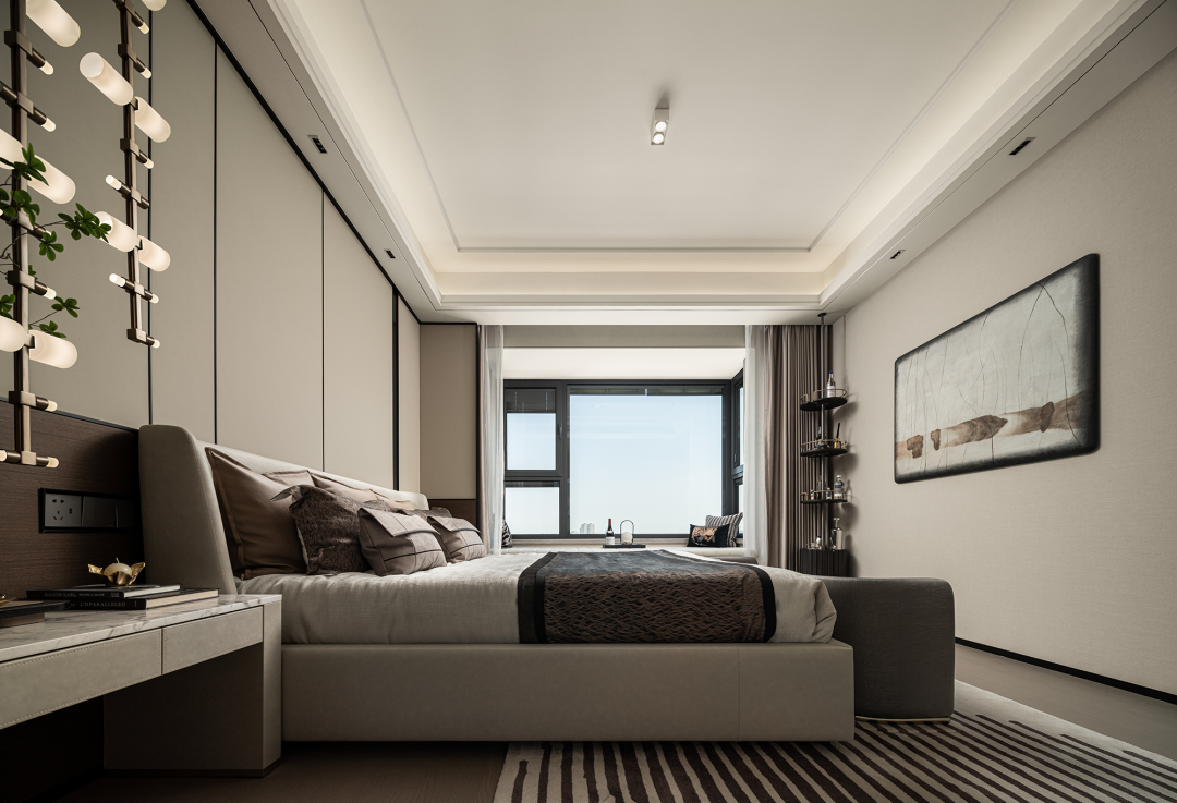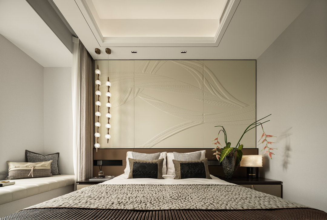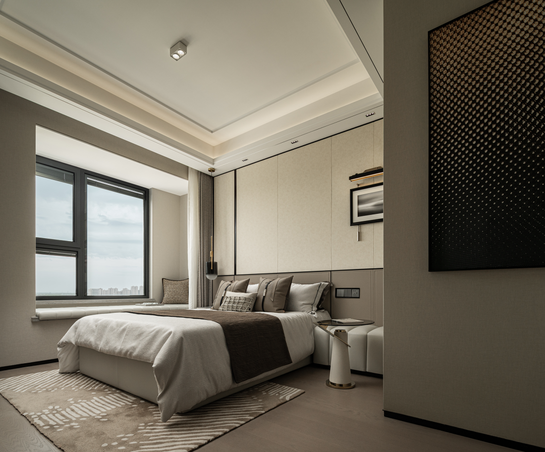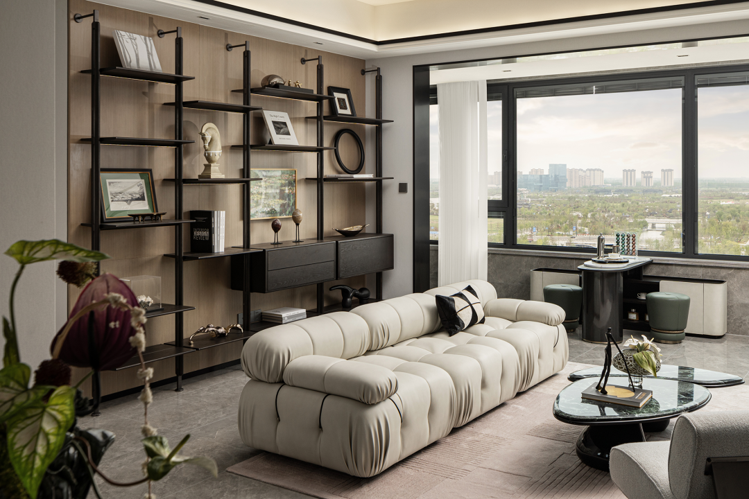 客厅以简洁示人,简洁直挺而富有生命悦动的迷人线条,舒适而奢华的面料,咖色柔和魅力,灵动简约,优雅内敛,以人性化考量和细节营造。