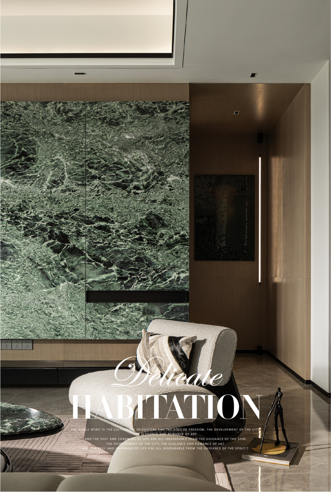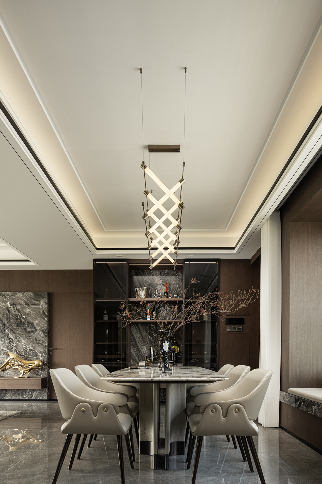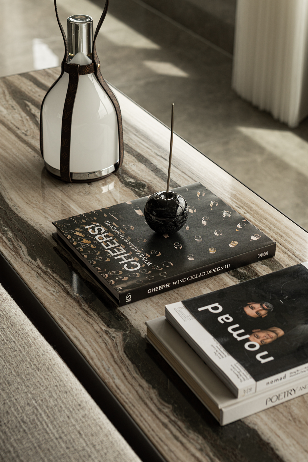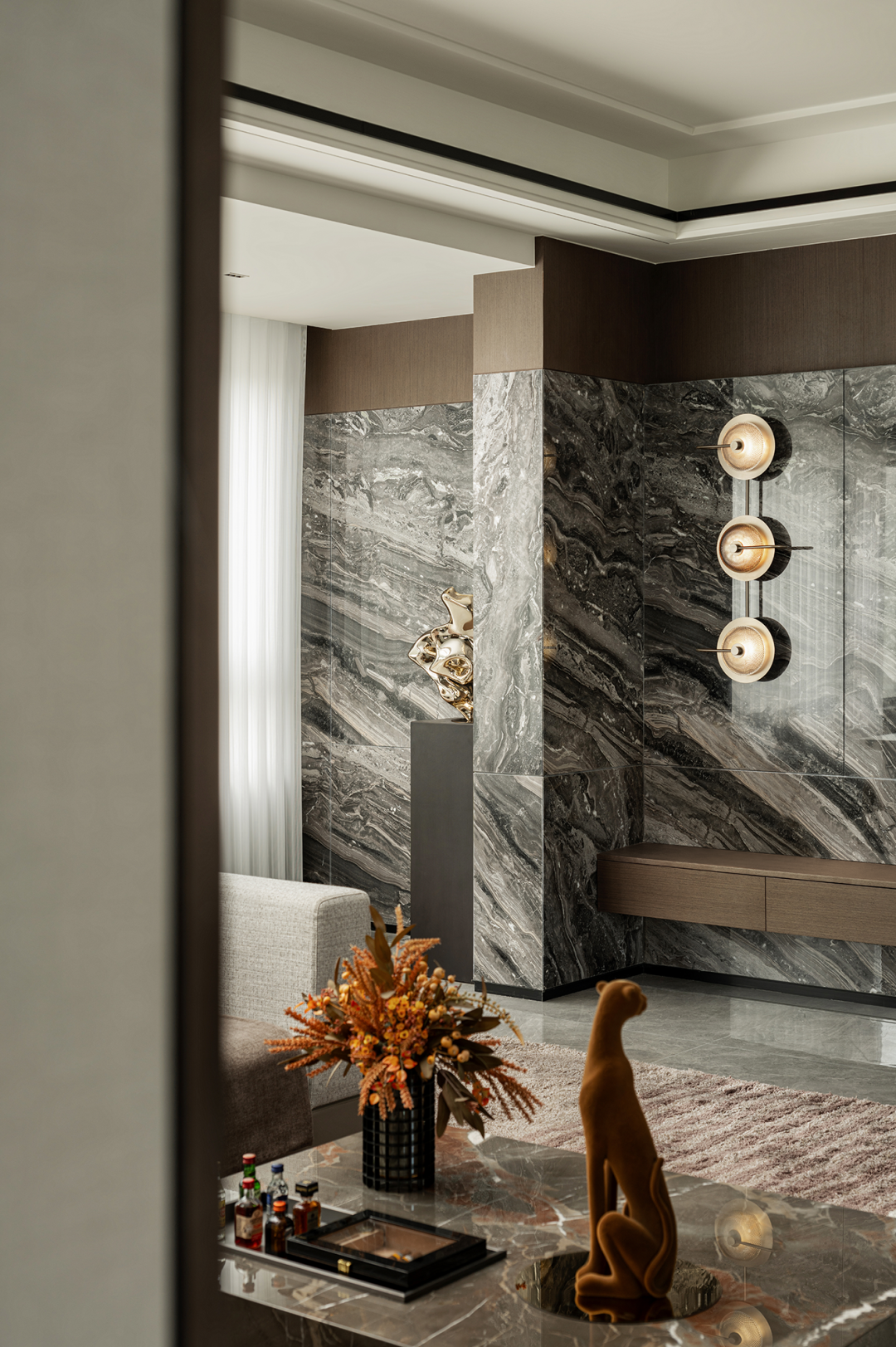 空间大量的木材、奢石、皮革等不同材质的肌理穿插运用,奠定了奢华的气质。