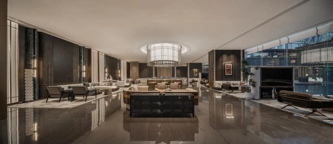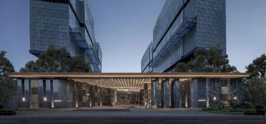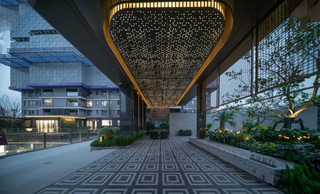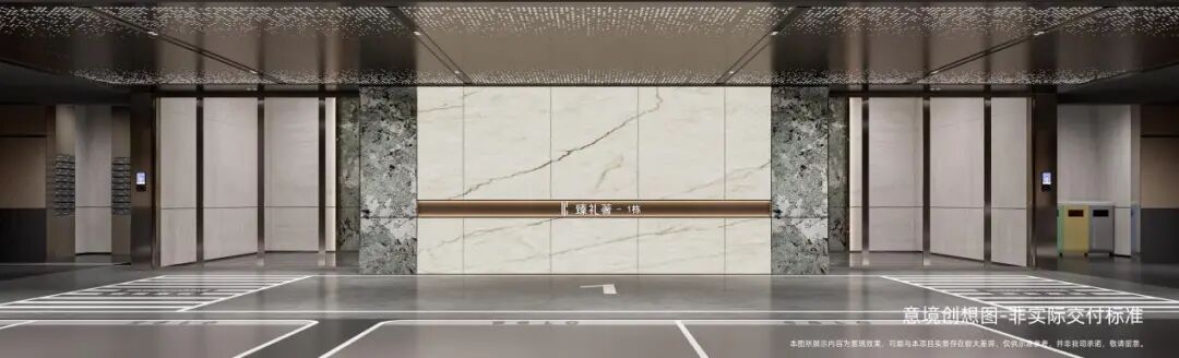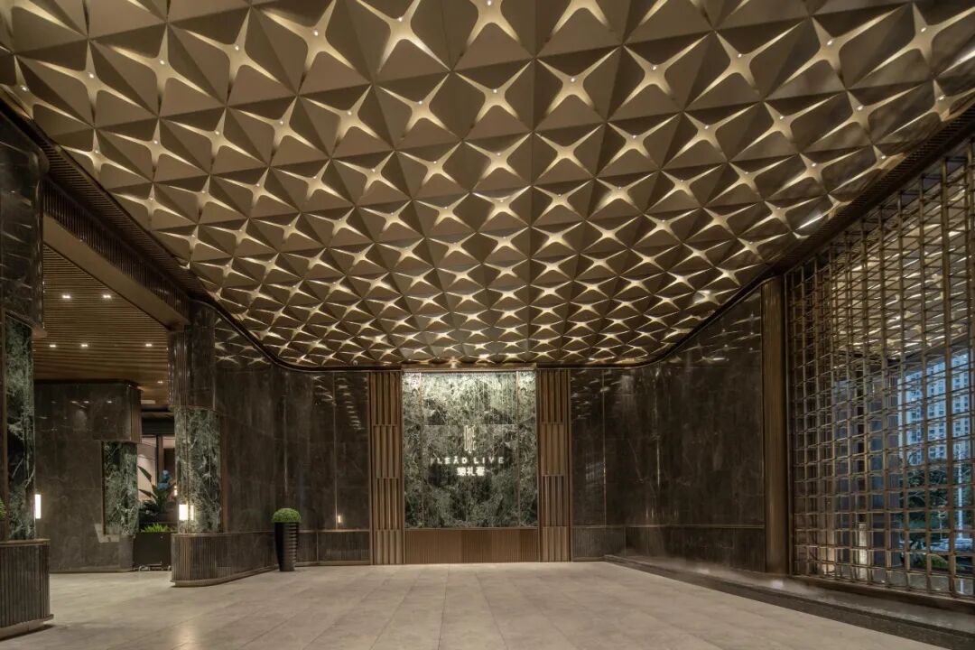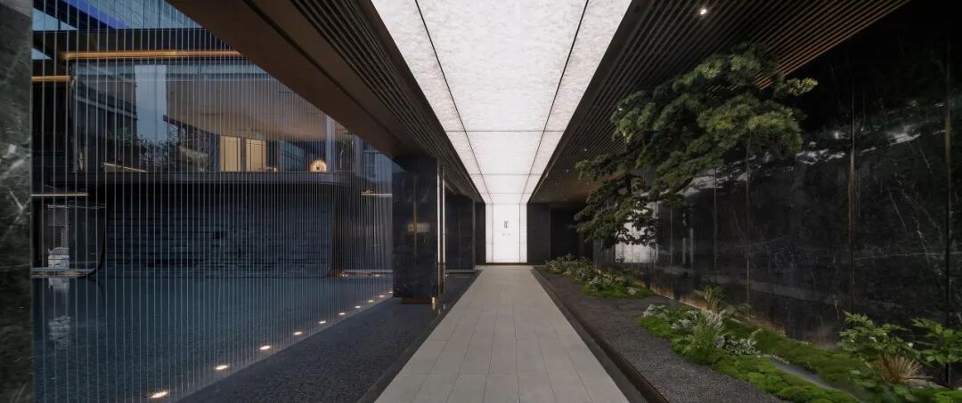 丰富的景观园林体系,也层层递进的拉开了高定的归家礼序。其实从大门开始,首开股份·臻礼著就从外到内渐入佳境的解锁了归家的尊崇和仪式感。宽约55米的酒店式归家大门,配搭约606片菱形星空顶,展现出非凡的气度。大门两侧的迎宾柱廊,精选温德姆灰石材与普拉达绿奢石,以错落的纹理写意,在涌泉跌水的点缀下,展现出星级酒店的归家尊崇。正面景墙通过跌水瀑布与阿尔卑斯黑毛石结合,定制出高山流水的高阶美境,城市的喧嚣在此切割,美好归家的第一场域就此铺陈。穿过星级门庭,进入沉浸式度假园林,你可以在双螺旋游园归家的动线中,享受景观与自然的美好交互,石与树,水与院,光与影,高定的归家礼序,让你能真正感受到用生活的方式度假,用度假的方式居住。单元入户门厅也尽显高奢,黄金海岸线弧面设计,香槟色铝板、星空顶、灰色石材,整体呈现出典雅高贵的格调。地下光厅也有不输一楼门厅的品质感。劳斯莱斯同款星空顶、透光云石片、雪山蓝岩板背景墙和氛围灯光的组合,尽显海派奢华。
