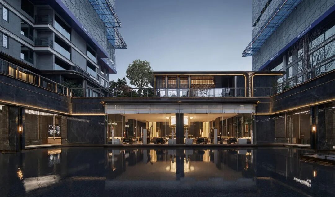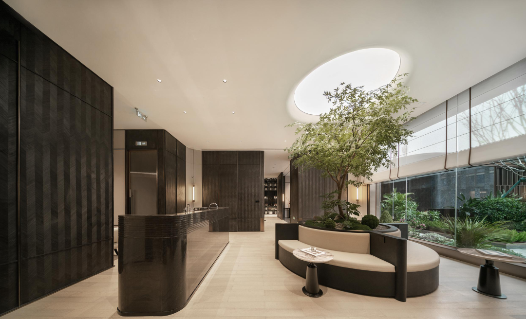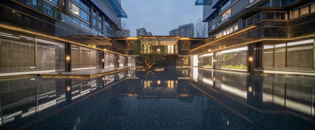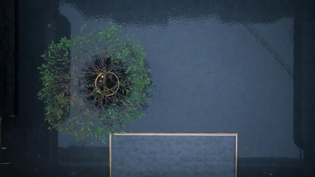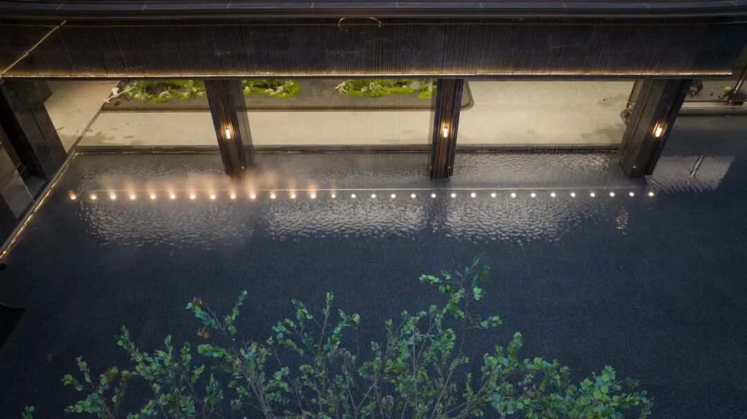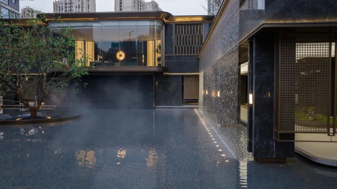 超500㎡浮岛会所被超600㎡的水院包裹,犹如一座隐逸的浮岛在水中卓然而立,让建筑和艺术之美直抵人心。浮岛会所采用了全落地观景窗设计,实现了空间美学、生活方式、圈层社交全方位延伸。围绕会所形成的两大浮岛景观,更成为了水域之上的艺术表达。超600㎡镜水水面,营造出四时皆景的温润雅奢。流动的瀑帘倾泻而下,演绎出流线和动感之美。一颗水中的乌桕树王与瀑帘辉映,完成了审美的点缀与沉淀,在阳光的照射下展现出“天光云影共徘徊”的唯美意境。