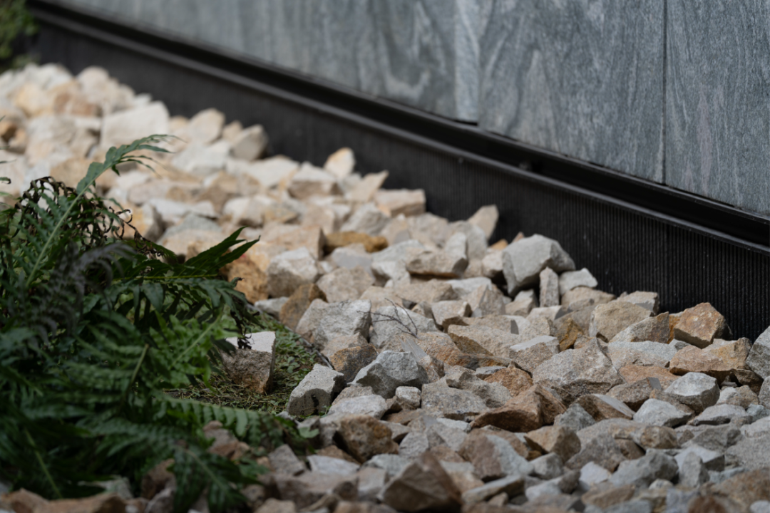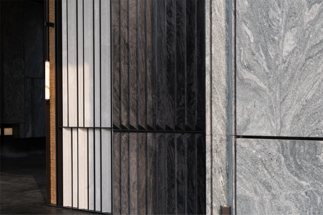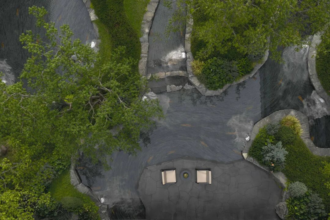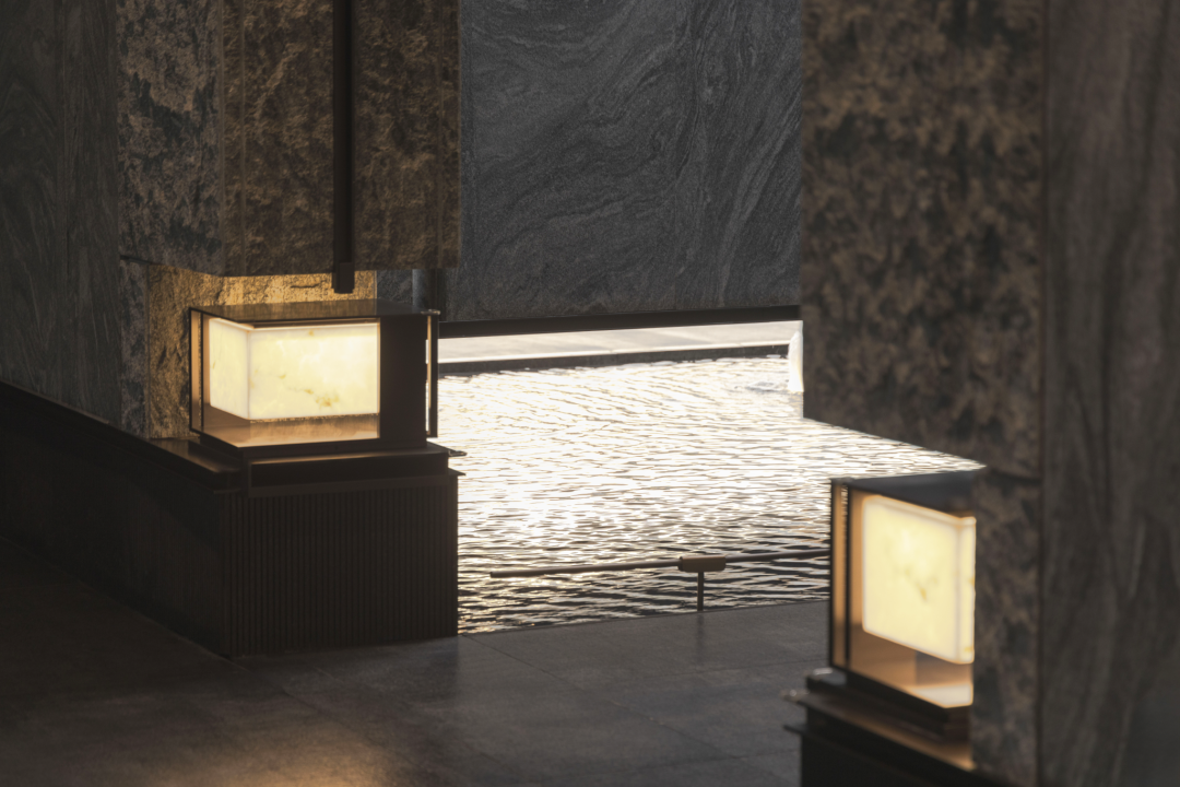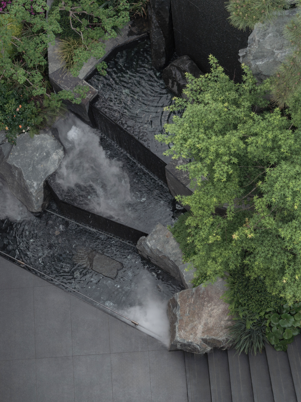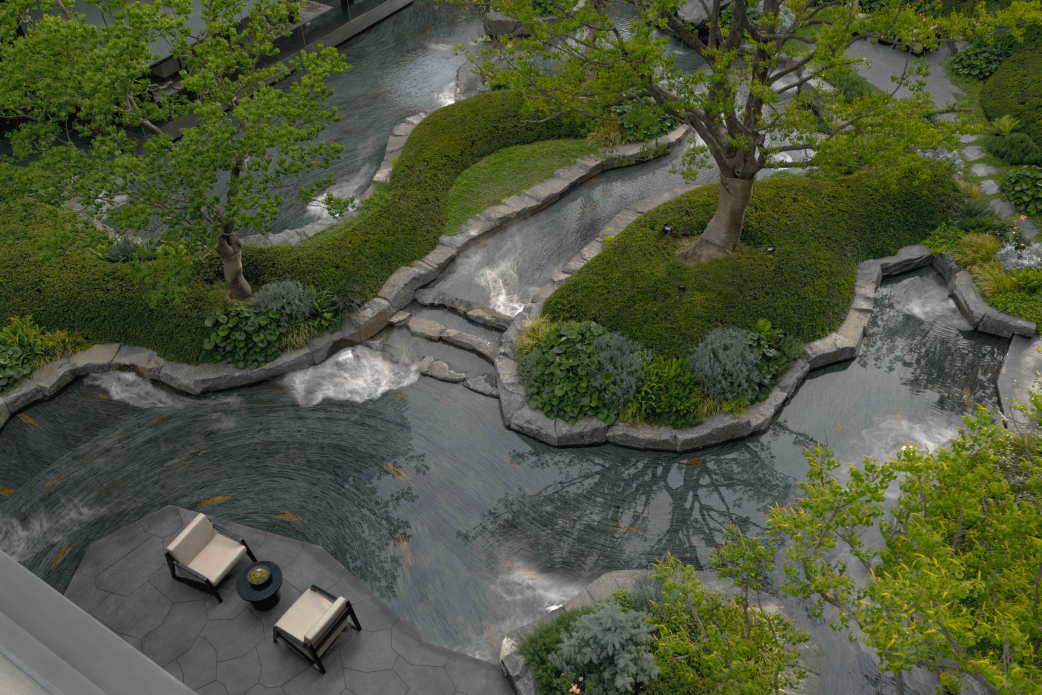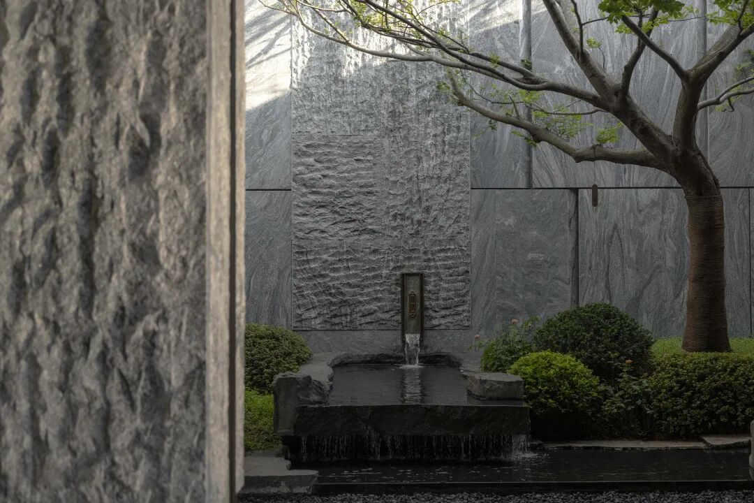 水院池底以薄切石板蜿蜒铺贴,确保拼接弧度的流畅与自然,至臻匠心,可见一斑。