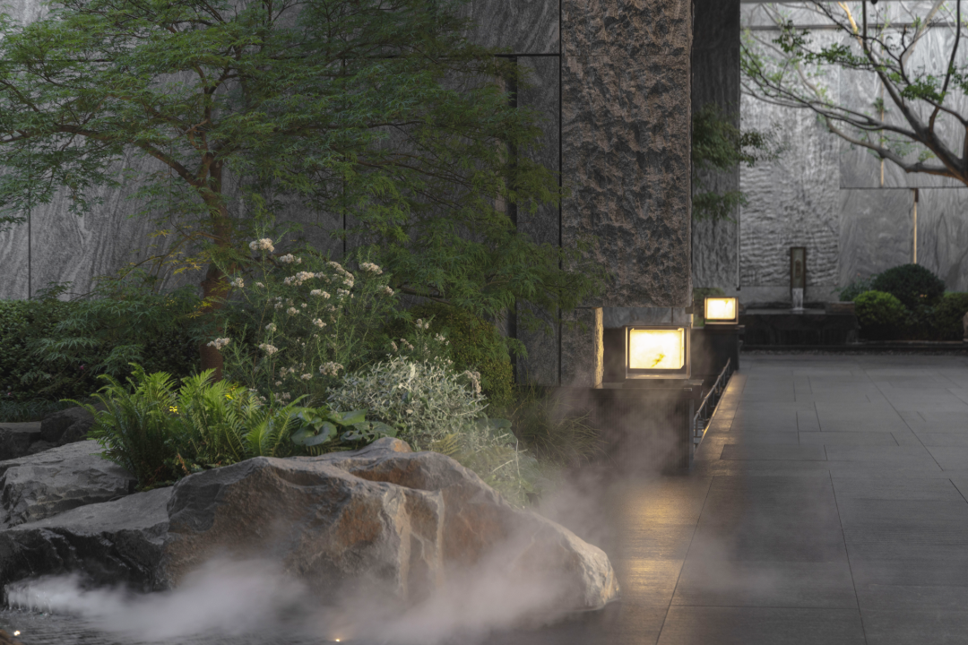 三十七块自然山石面由匠人精心剥离,拼接出古拙照壁,飞瀑与天光洒落,名树与原石组合形成的木石传奇。