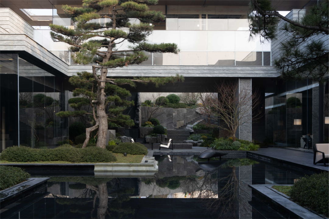 五十五米阔景门厅,南侧第五开间为寻自山林深处的九头迎客黑松,以舒展的姿态恭候迎宾。