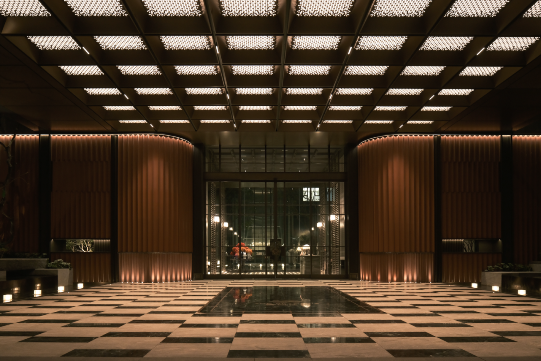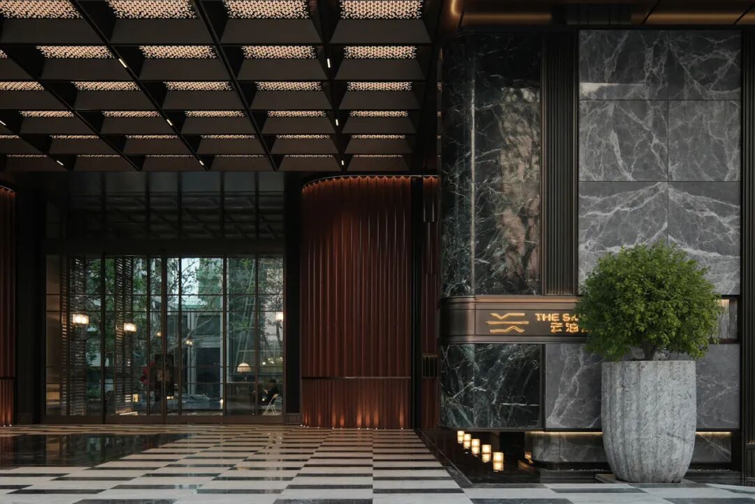 「隐于都会繁华里——都市酒店,静奢入境」 奢阔的“酒店式落客”,是尊贵含蓄与艺术内敛的并重。归家,如入仪式之境。 重门藻井,演绎门庭的礼序。现代精致的设计与材质的搭配,是时尚与复古在此交汇;空间与色彩的流转,是贵气与自然在此交融。横向延展的顶奢红立面,点缀人文色调,让在地艺术与现代贵奢碰撞。绵延的节奏与秩序里,艺术与人文的氛围感,在这一刻得以表达。 The luxurious "hotel style drop off" is a combination of nobility and artistic restraint. Returning home is like entering a ceremonial realm. Heavy door coffered ceiling, interpreting the ceremonial sequence of the courtyard. The combination of modern exquisite design and materials is the intersection of fashion and retro; The circulation of space and color is the fusion of nobility and nature here. The horizontally extended top luxury red facade is embellished with humanistic tones, allowing local art to collide with modern luxury. In the continuous rhythm and order, the atmosphere of art and humanities is expressed at this moment.