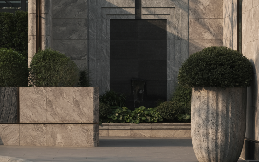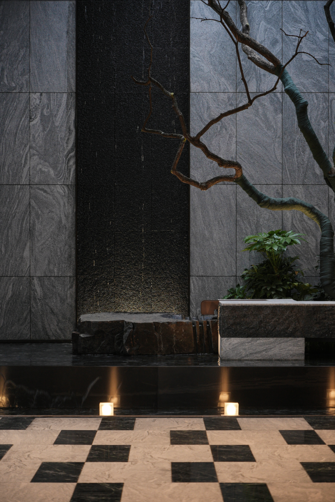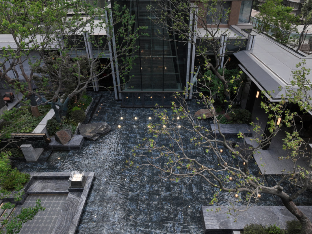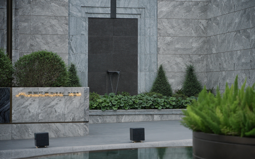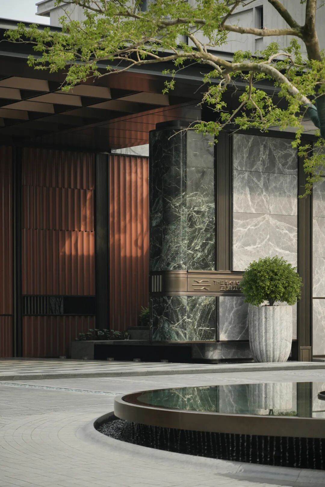 细腻而克制的肌理,像是精神世界的写意表达。方寸之间,精致的叠水空间从有界延展出无界,水流律动、立面延伸、树木生长,它们在动态的平衡中构筑了一幅精美的艺术风情画,又在流动的空间里,让归家的人忘却时间,放下一切喧嚣,在仪式和静谧中,体悟自然与生命的流动,感受此刻的奢雅与从容。 The delicate and restrained texture is like a freehand expression of the spiritual world. In every inch, the exquisite stacked water space extends from the bounded to the unbounded, with the rhythm of water flow, the extension of facades, and the growth of trees. They construct a beautiful artistic style painting in dynamic balance, and in the flowing space, make people returning home forget time, let go of all noise, and experience the flow of nature and life in ceremony and tranquility, feeling the luxury and calmness of this moment.