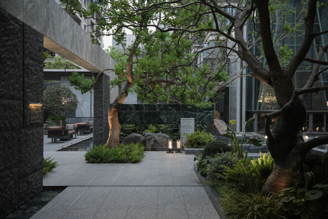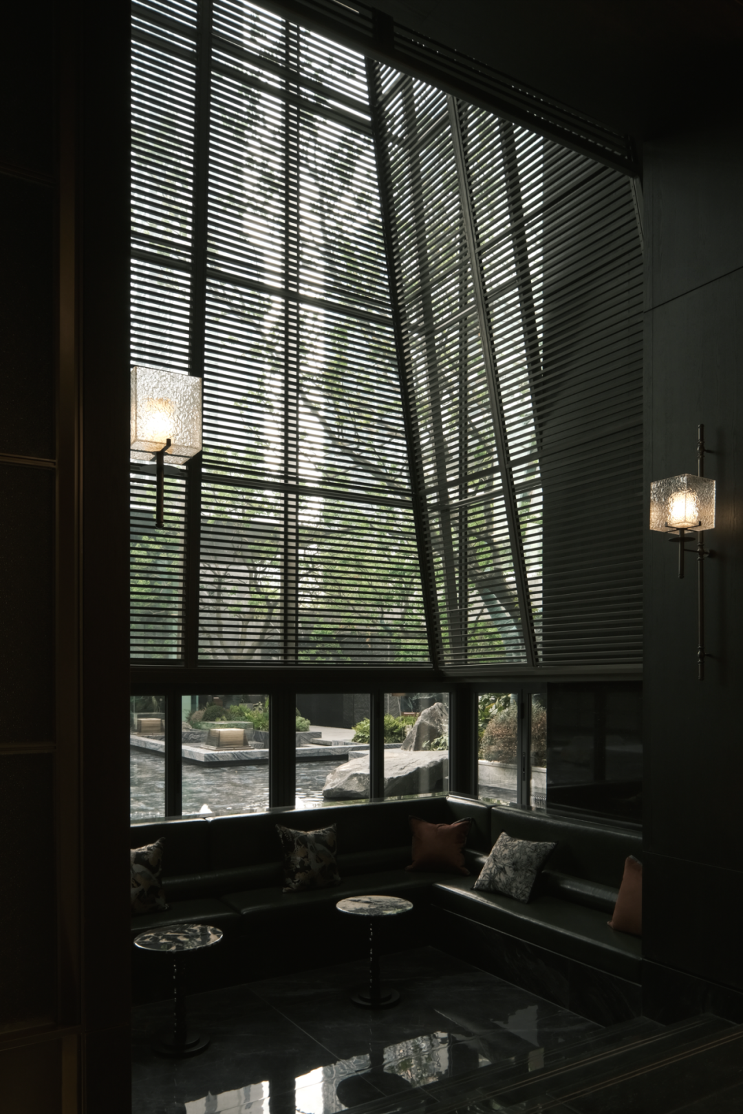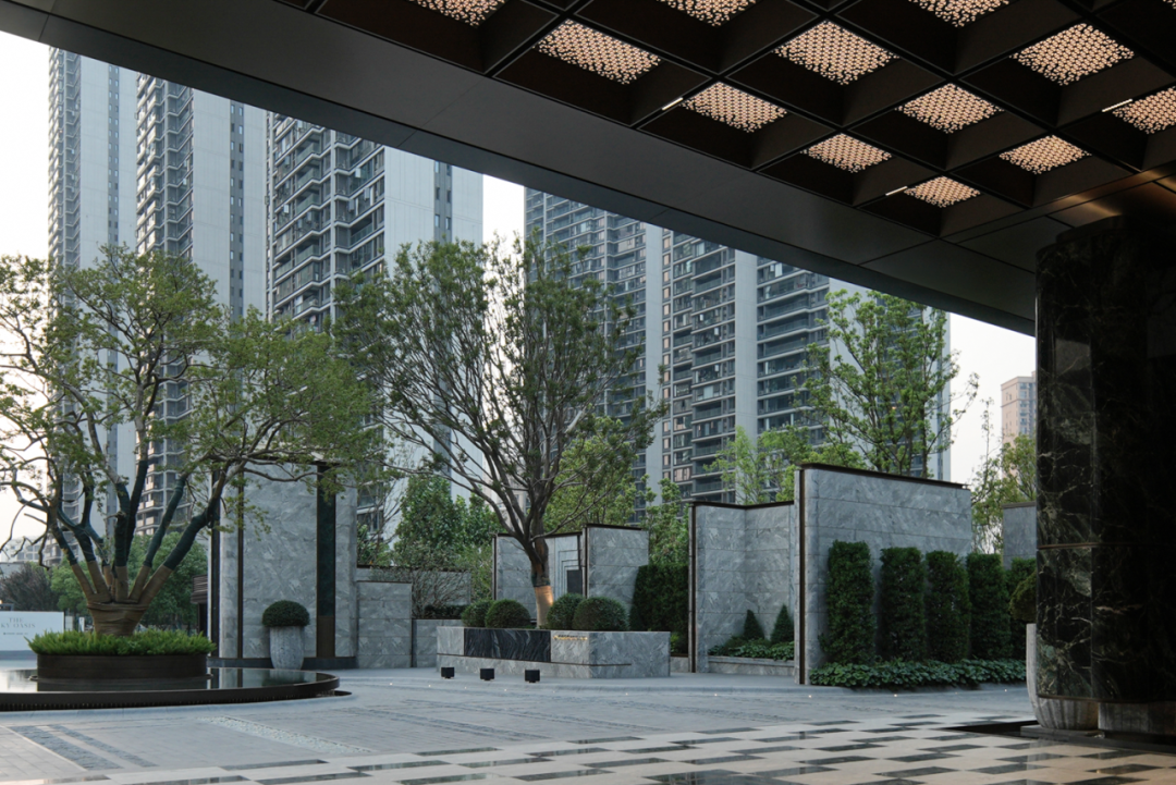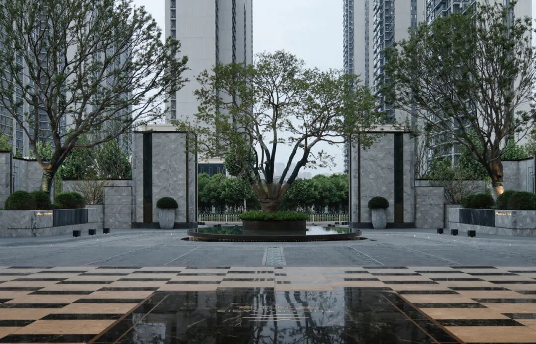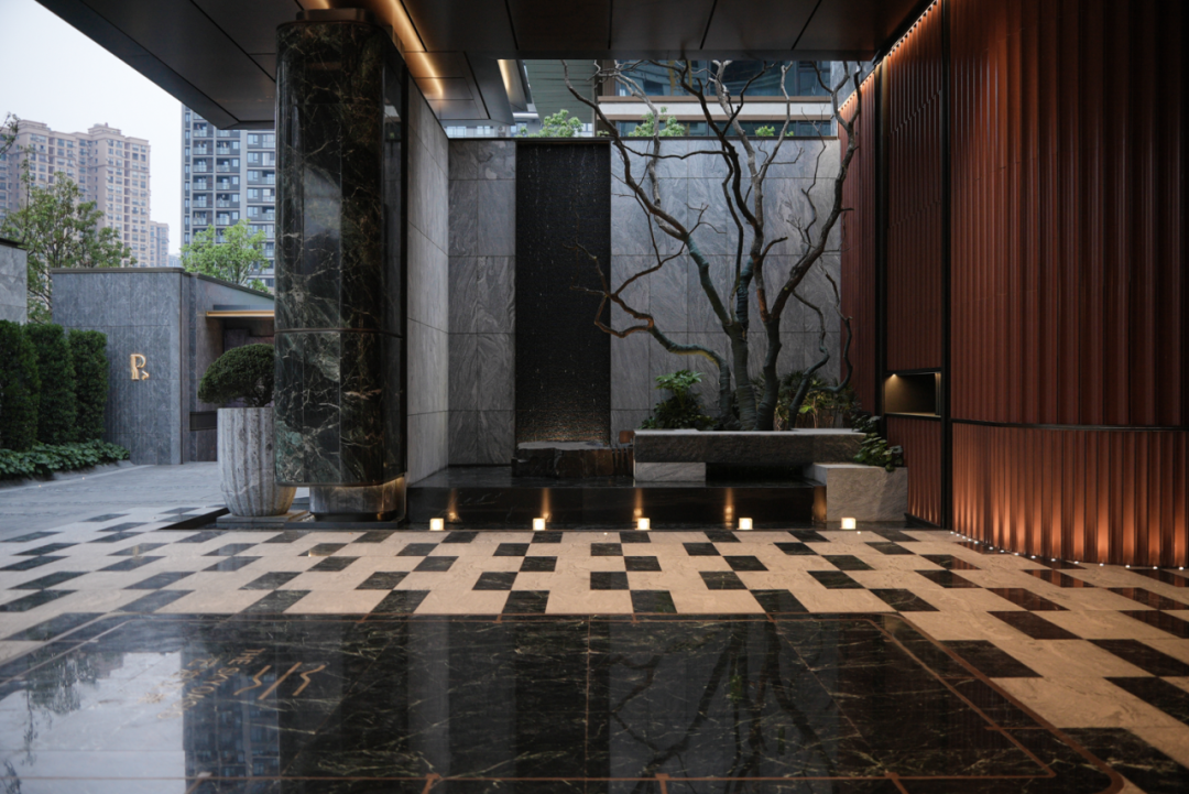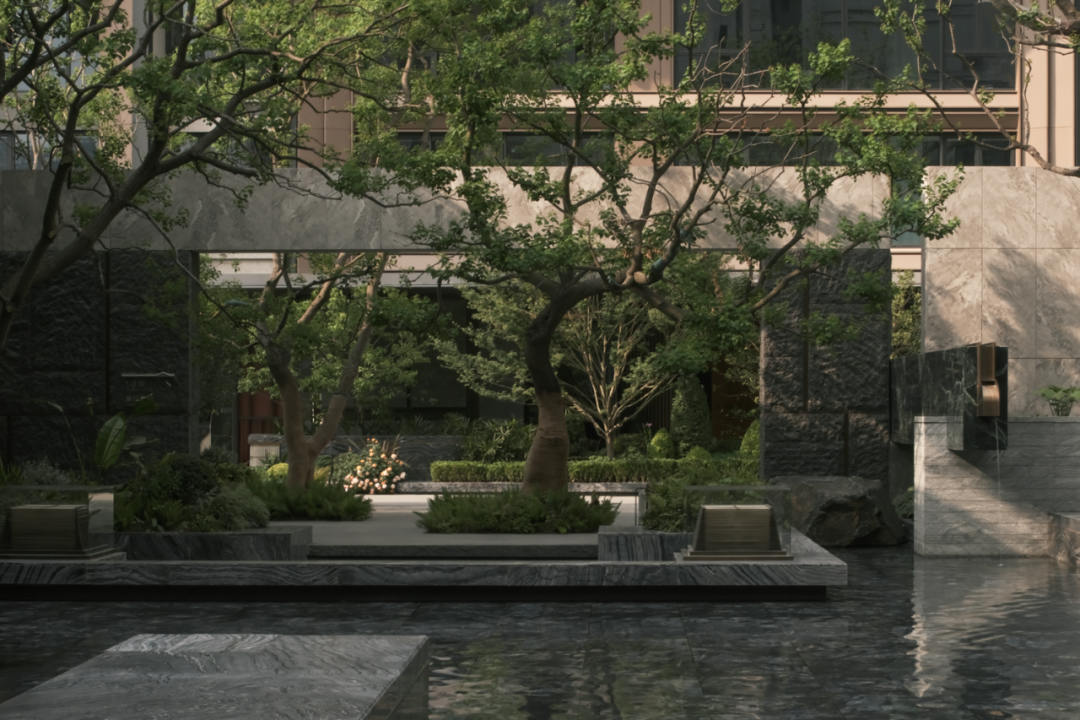 细腻而克制的肌理,像是精神世界的写意表达。方寸之间,精致的叠水空间从有界延展出无界,水流律动、立面延伸、树木生长,它们在动态的平衡中构筑了一幅精美的艺术风情画,又在流动的空间里,让归家的人忘却时间,放下一切喧嚣,在仪式和静谧中,体悟自然与生命的流动,感受此刻的奢雅与从容。 The delicate and restrained texture is like a freehand expression of the spiritual world. In every inch, the exquisite stacked water space extends from the bounded to the unbounded, with the rhythm of water flow, the extension of facades, and the growth of trees. They construct a beautiful artistic style painting in dynamic balance, and in the flowing space, make people returning home forget time, let go of all noise, and experience the flow of nature and life in ceremony and tranquility, feeling the luxury and calmness of this moment.