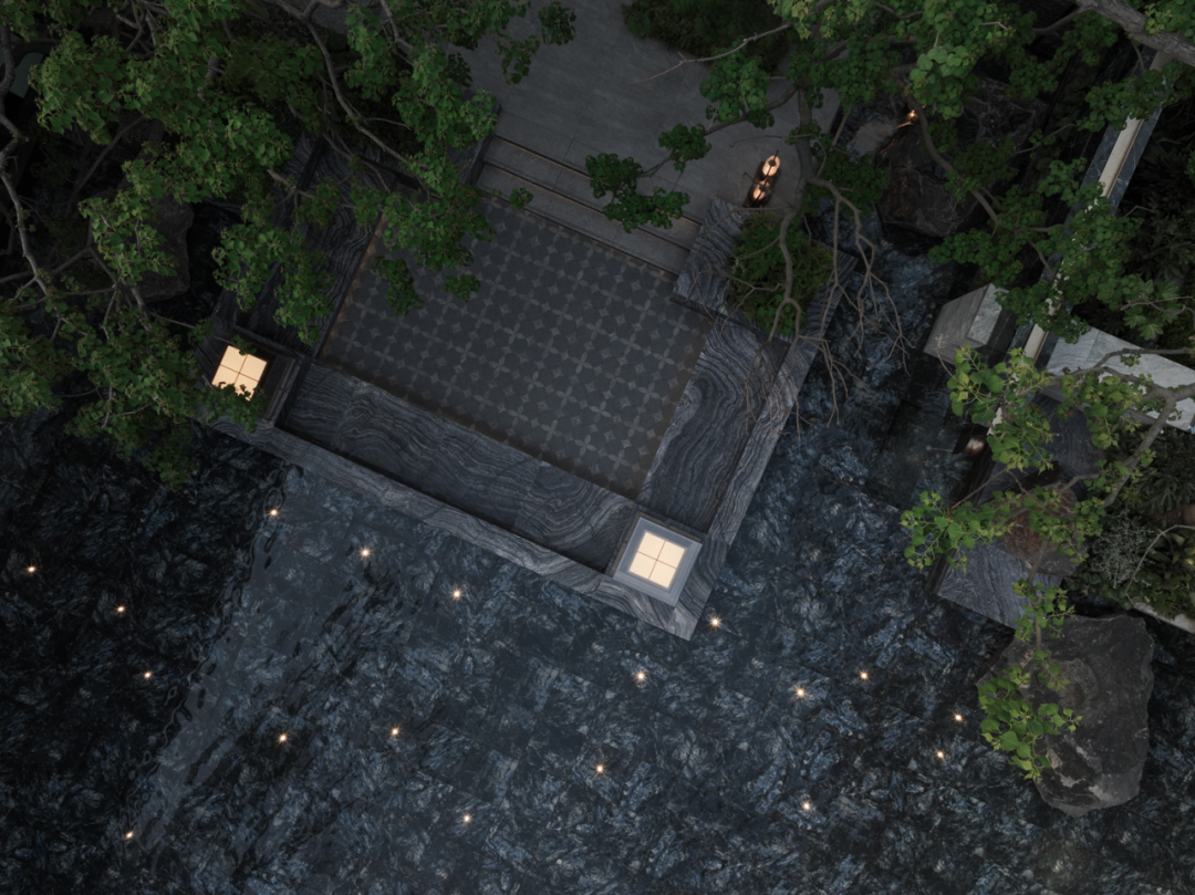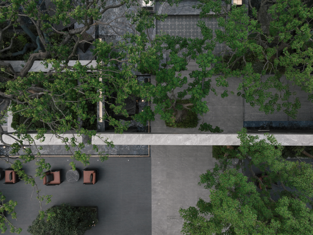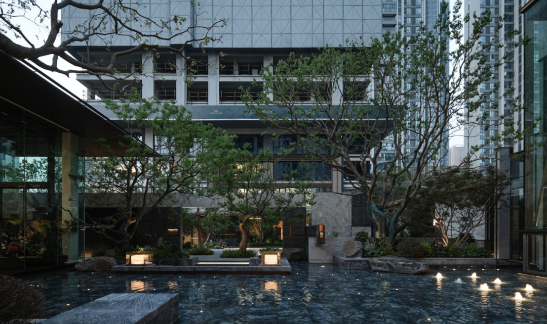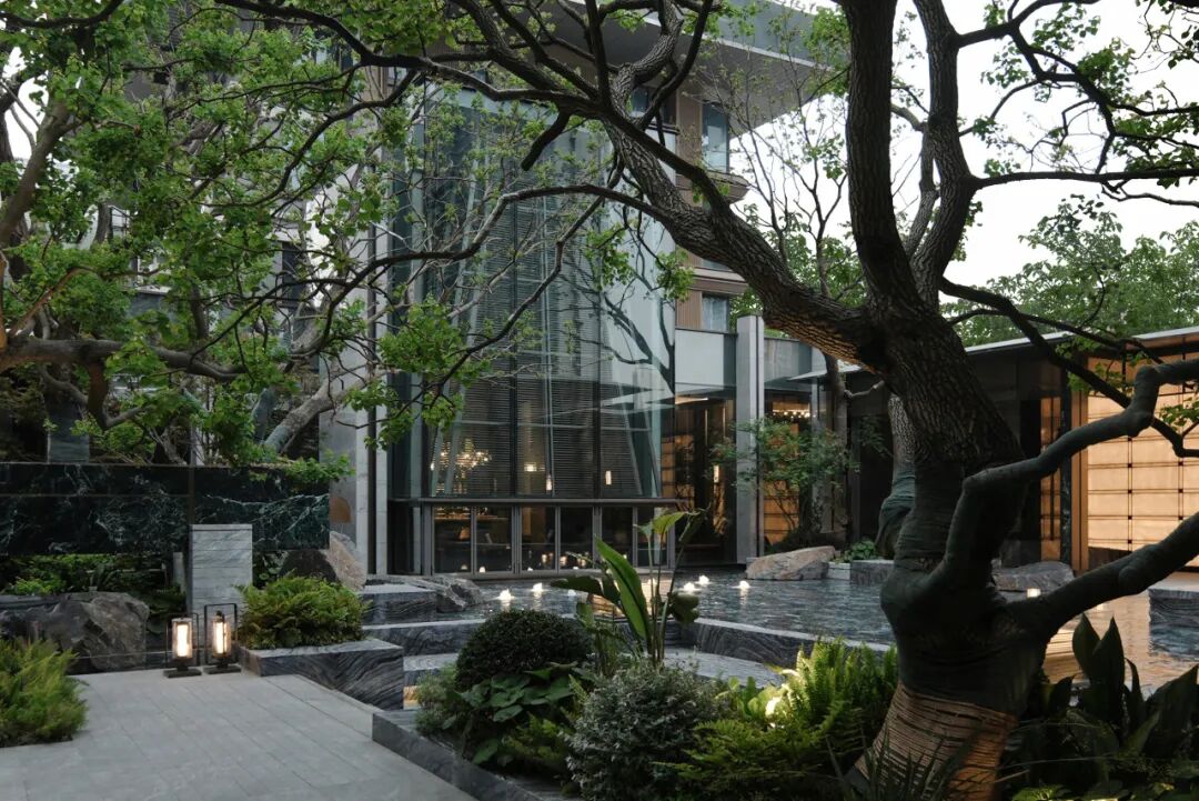 当繁星坠落水底,当天光云影与绿意徘徊,林木掩映下的静谧,居住场景的定制感,在绿意流动中氛围渐浓。庭院水境的静谧雅奢,藏在空间、光影和动静的节奏里,也藏在空间气韵流转的淡然与气度里。 When the stars fall to the bottom of the water, the light, clouds, shadows, and greenery linger on that day. The tranquility under the shade of trees and the customized feeling of the living scene gradually intensify in the flow of greenery. The tranquility and luxury of the courtyard's water environment are hidden in the rhythm of space, light and shadow, and movement, as well as in the calm and graceful flow of spatial charm.