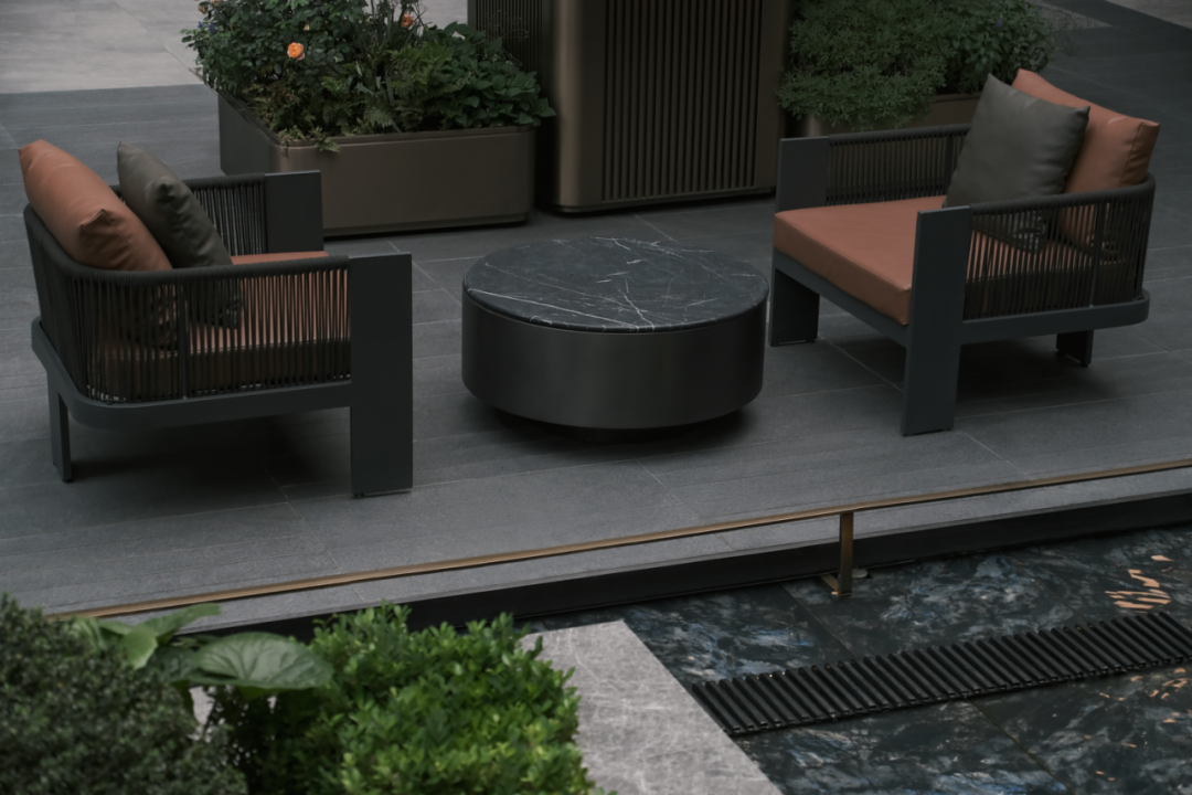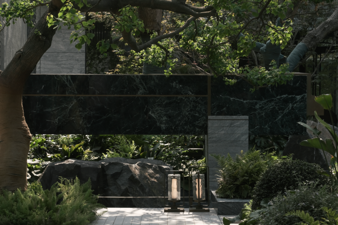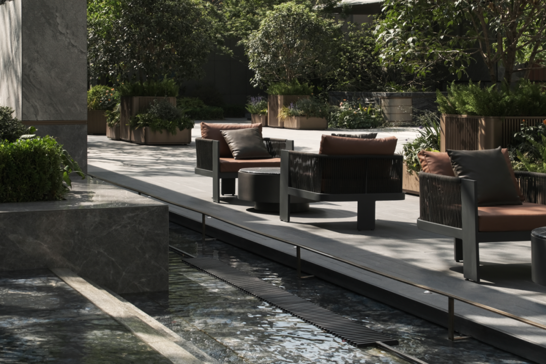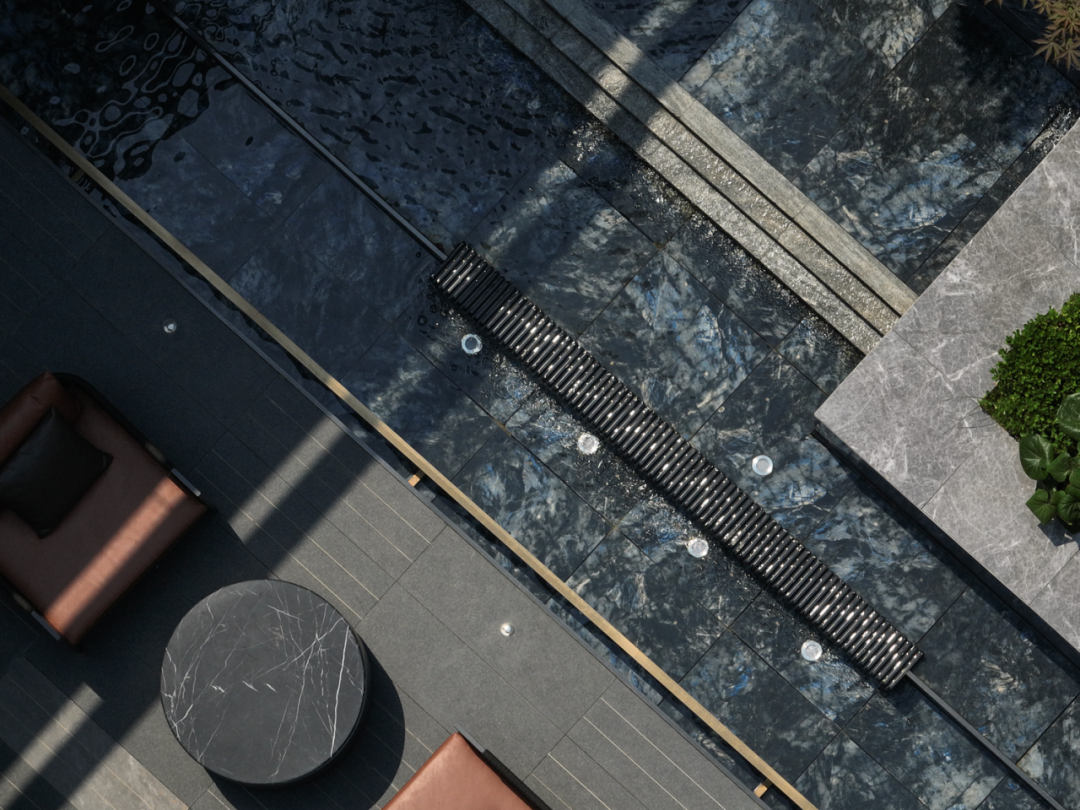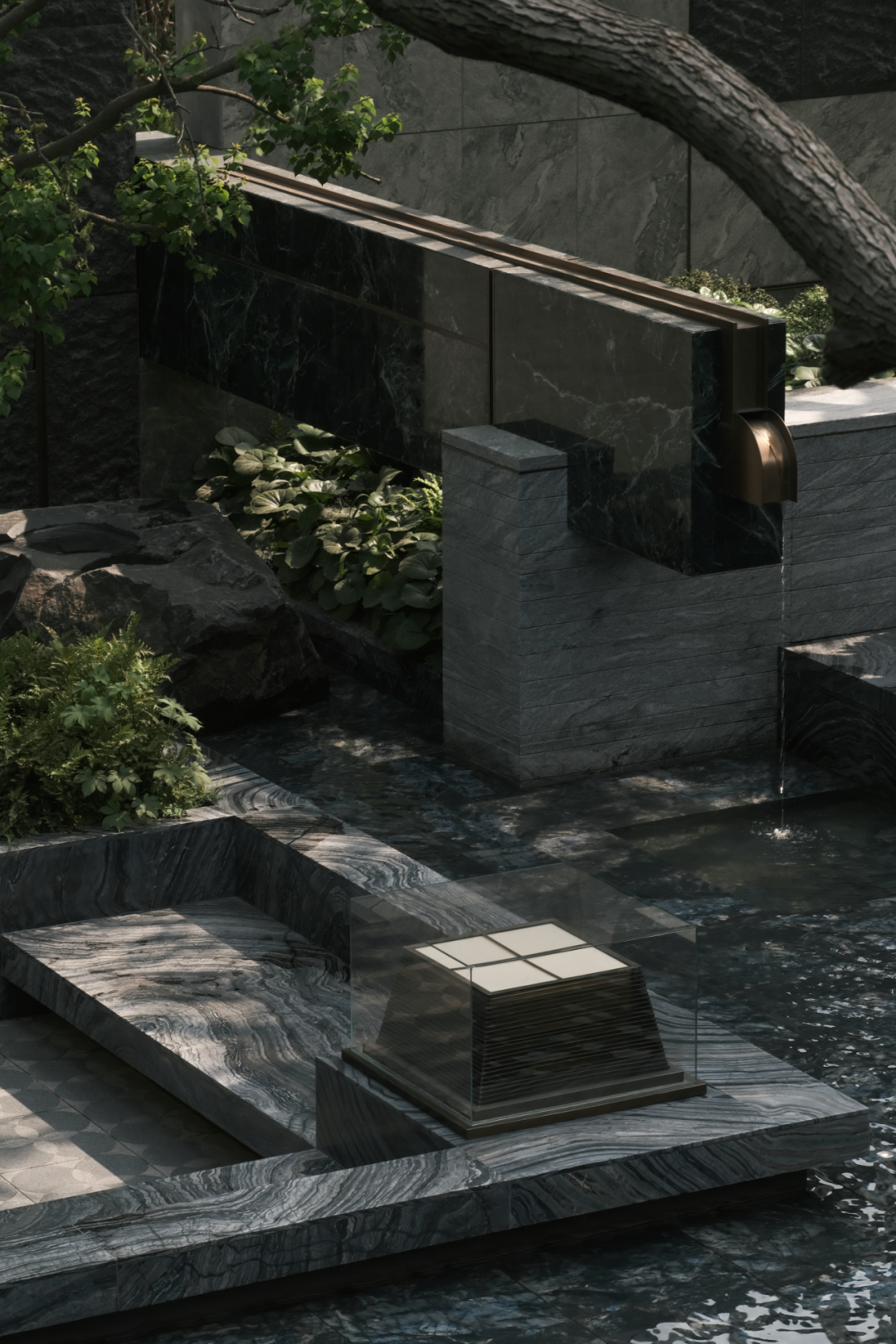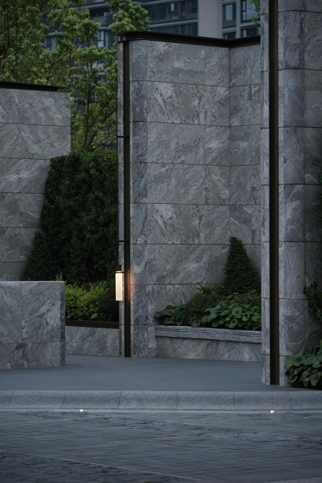 生活的每一个角落里,都流淌着优雅与品味,也彰显着精奢与时尚的细节极致追求。 铺装的沉稳,以古铜色简约线条点缀奢华;座椅的时尚摩登,以温润大理石相衬显贵;那从绿奢中穿石而过的山涧,仿若凿石飞瀑,飞湍而下,将设计师极致细节的设计与巧思,折叠在那泠泠作响的流水声里。 奢石丰富的纹理与古铜精致细节的碰撞,在跌瀑动静之间,不仅是空间的平衡,也是静谧水院的吐纳自如。树影婆娑,林下呢喃,生活的每一处细节,也都在此以慰藉、以安放。 In every corner of life, elegance and taste flow, showcasing the ultimate pursuit of luxury and fashion details. The stable paving is adorned with luxurious antique copper simple lines; The fashionable and modern seats are complemented by warm marble to show off their luxury; The mountain stream that passes through the green luxury, like a carved stone waterfall, cascades down, folding the designer's ultimate details and ingenuity into the sound of the flowing water. The collision between the rich texture of luxury stones and the exquisite details of ancient bronze not only balances the space between the falling waterfall and the movement, but also allows for the tranquil water courtyard to breathe freely. The shadows of the trees sway, murmuring under the forest, and every detail of life is comforted and placed here.