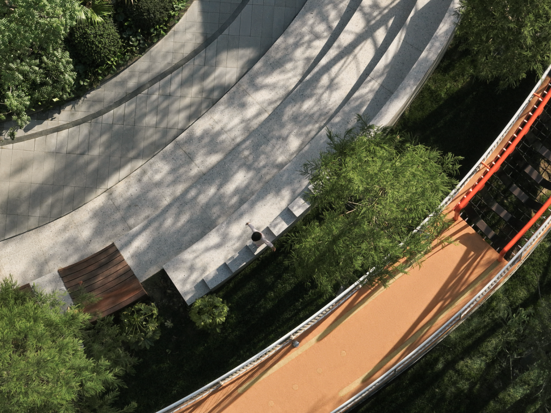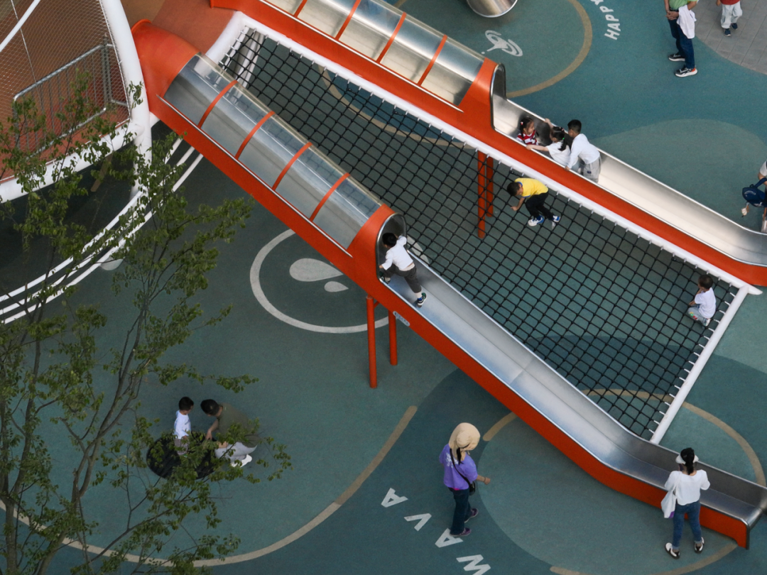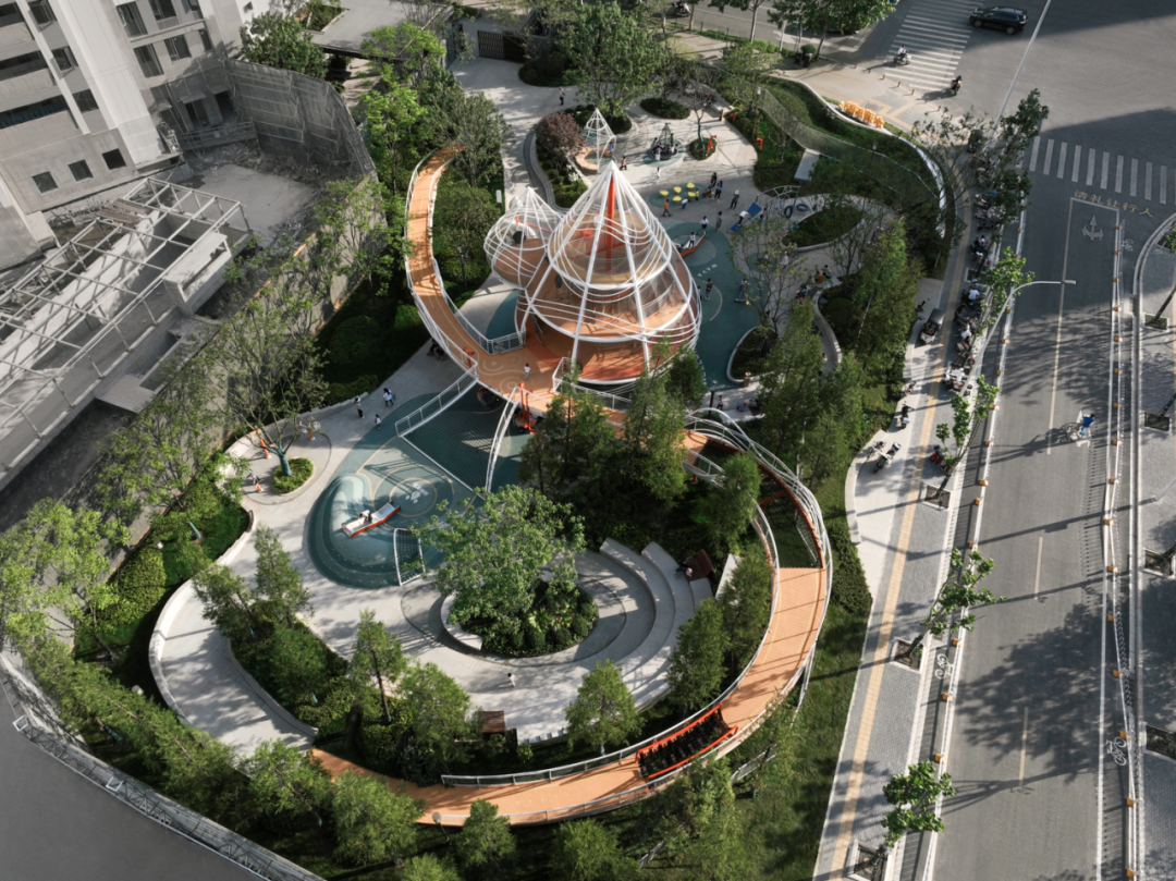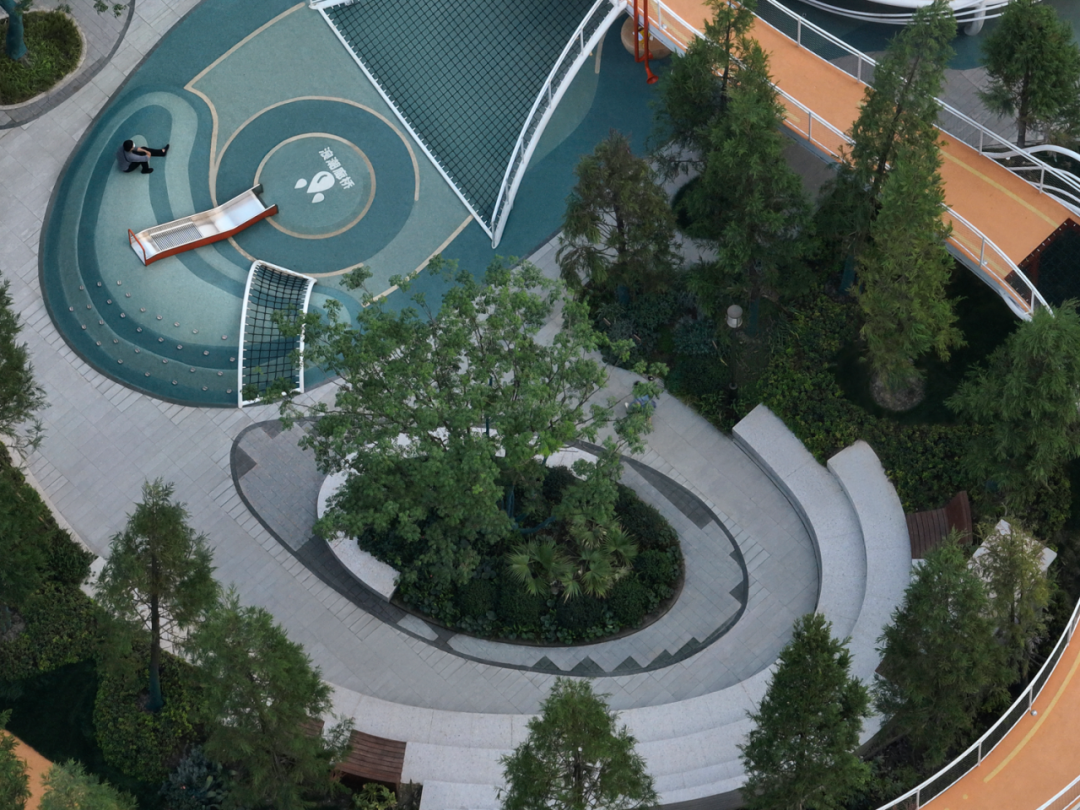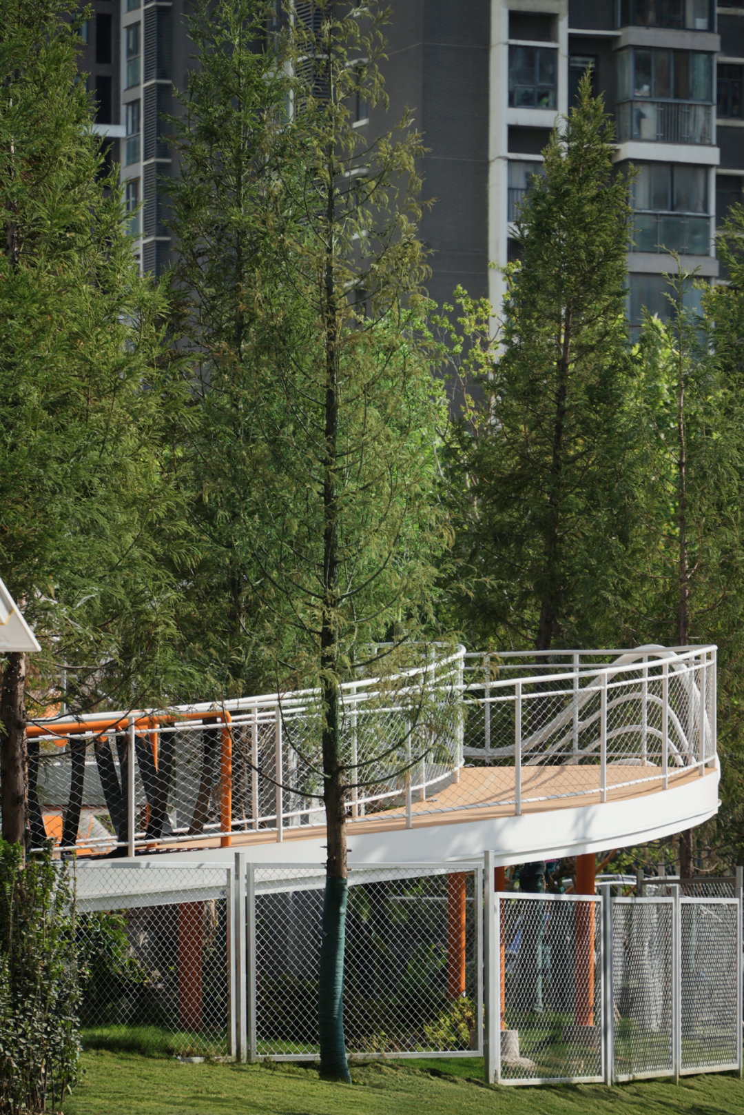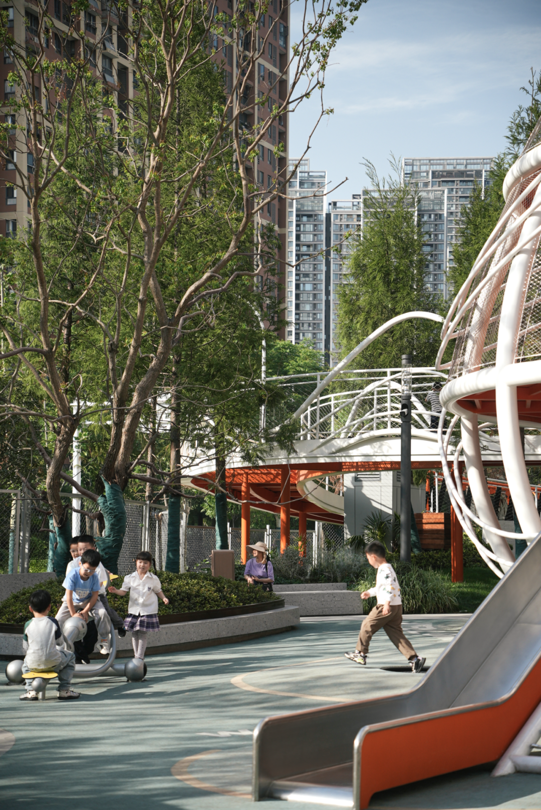 艺术为表达,时尚为语言,自然的游乐场,设计仿若水滴掉落林间激起巨大的浪花。流线景墙,艺术化铺装,结合摩登感的细节元素,设计在流动的层层浪潮,架起一座连接艺术与时尚、自然与玩乐的桥梁。 场地中心以15m超高大水滴构筑设计视觉焦点,打造多层次、多空间游玩体验,结合各种设施,为孩子和父母都营造一片嗨玩天地。 Art is expression, fashion is language, a natural playground, designed like water droplets falling into the forest and creating huge waves. Streamlined landscape wall, artistic paving, combined with modern details, designed in the flowing layers of waves, building a bridge connecting art and fashion, nature and play. The center of the venue is designed with a 15m tall water droplet as the visual focal point, creating a multi-level and multi space play experience. Combined with various facilities, it creates a fun and playful world for both children and parents.